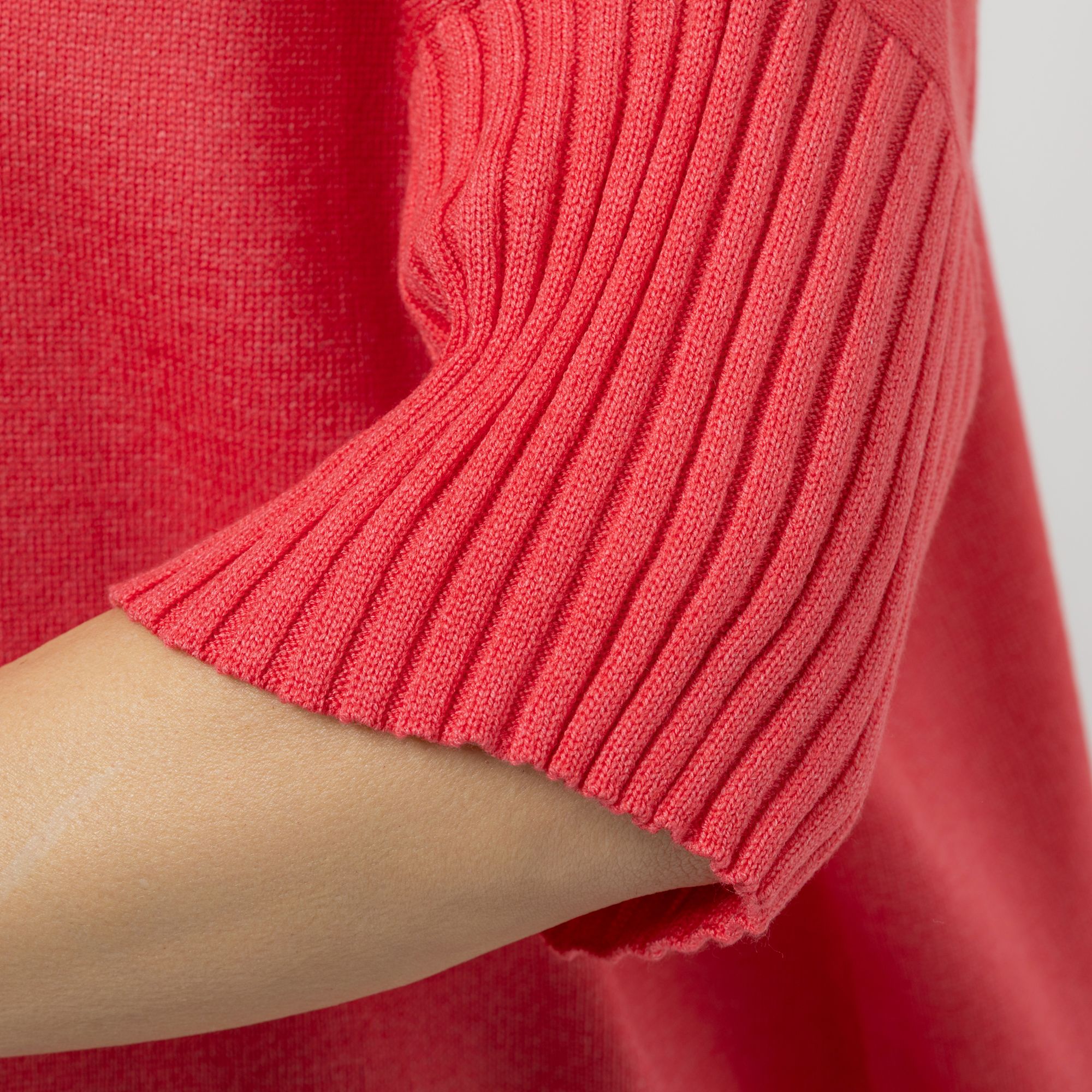 • Stehkragen und Ärmel in Rippenstrick