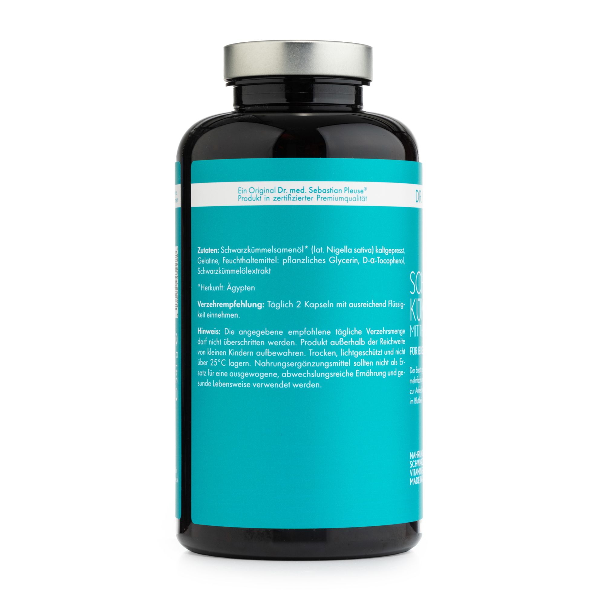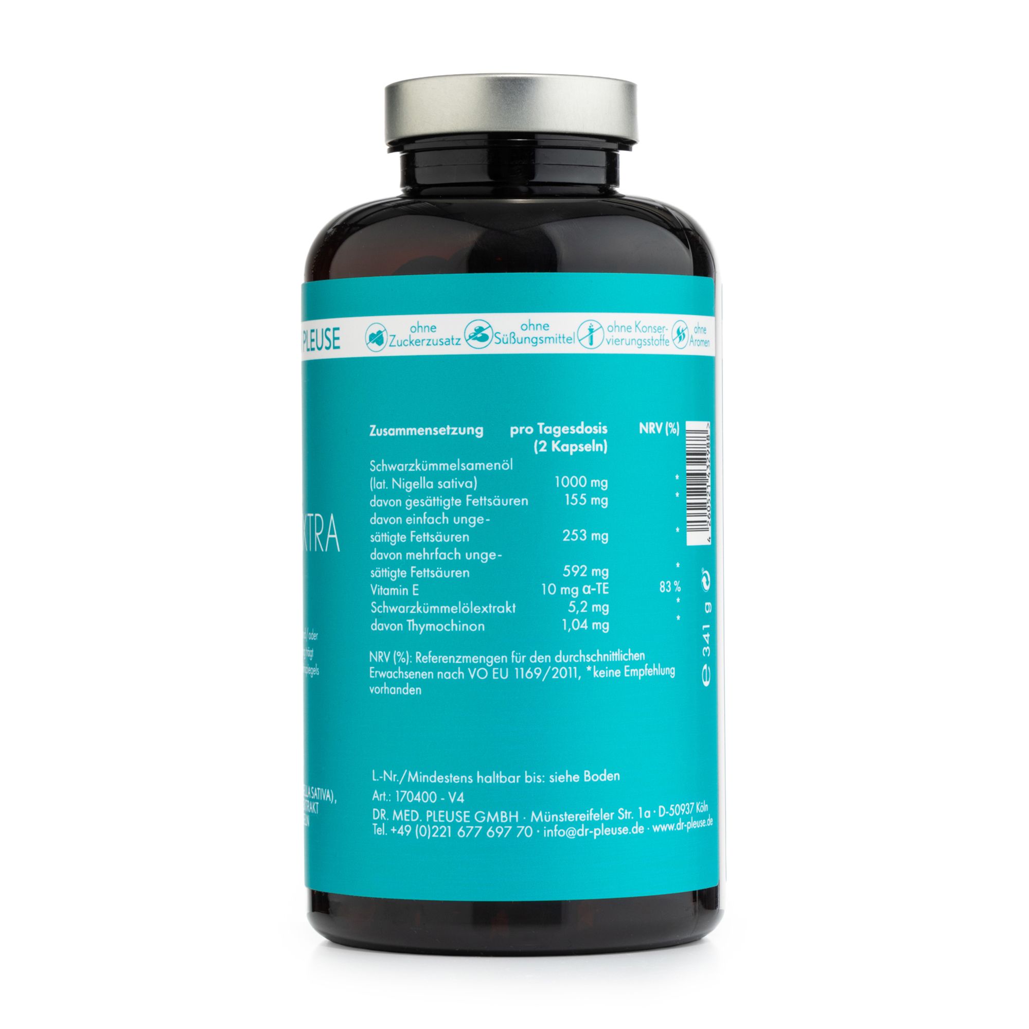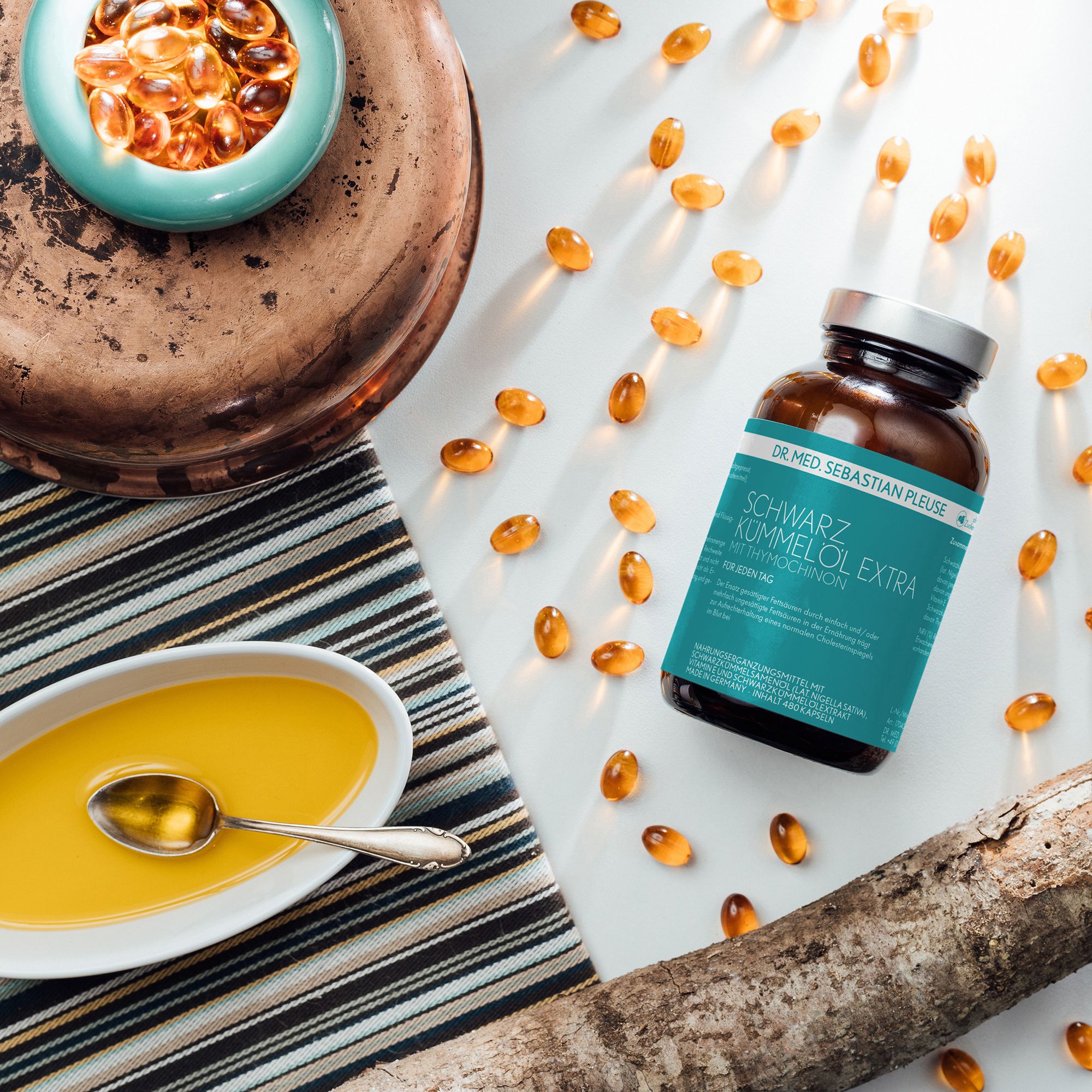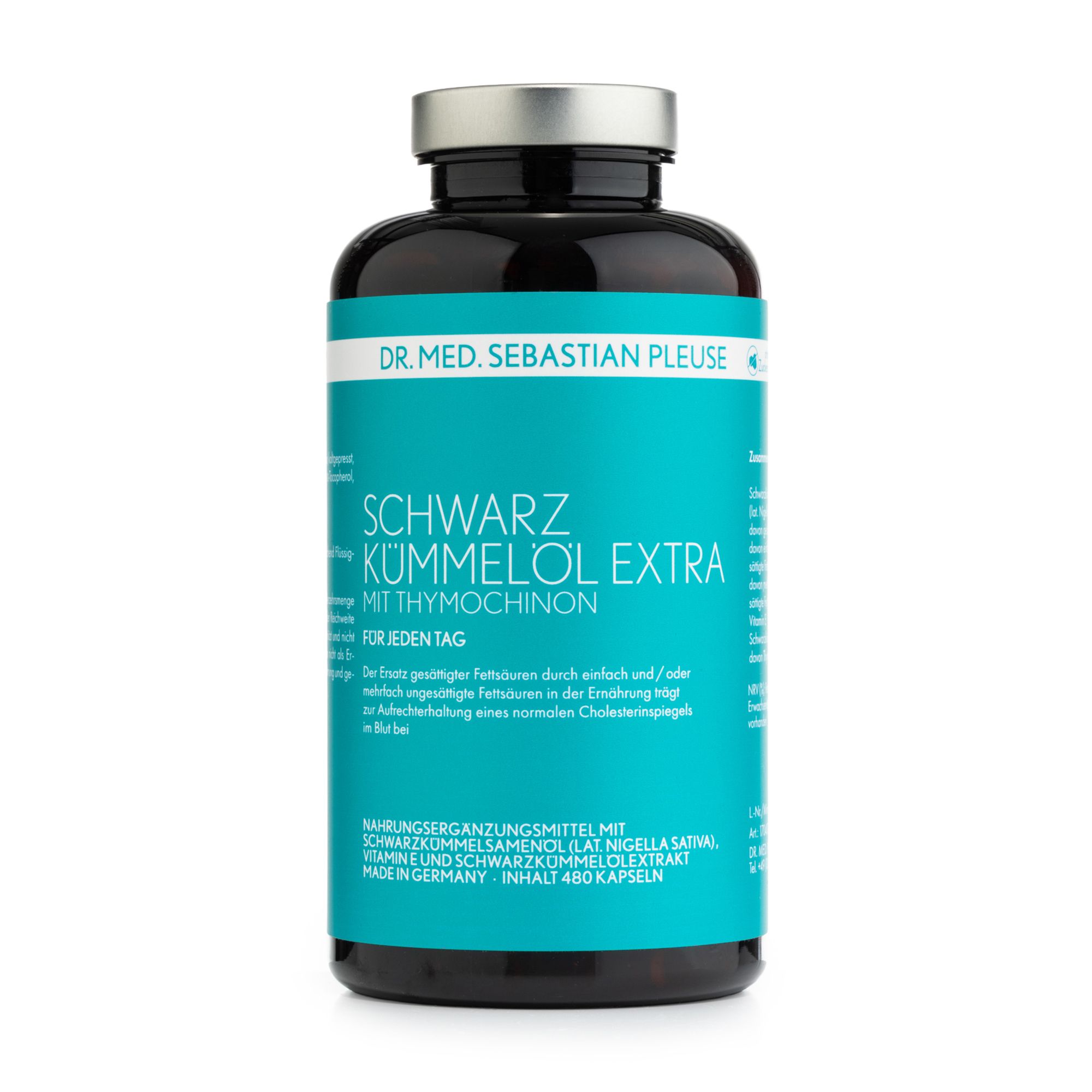 Schwarzkümmelöl gilt als eines der wertvollsten Öle der Welt und ist in vielen Kulturen für seine wohltuenden Effekte bekannt. Schon die alten Ägypter wussten um die Kraft dieses besonderen Öls. Schwarzkümmelöl kann äußerlich zur Pflege der Haut angewendet werden, vor allem aber wird es als Nahrungsergänzung geschätzt. Die Schwarzkümmelöl-Kapseln Extra von Dr. med. Sebastian Pleuse gibt es zusätzlich mit Thymochinon in extra langer Reichweite für 240 Tage.