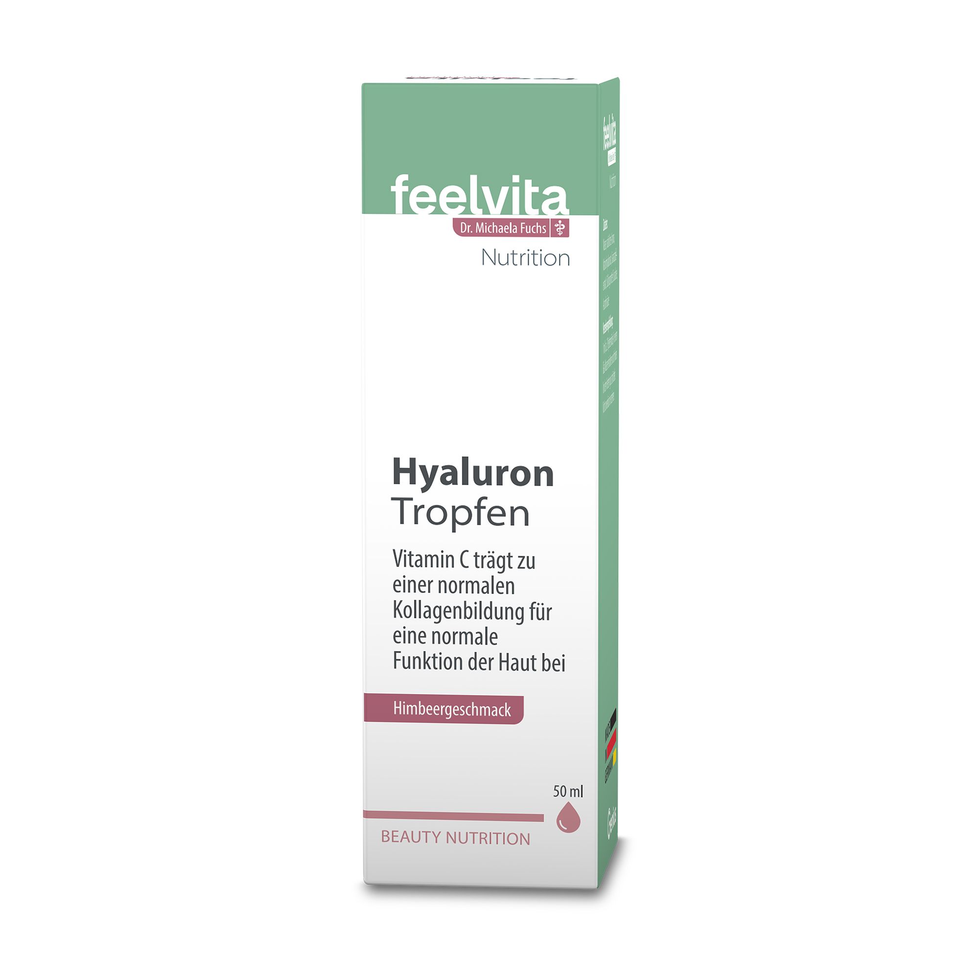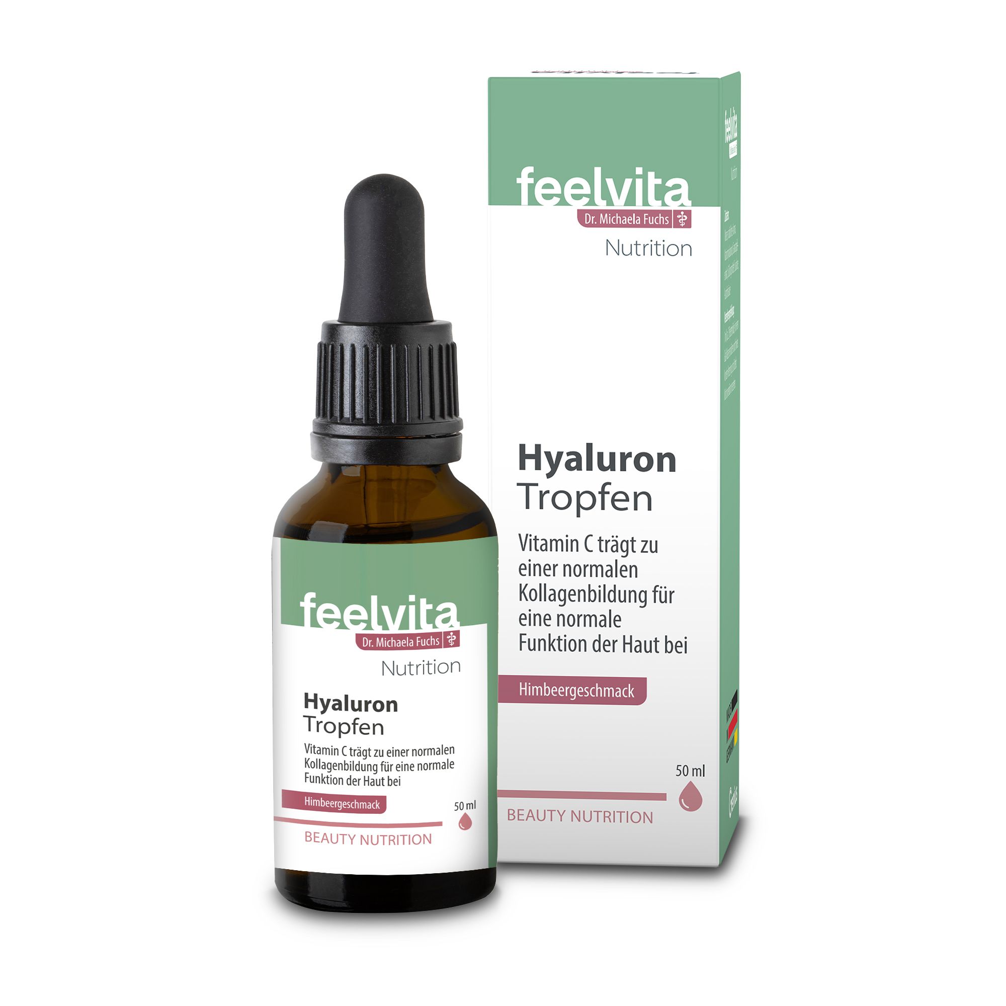 Dr. Michaela Fuchs feelvita Nahrungsergänzungsmittel mit Vitamin C und Hyaluronsäure. Einfach 2 Pipettenhübe pro Tag in dein Wasser einrühren und trinken. Unser Wohlfühl-Tipp im April!