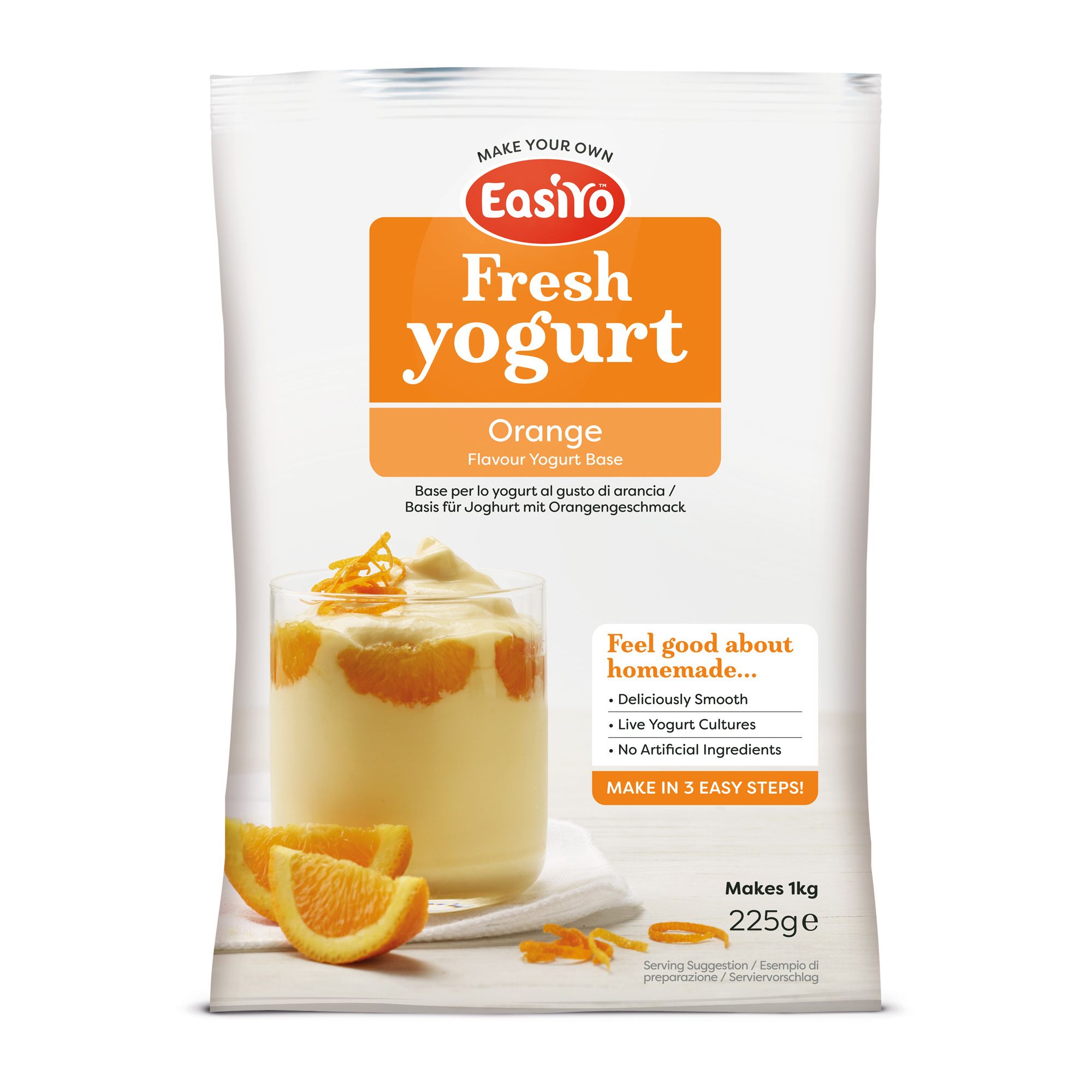 Mit EASIYO kannst du Joghurt ganz einfach selbst machen. Da weißt du, was drin ist – und was nicht. Mit natürlichen Aromen und lebenden Milchkulturen, ohne künstliche Farb- und Konservierungsstoffe. Alles was du brauchst, ist ein Beutel Joghurtpulver, einen Joghurtmaker und Wasser. Fertig ist dein leckerer Kalziumlieferant. Natürlich vegetarisch und glutenfrei.