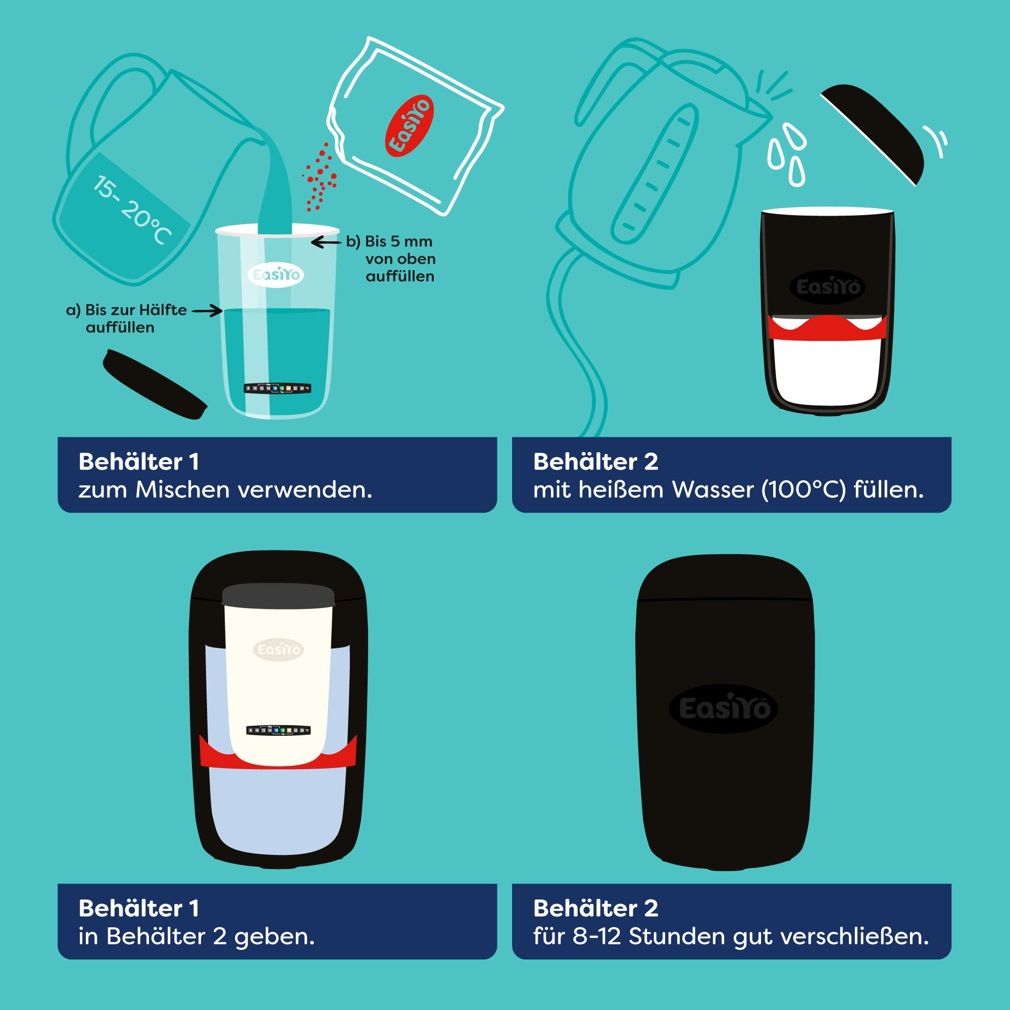 - für die Zubereitung des Joghurts benötigst du einen EASIYO Joghurtbereiter und Behälter (z. B. Artikelnummer 884396)