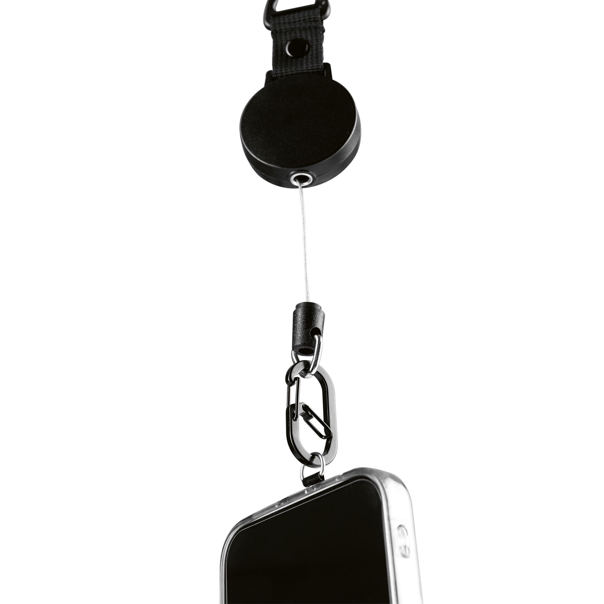- Sicherungsplatte zwischen Hülle und Smartphone klemmen und beliebig mit dem Karabiner befestigen