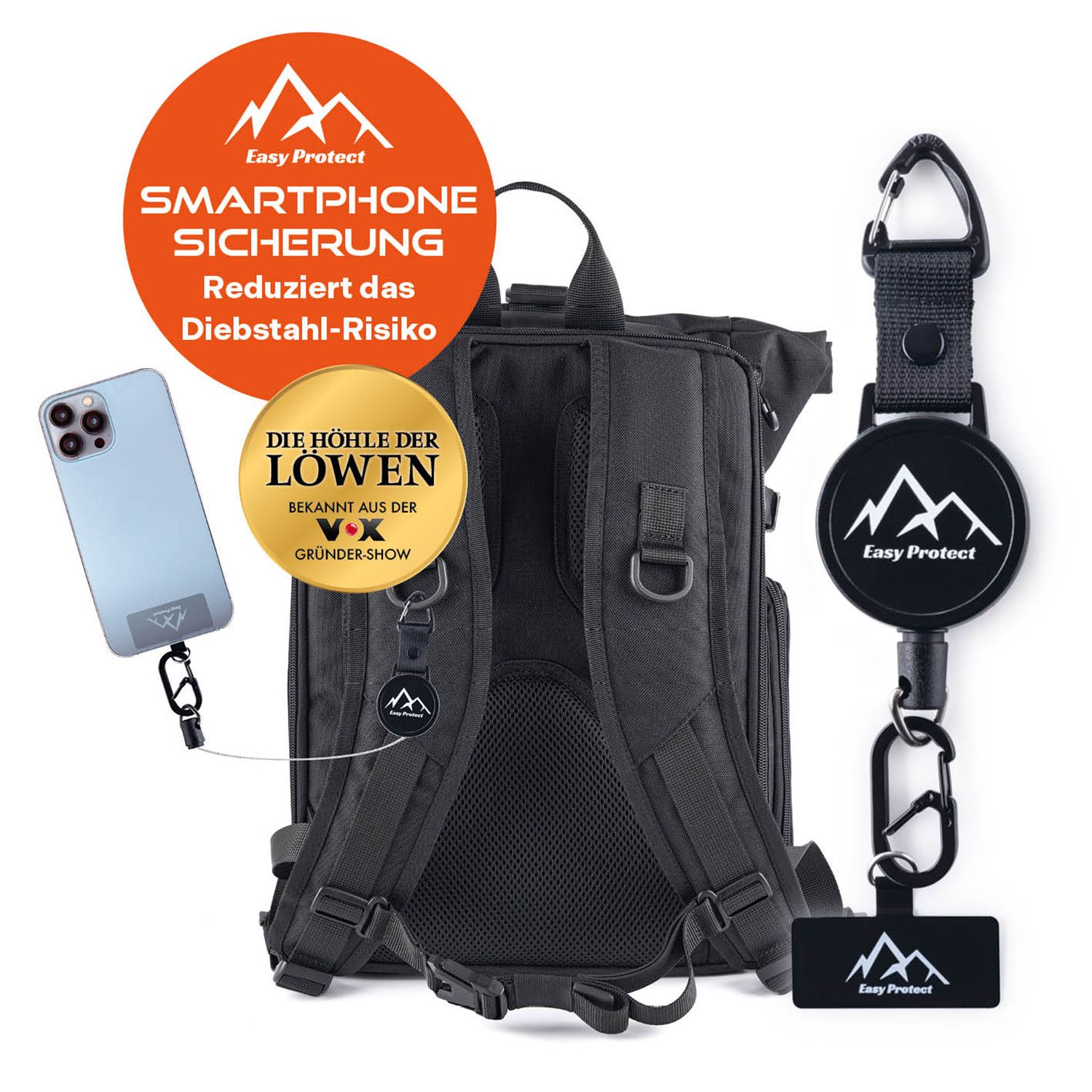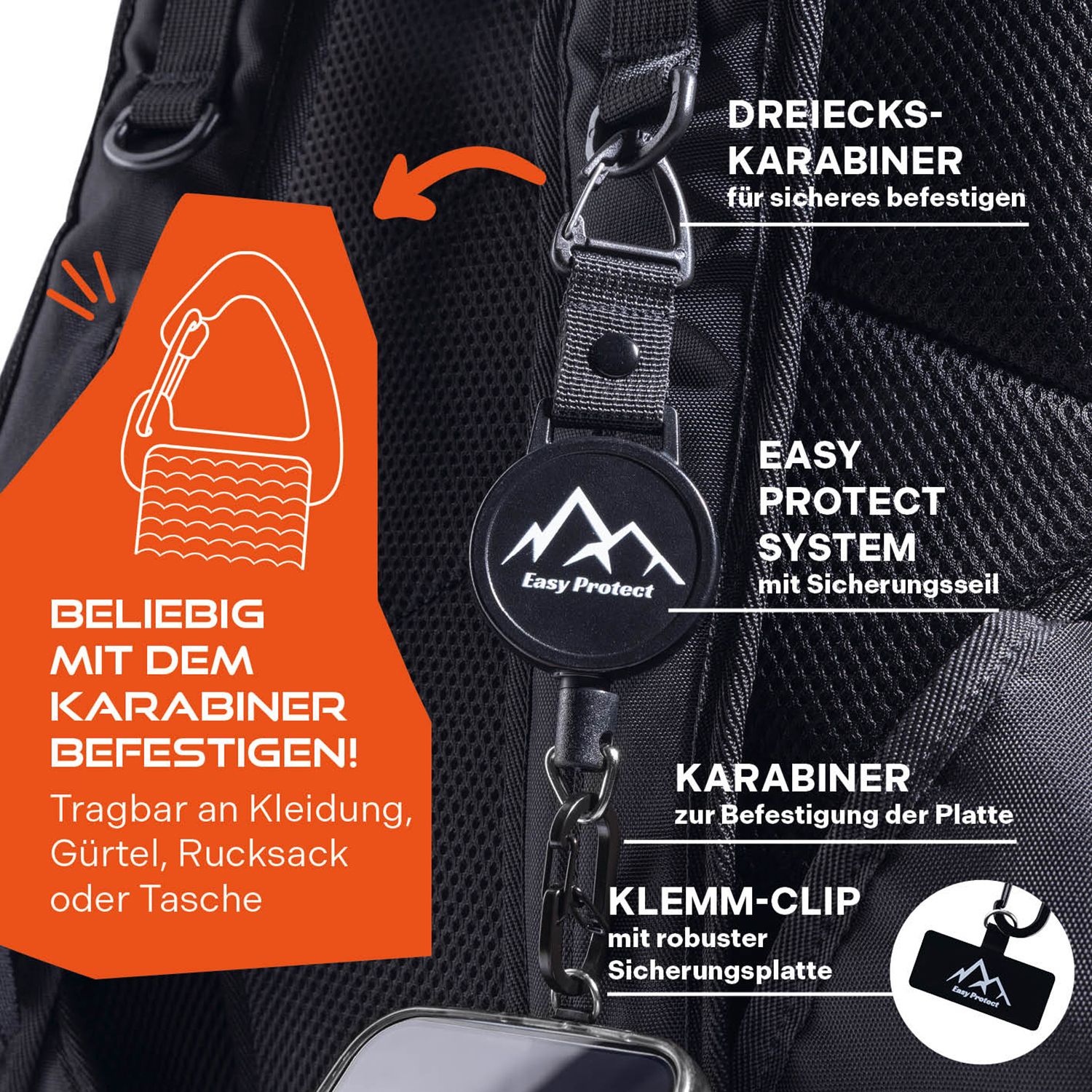 Kompakt, leicht und immer an deiner Seite - die EASY PROTECT Smartphone-Sicherung ist das zuverlässige Fallschutz-System, das dein Handy vor unbeabsichtigtem Fallenlassen schützt. Dein Smartphone ist dank stabilem Dreieckskarabiner stets sicher befestigt und jederzeit griffbereit. Ideal zum Wandern, Radfahren, für Selfies, Konzerte, Festivals und vieles mehr. Der Clou: Du musst dein Handy nicht mehr ständig festhalten oder aus der Tasche kramen! Dank der Kette bleibt es immer griffbereit und sicher fixiert. Unauffällig im Design, aber stark im Schutz.