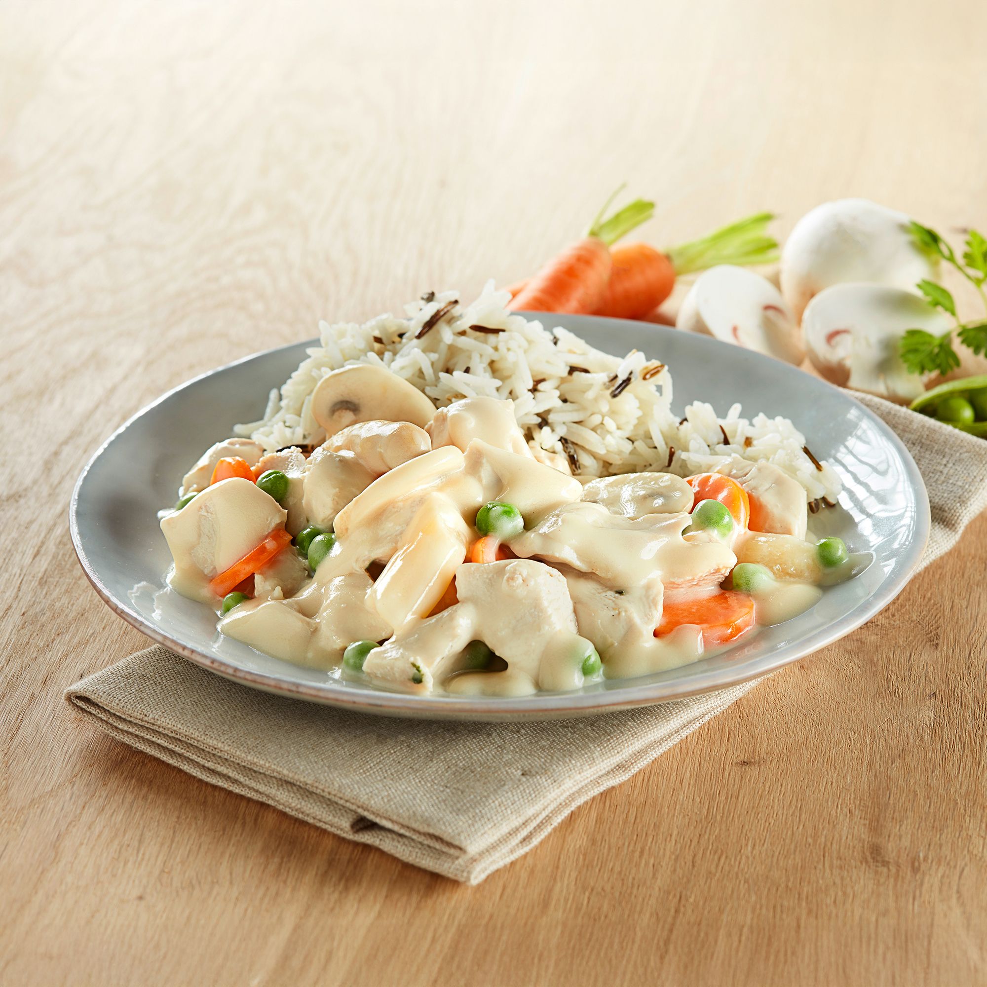 - klassisches Hühner-Frikassee mit Gemüse, ohne Zusatz von Hühnerfett, Palmfett, Wein und Emulgatoren