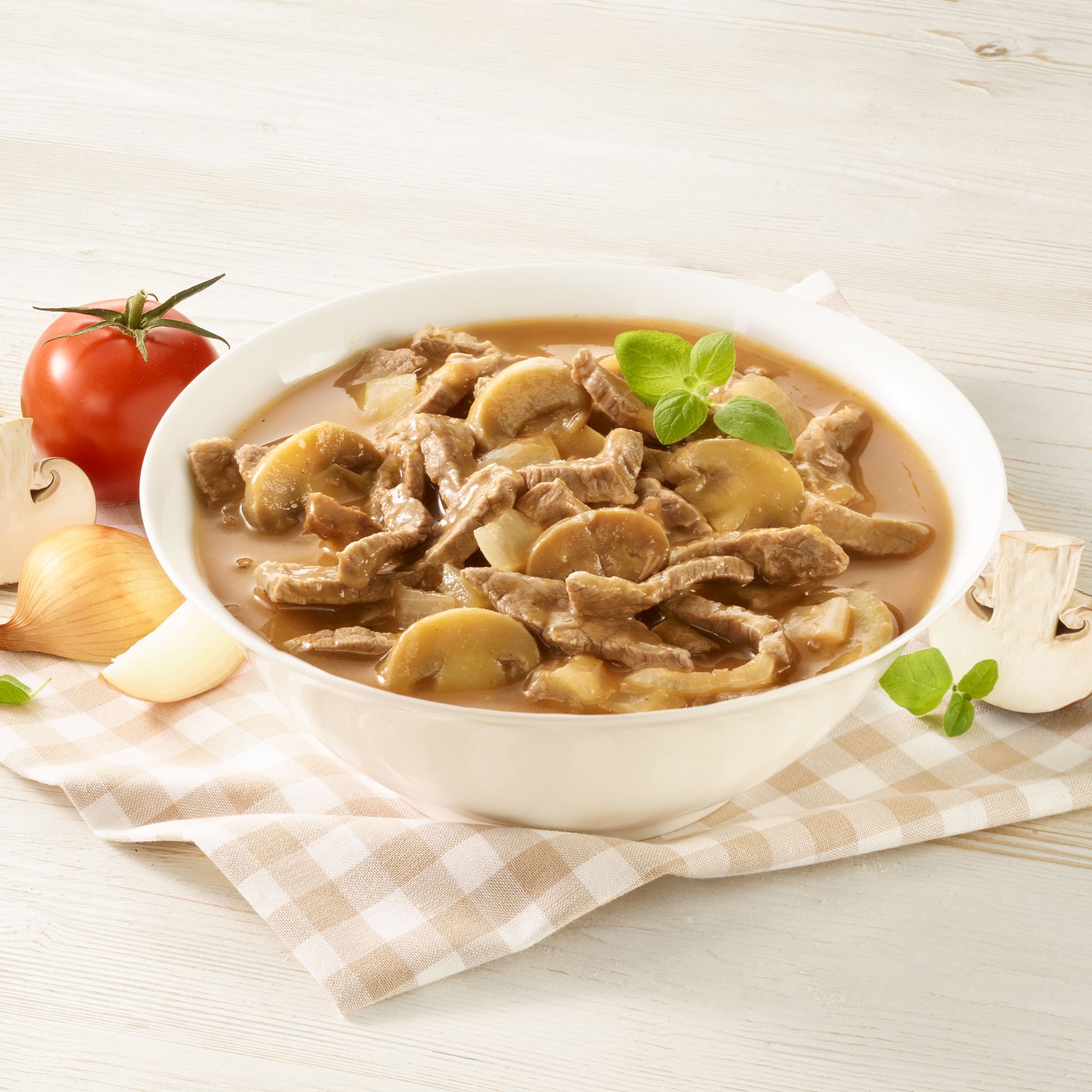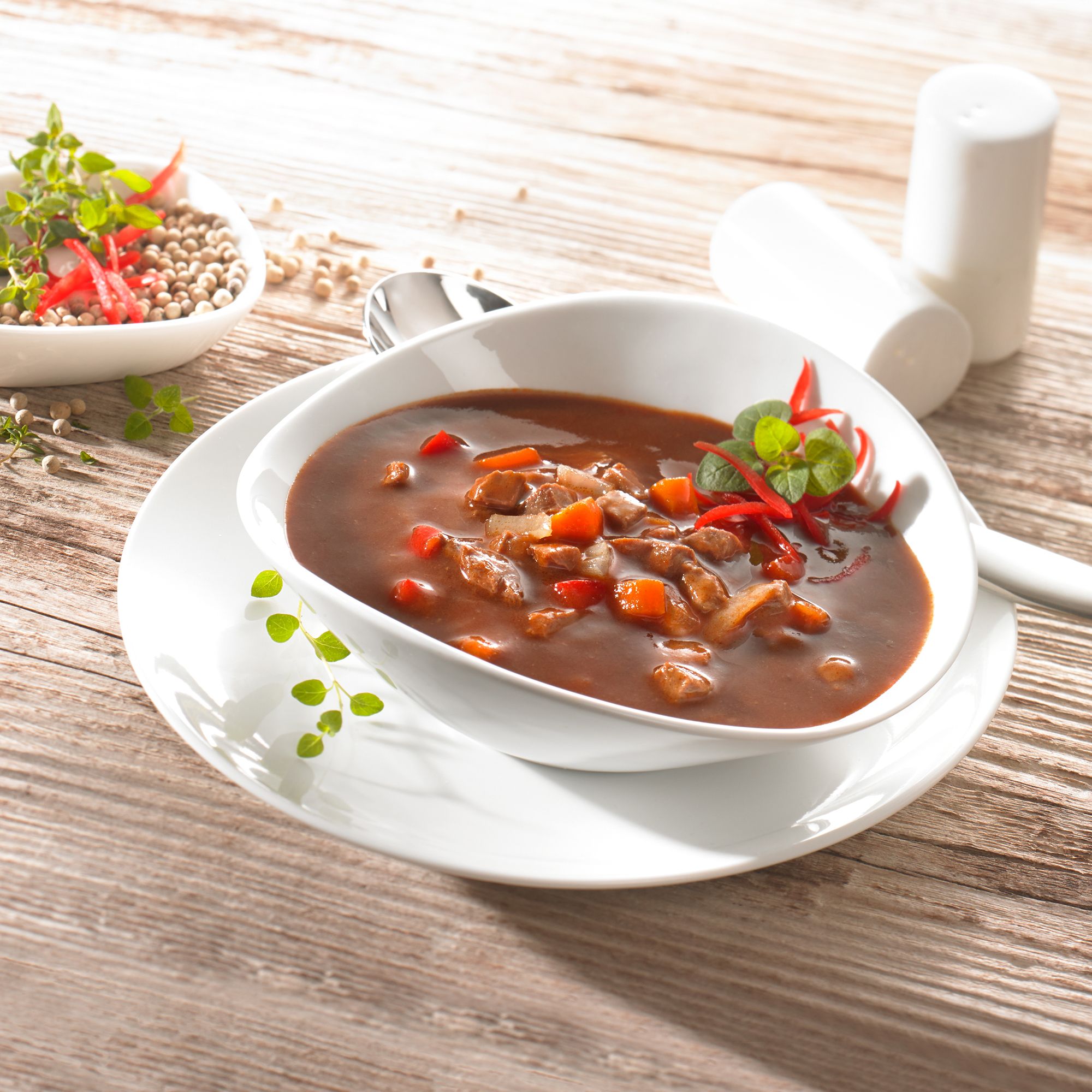 - Gulaschsuppe mit 20 % magerem Bio-Rindfleisch, ohne Palmfett, mit Sonnenblumenöl