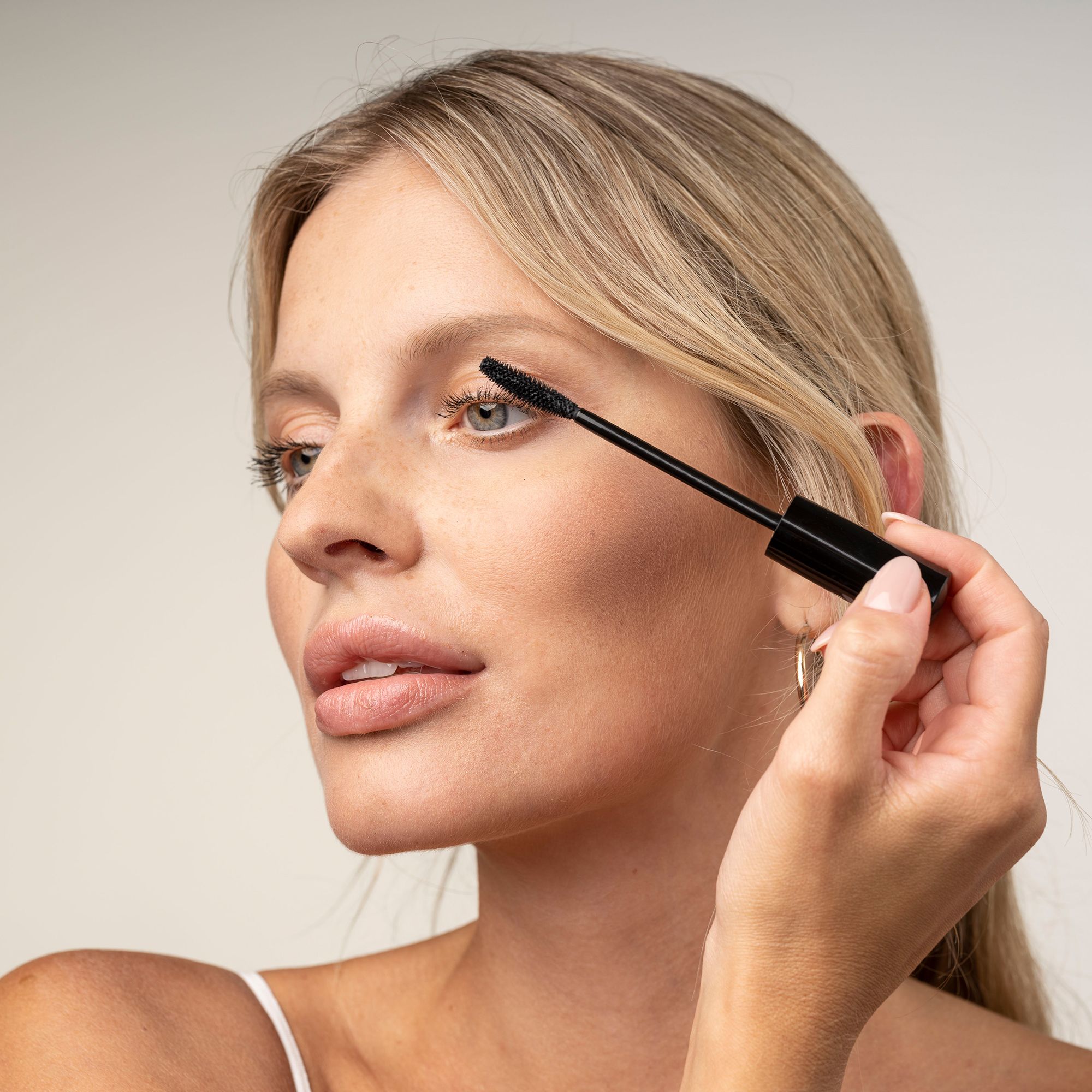 - für die unteren Wimpern Bürste senkrecht halten und Farbe sanft auftragen