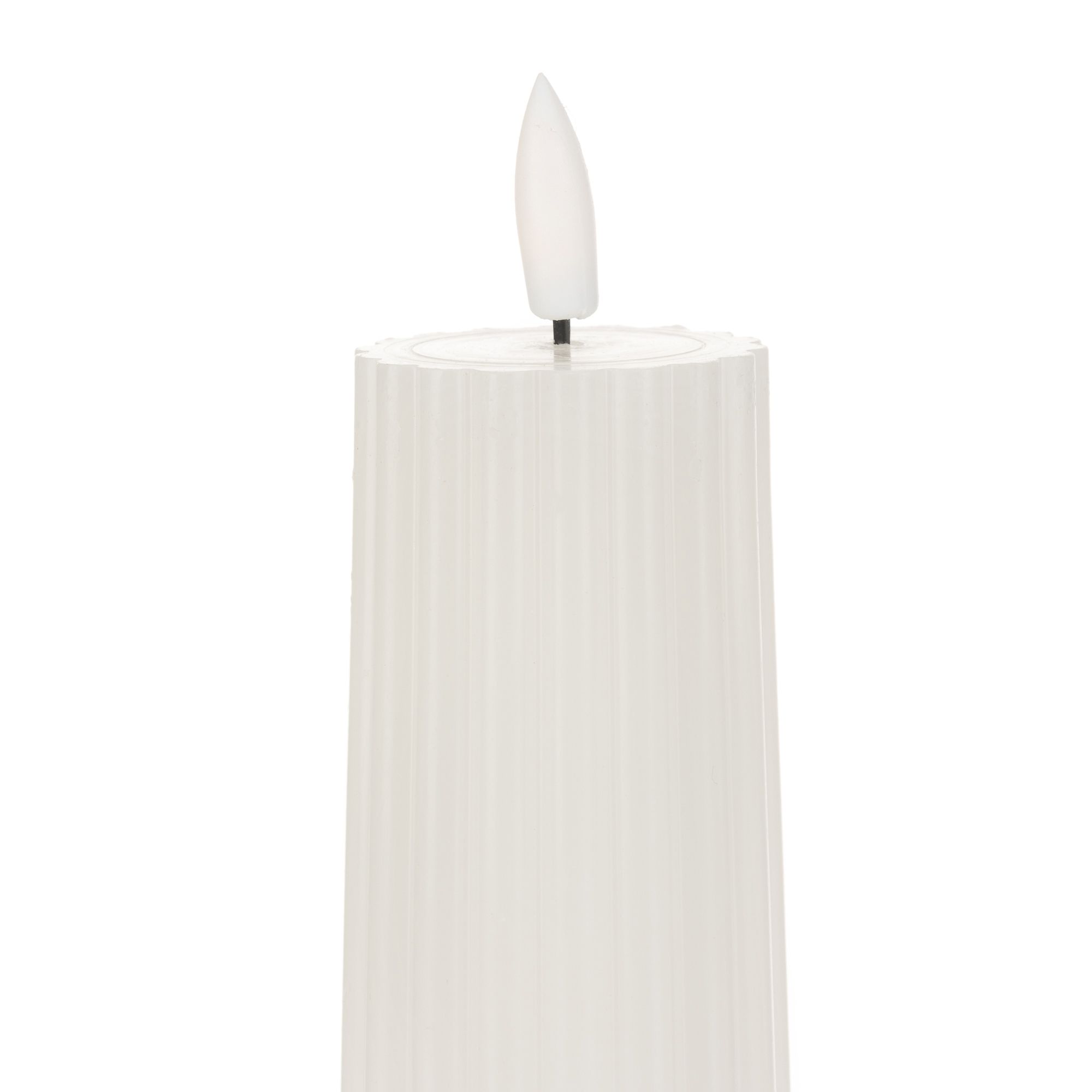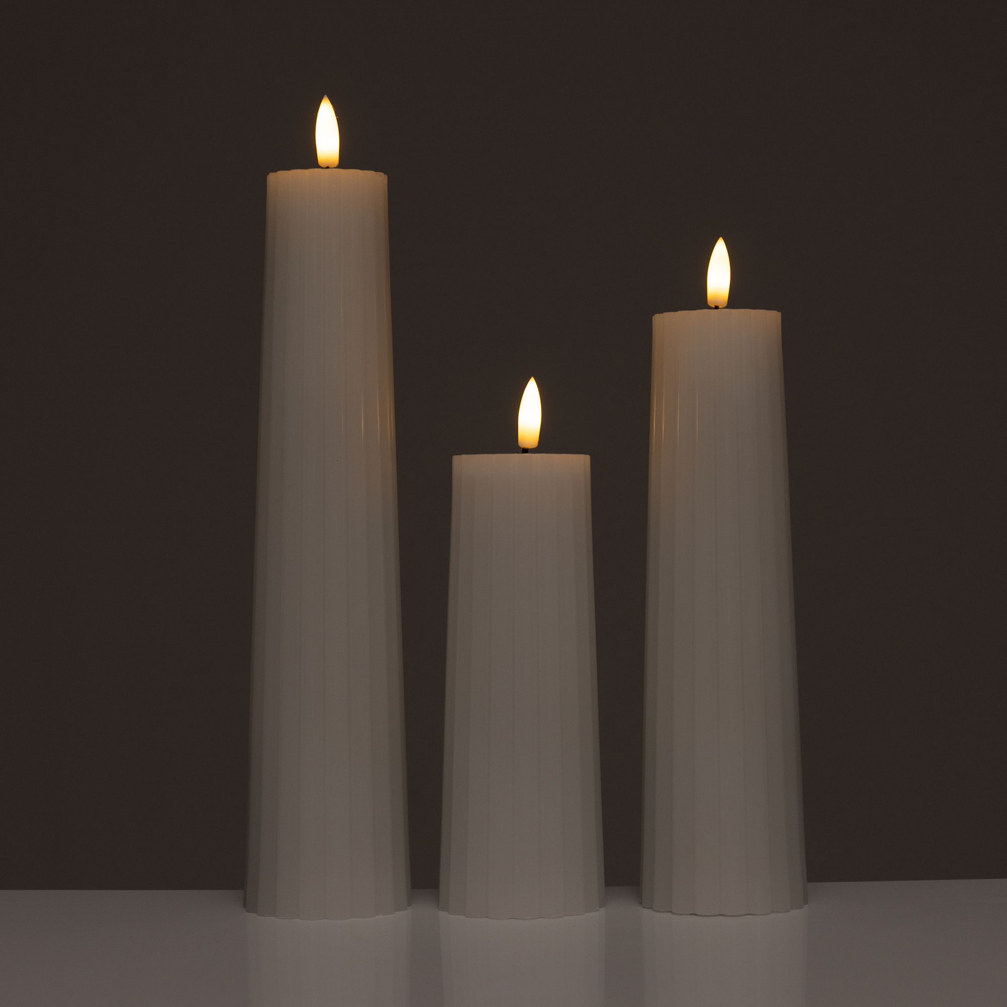 Die drei Kerzen von ELAMBIA mit Rillenoberfläche setzen mit ihrer schicken Kegelform besondere Deko-Akzente. Durch die Luma-Flamme und Echtwachs sind die LED-Kerzen von konventionellen Kerzen kaum zu unterscheiden.