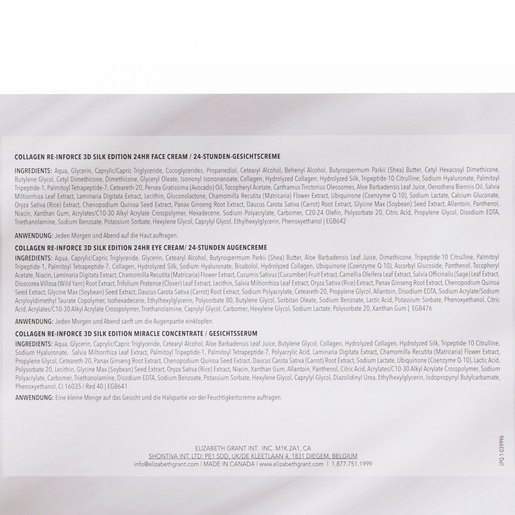 - 24h Creme: Aqua, Glycerin, Caprylic/Capric Triglyceride, Cocoglycerides, Propanediol, Cetearyl Alcohol, Behenyl Alcohol, Butyrospermum Parkii (Shea) Butter, Cetyl Hexacosyl Dimethicone, Butylene Glycol, Cetyl Dimethicone, Dimethicone, Glyceryl Oleate, Isononyl Isononanoate, Collagen, Hydrolyzed Collagen, Hydrolyzed Silk, Tripeptide-10 Citrulline, Sodium Hyaluronate, Palmitoyl Tripeptide-1, Palmitoyl Tetrapeptide-7, Ceteareth-20, Persea Gratissima (Avocado) Oil, Tocopheryl Acetate, Carthamus Tinctorius Oleosomes, Aloe Barbadensis Leaf Juice, Oenothera Biennis Oil, Salvia Miltiorrhiza Leaf Extract, Laminaria Digitata Extract, Lecithin, Gluconolactone, Chamomilla Recutita (Matricaria) Flower Extract, Ubiquinone (Coenzyme Q-10), Sodium Lactate, Calcium Gluconate, Oryza Sativa (Rice) Extract, Chenopodium Quinoa Seed Extract, Panax Ginseng Root Extract, Daucus Carota Sativa (Carrot) Root Extract, Glycine Max (Soybean) Seed Extract, Allantoin, Panthenol, Niacin, Xanthan Gum, Acrylates/C10-30 Alkyl Acrylate Crosspolymer, Hexadecene, Sodium Polyacrylate, Carbomer, C20-24 Olefin, Polysorbate 20, Citric Acid, Propylene Glycol, Disodium EDTA, Triethanolamine, Sodium Benzoate, Potassium Sorbate, Hexylene Glycol, Caprylyl Glycol, Ethylhexylglycerin, Phenoxyethanol