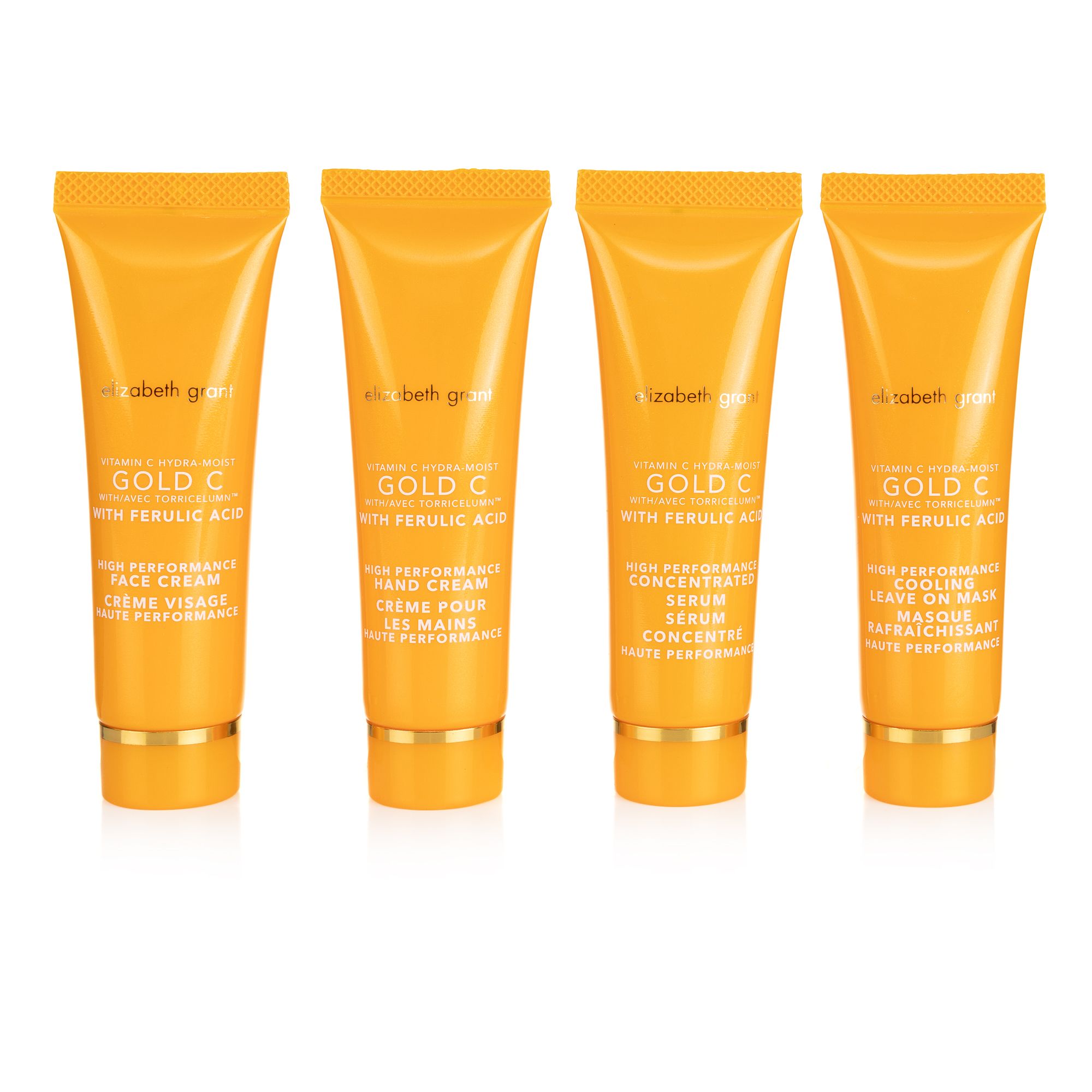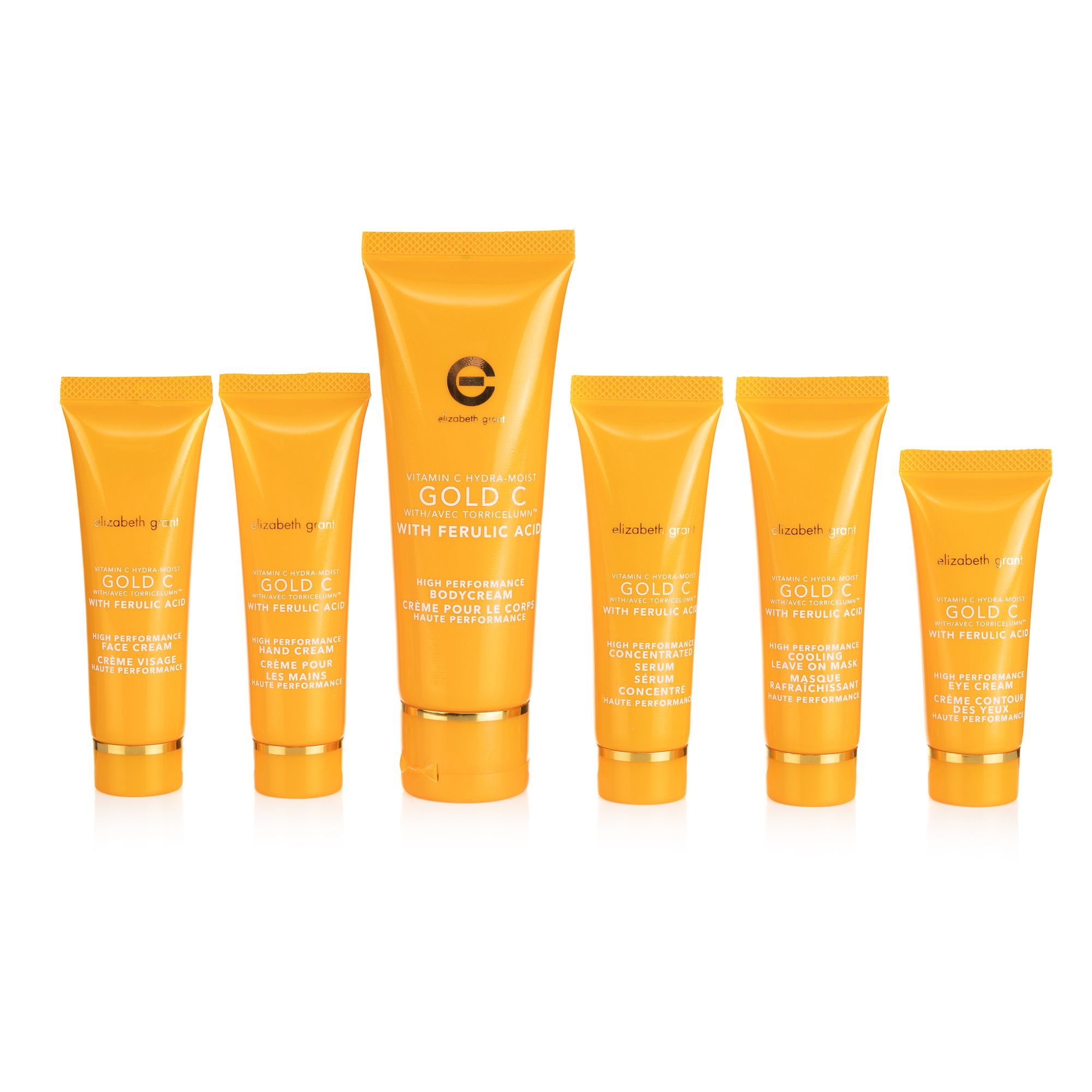 Gesicht & Augenpartie, Hände & Körper: Gönne dir mit dem 6er-Set Discover Gold C von ELIZABETH GRANT die Rundum-Pflege für jeden Tag. Die effektive High-Performance-Formel mit Vitamin C und Ferulasäure spendet der Haut genau die Wirkstoffe, die sie für ein samtig-zartes Gefühl und ein verführerisches Strahlen benötigt.
