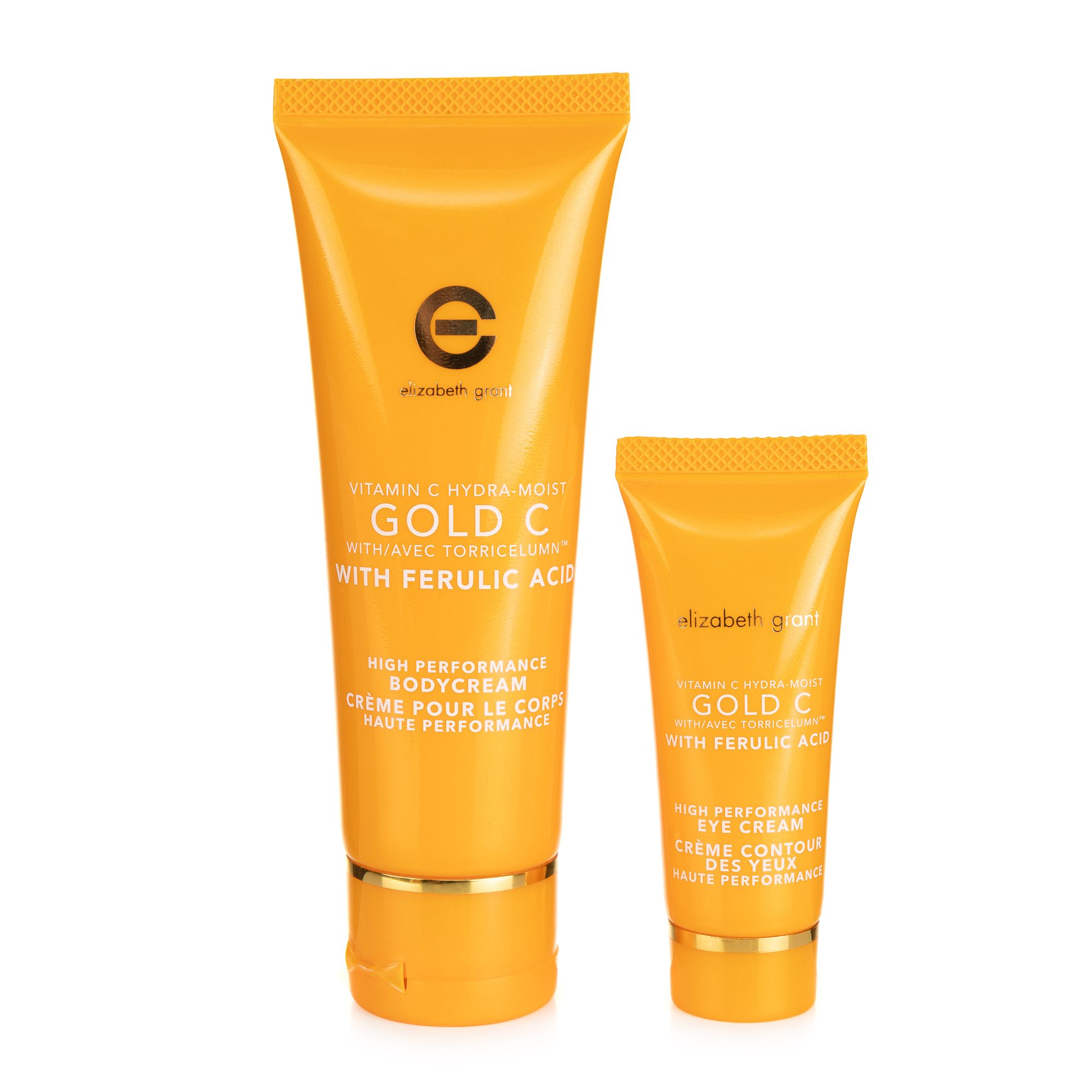 - Vitamin C Hydra Moist Gold C High Performance Body Cream with Ferulic Acid: Aqua, Glycerin, Isopropyl Palmitate, Cetearyl Alcohol, Glyceryl Stearate SE, Butyrospermum Parkii (Shea) Butter, Propanediol, Laminaria Digitata Extract, Sodium Hyaluronate, Ascorbic Acid, Camellia Sinensis Leaf Extract, Ferulic Acid, Collagen, Ceteareth-20, Chamomilla Recutita (Matricaria) Flower Extract, Caprylic/Capric Triglyceride, Sorbitol, Tocopheryl Acetate, Colloidal Gold, Propylene Glycol, Ubiquinone (Coenzyme Q-10), Panthenol, Cucumis Sativus (Cucumber) Fruit Extract, Salvia Officinalis (Sage) Leaf Extract, Dioscorea Villosa(Wild Yam) Root Extract, Allantoin, Aloe Barbadensis Leaf Juice, Glutathione, Xanthan Gum, Sodium Polyacrylate, Citric Acid, Disodium EDTA, Sodium Hydroxide, Carbomer, Triethanolamine, Limonene, Linalool, Caprylyl Glycol, 1,2-Hexanediol, Benzyl Benzoate, Phenoxyethanol, Potassium Sorbate, Sodium Benzoate, Ethylhexylglycerin, Parfum EGB857