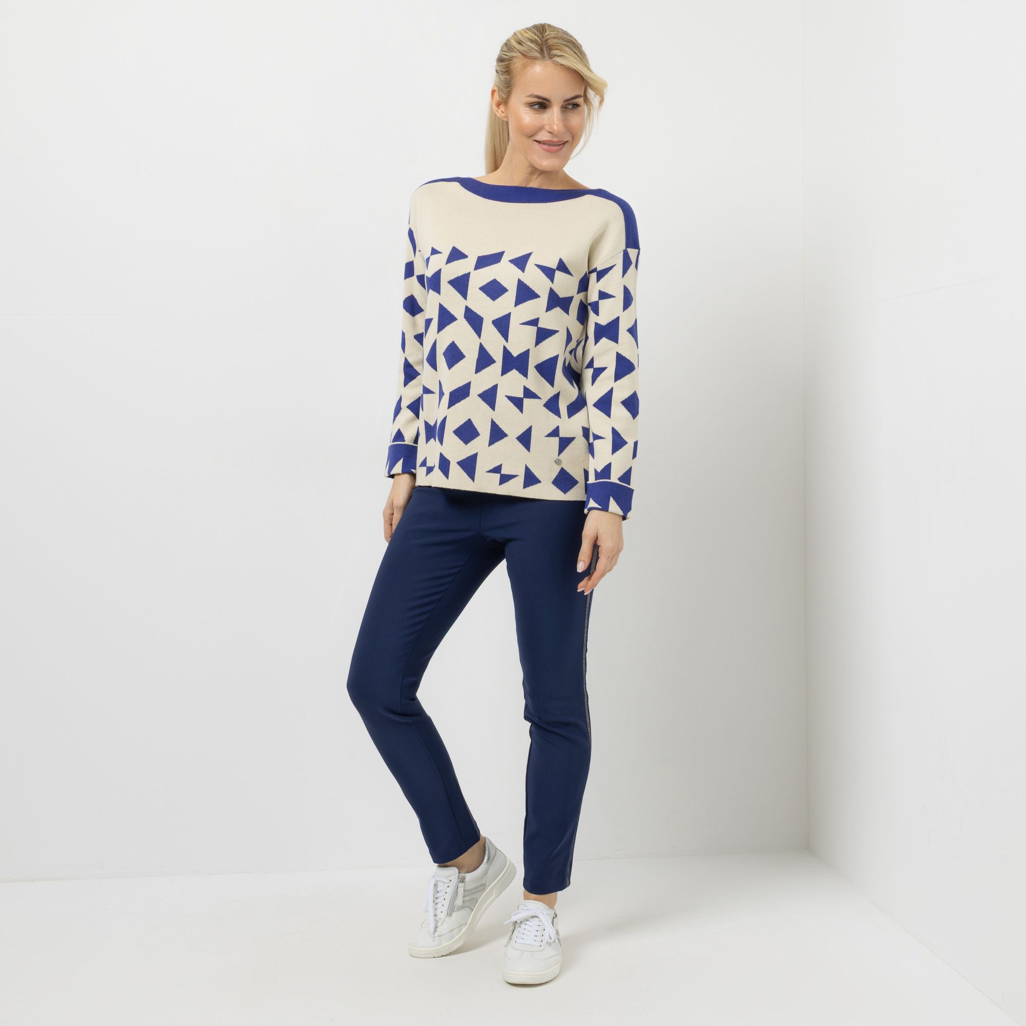 Ein Pullover von EVA LUTZ, der mit seinem gemusterten Design und feinen Kontrastdetails den Alltag spielerisch aufwertet.