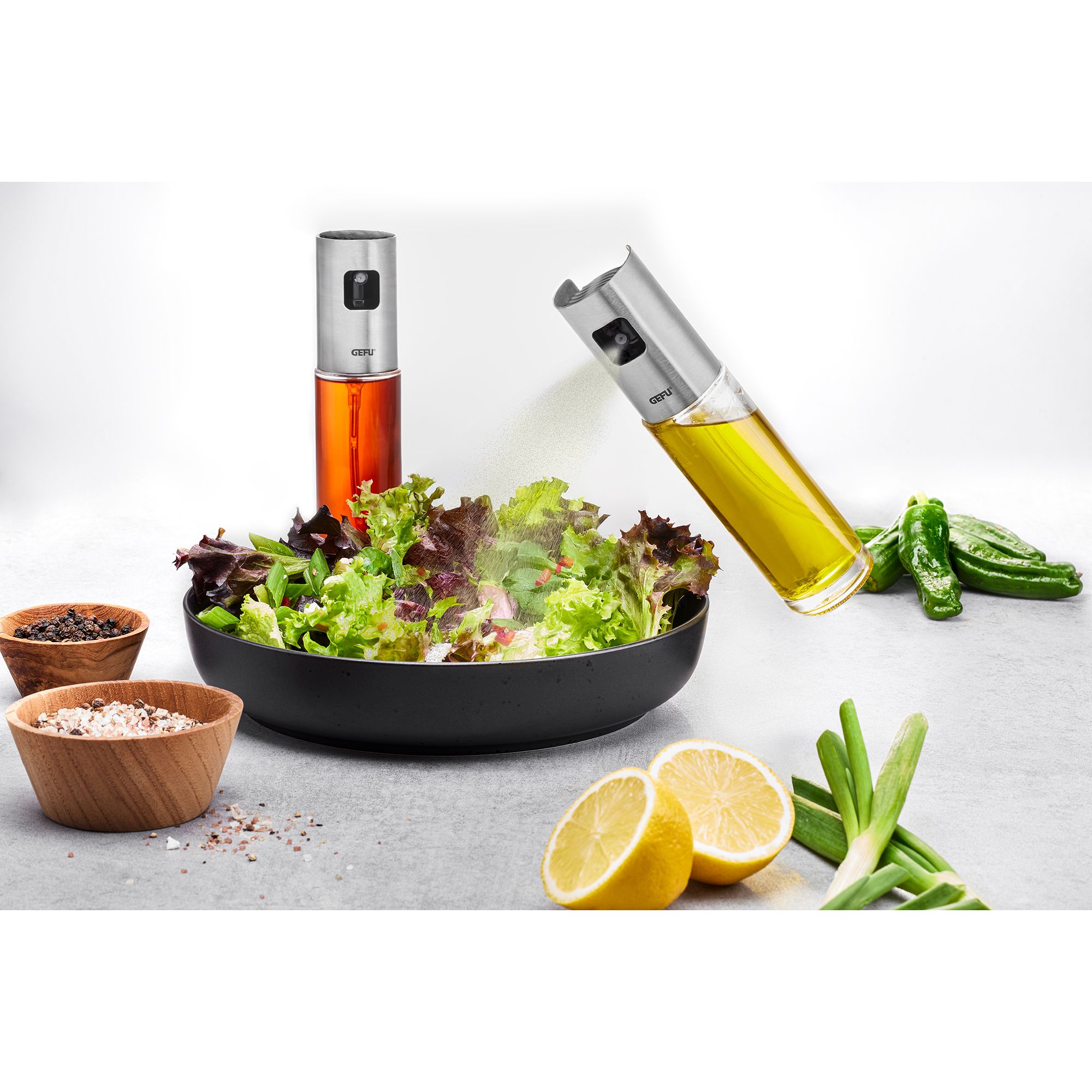 Einfach kurz sprühen statt lange einpinseln oder bestreichen! Das elegante Sprühflaschen-Duo Neva von GEFU® ermöglicht das feine, gleichmäßige Dosieren von Essig und Öl auf Knopfdruck. Die Tools sind perfekt für eine fettarme Ernährung und als Helfer für kalorienbewusstes Braten, Grillen, Kochen und Backen.