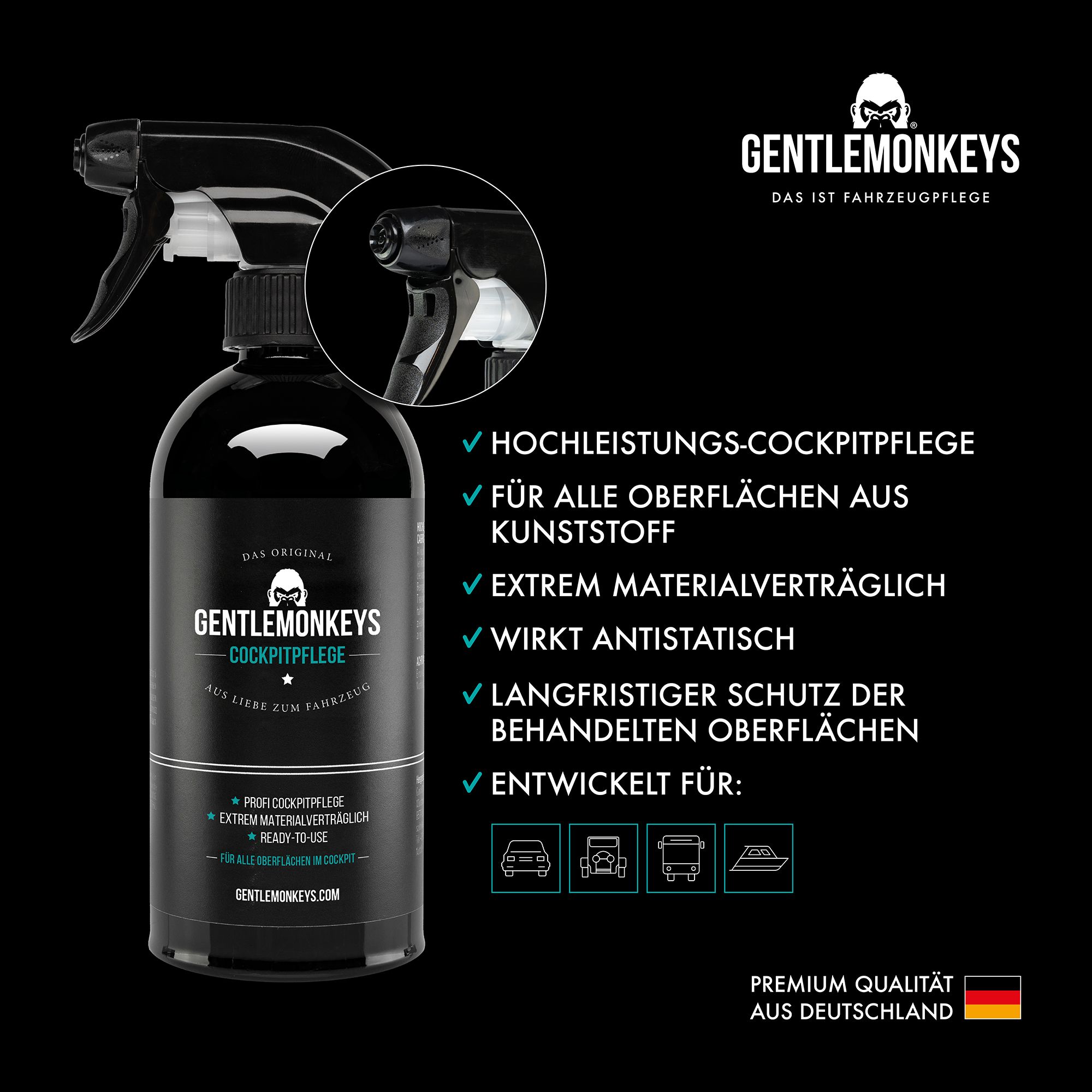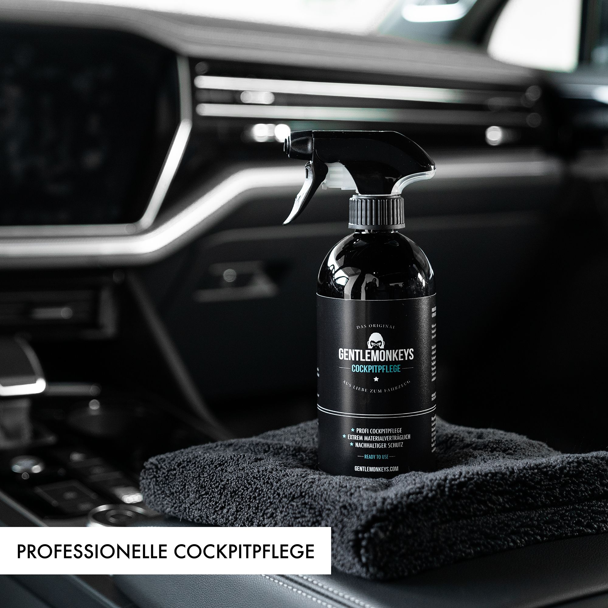 Bring das Innere deines Pkws mit der Cockpitpflege zum GENTLEMONKEYS zum Blitzen! Dieser hochwertige Reiniger lässt Verschmutzungen leicht und mühelos verschwinden. Dazu verleiht er den Kunststoff-Oberflächen zugleich einen Schutzfilm: So bleibt Staub und Schmutz weniger gut haften, es bleibt in deinem Wagen länger sauber und UV-Licht kann Farbe & Material weniger anhaben.