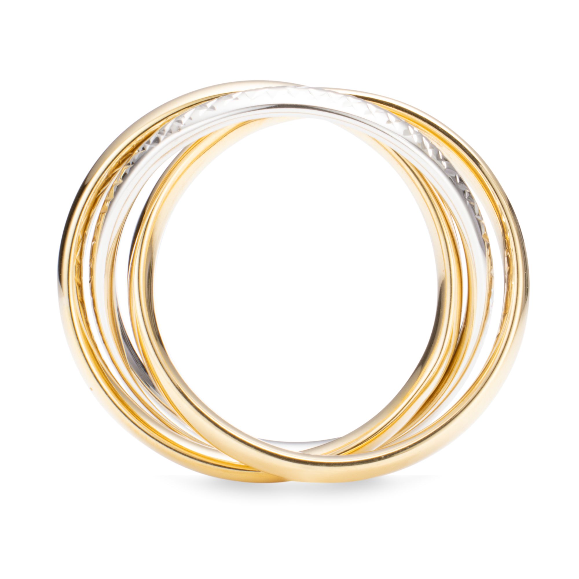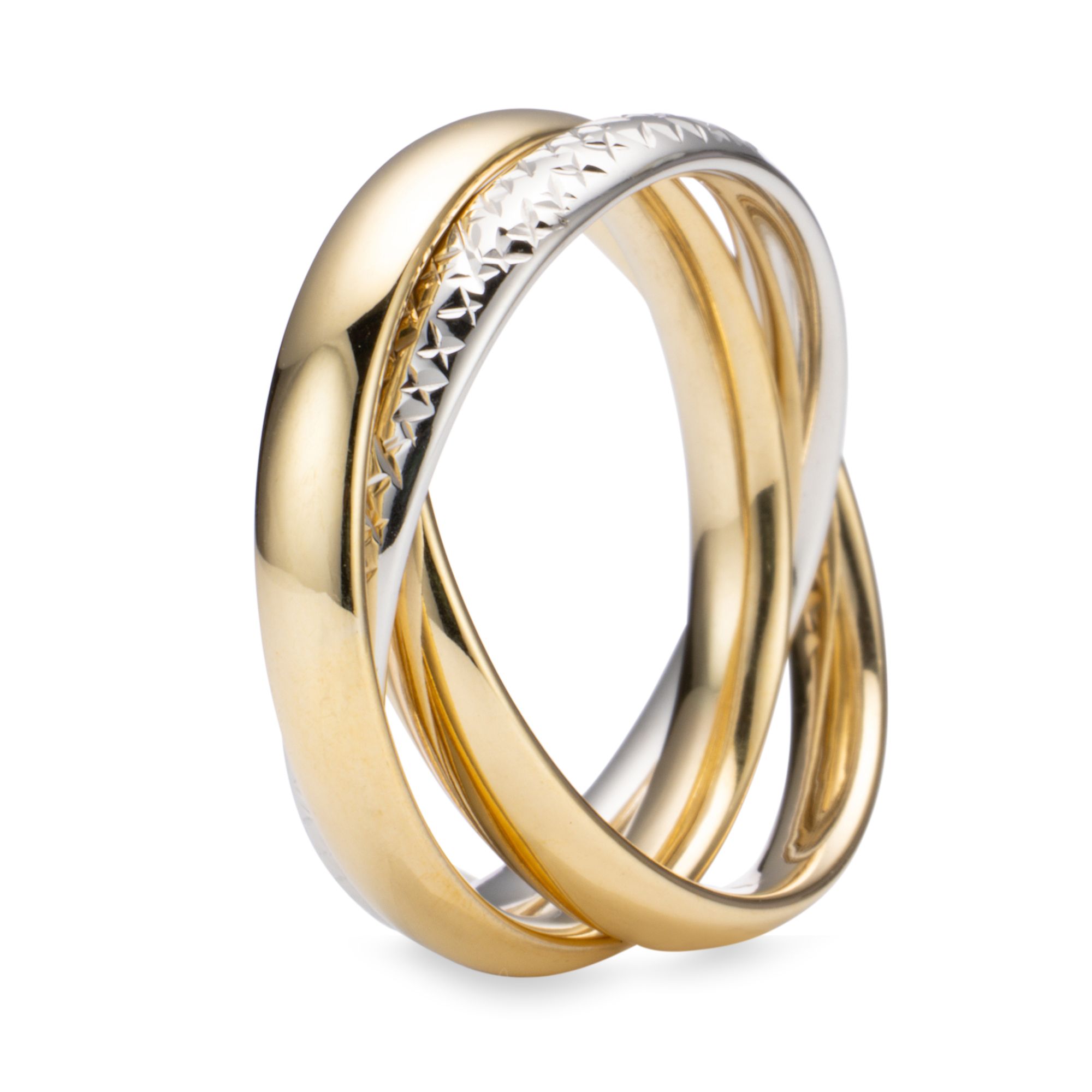 Glänzend und raffiniert: Der Roll-Ring von GOLDRAUSCH vereint polierte und diamantierte Oberflächen und setzt moderne Akzente.