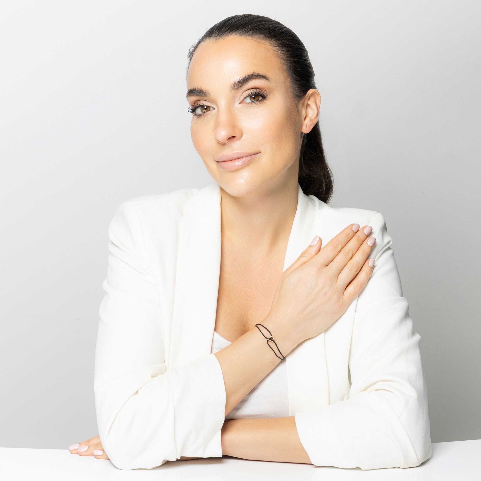 GOLDSCHMUCK FÜR MICH präsentiert ein raffiniertes Armband aus Gold, veredelt mit einem schwarzen Stoffband für ausdrucksstarke Akzente