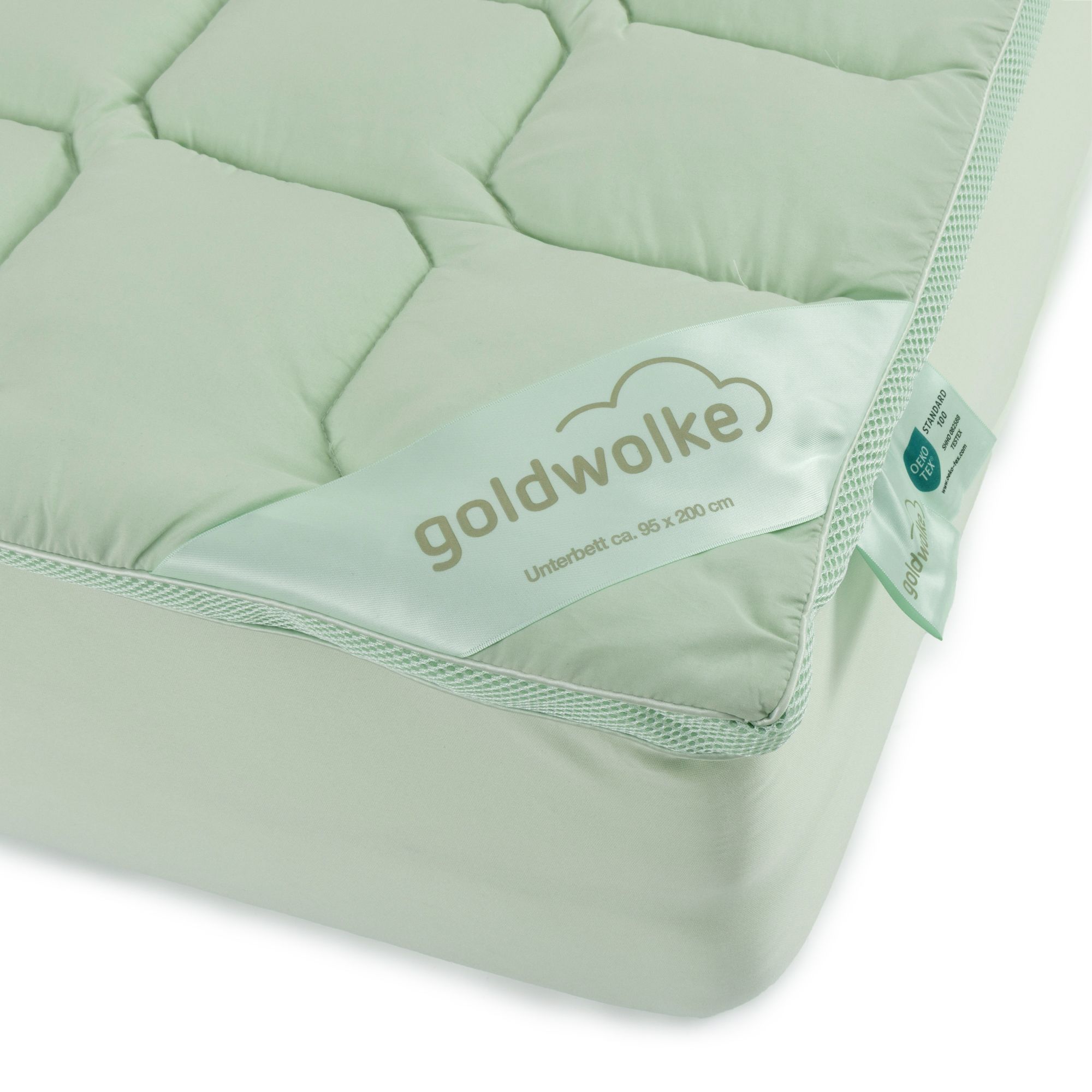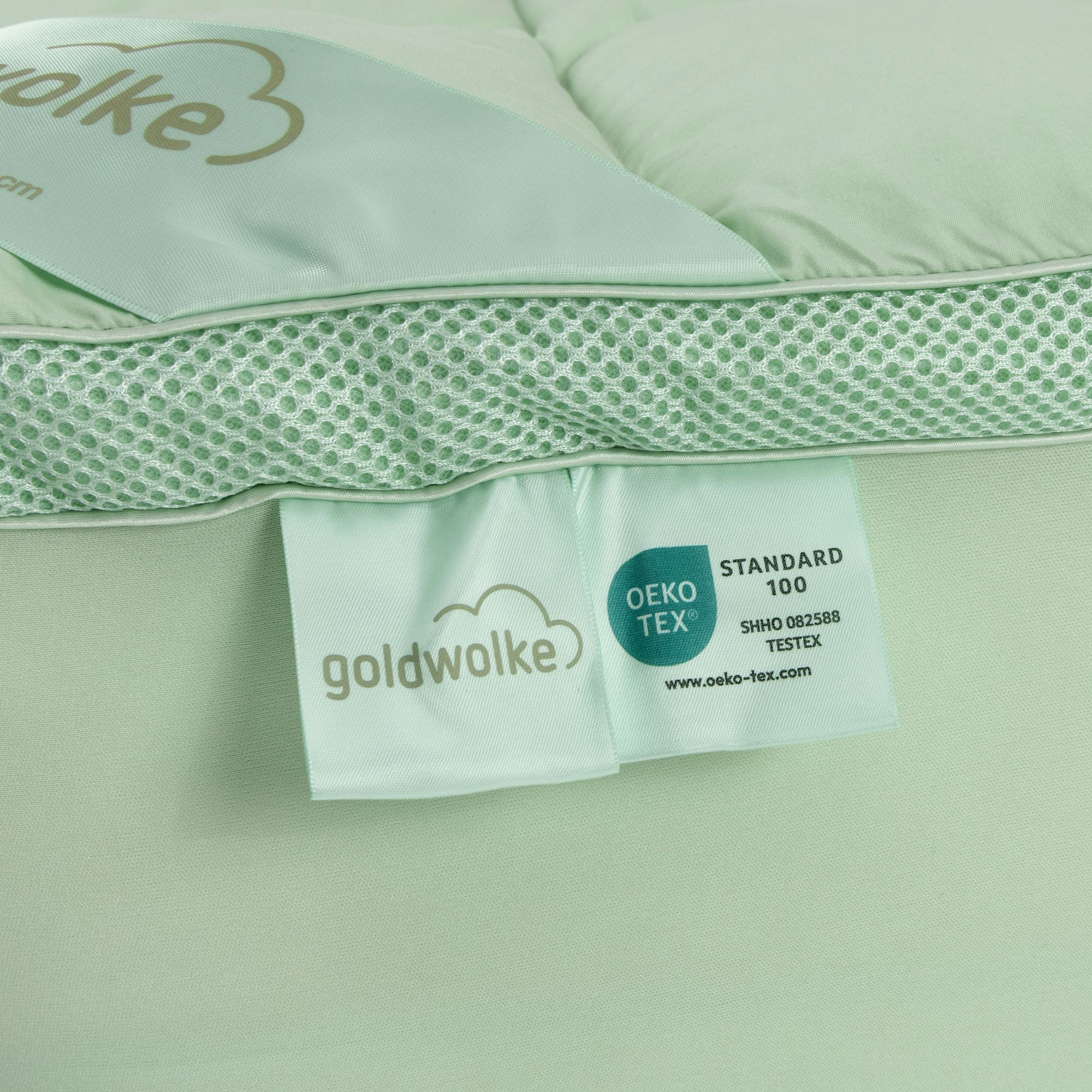 Das Unterbett von GOLDWOLKE vereint innovative Ausstattung mit Komfort und Stil. Das Obermaterial aus Mikrofaser sorgt für ein angenehm weiches Liegegefühl, während die patentierte HeiQ Smart-Ausrüstung mit dynamischer Kühltechnologie punktet: Sie aktiviert die Kühlung bei steigender Körpertemperatur und stellt sie automatisch wieder ab, sobald die Temperatur reguliert ist. So genießt du entspanntes Schlafklima – sogar bis zu 2,5 °C kühler. Besonders praktisch: Das Unterbett ist für Menschen mit Allergie geeignet, da es bei 60 °C gewaschen werden kann.