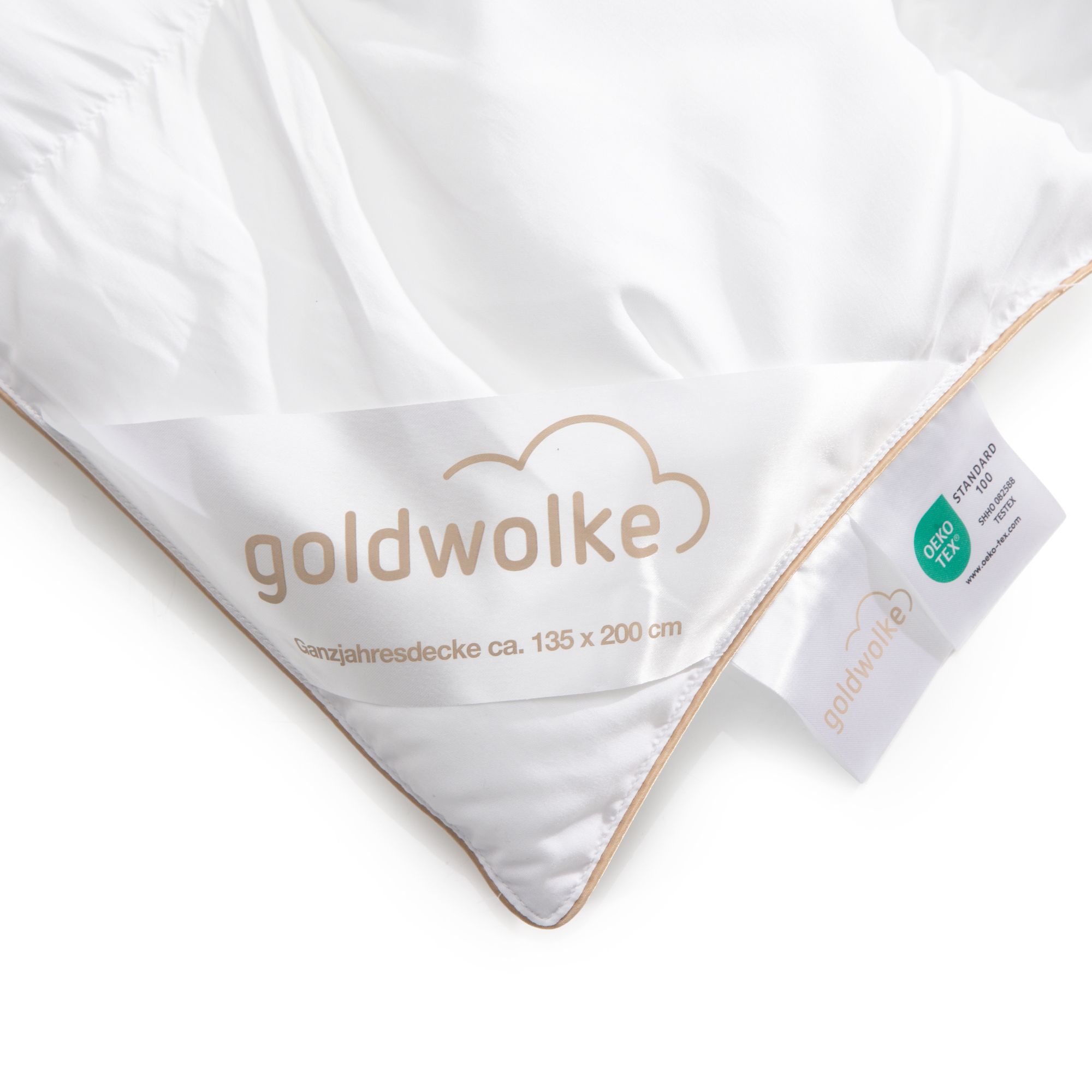Mit dieser Mikrofaser-Ganzjahresdecke von GOLDWOLKE genießt du Komfort, der an das Gefühl von Daunen erinnert. Die Cloud Filling Füllung sorgt für ein wunderbar weiches Liegegefühl, während die Karosteppung und das goldfarbene Piping einen eleganten Akzent setzen. Die Decke ist auch für Menschen mit Allergie geeignet, da sie bei 60 Grad gewaschen werden kann.