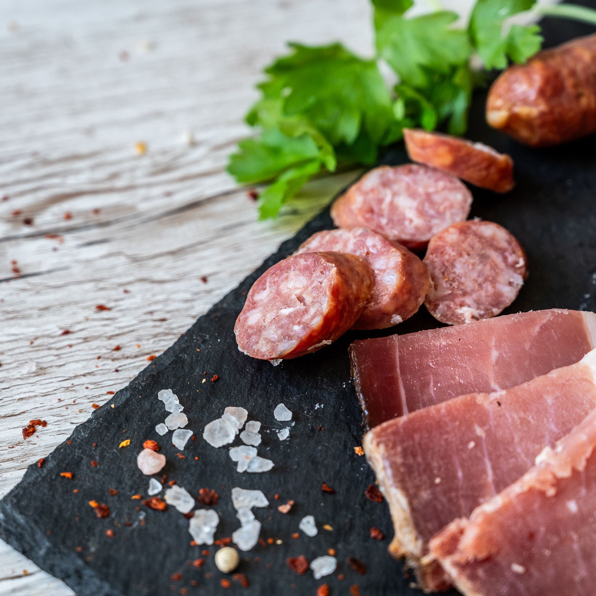 - Kräuterschinken und Kaminwurzen über Buchenholz geräuchert