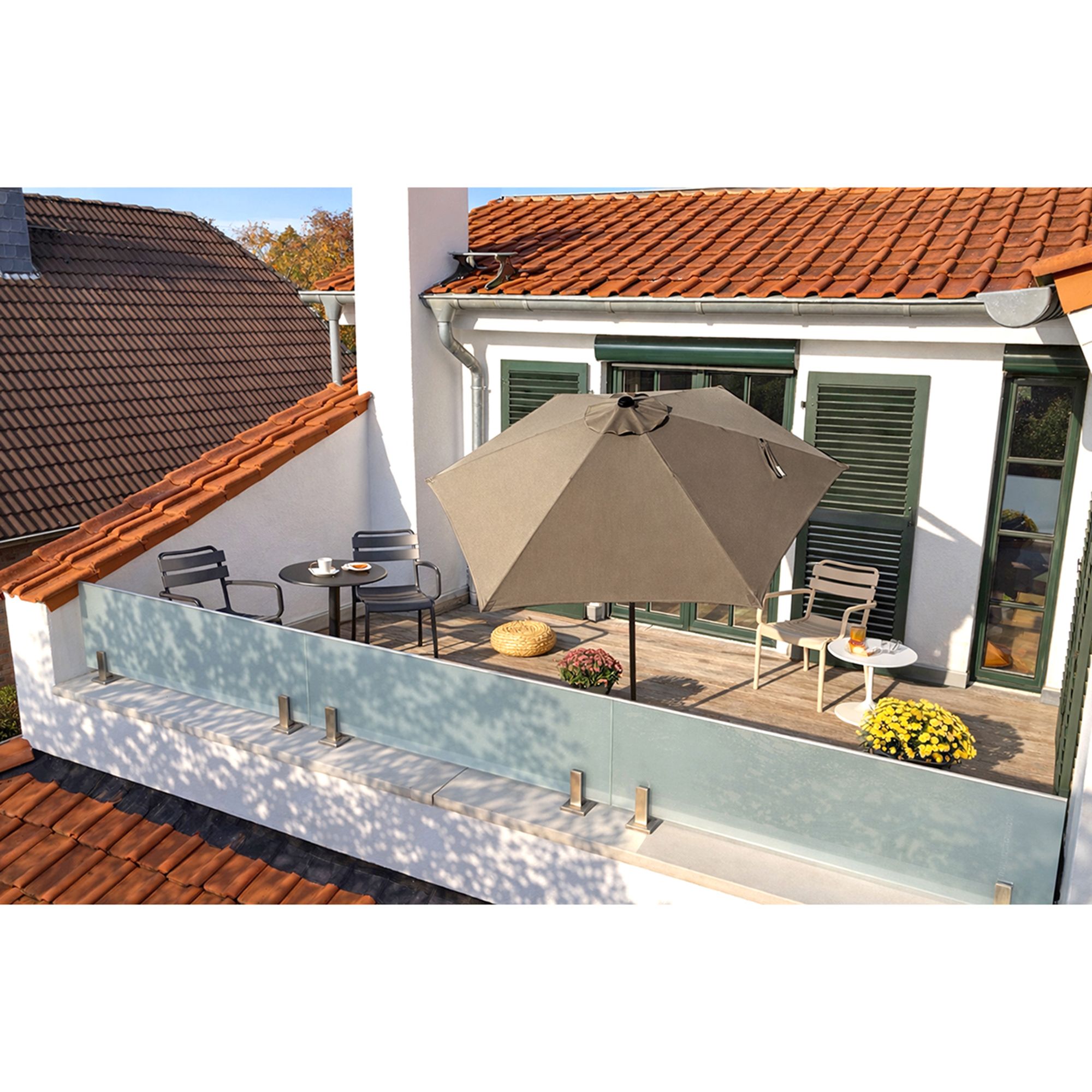 Mit dem GREEN LOUNGE Marktschirm wird jeder Sitzplatz im Garten oder auf dem Balkon zum entspannten Lieblingsort – das großzügige Schirmdach, die praktische Kippfunktion und der UV-Schutz sorgen für angenehmen Schatten und Komfort, ganz wie du es dir wünschst.
