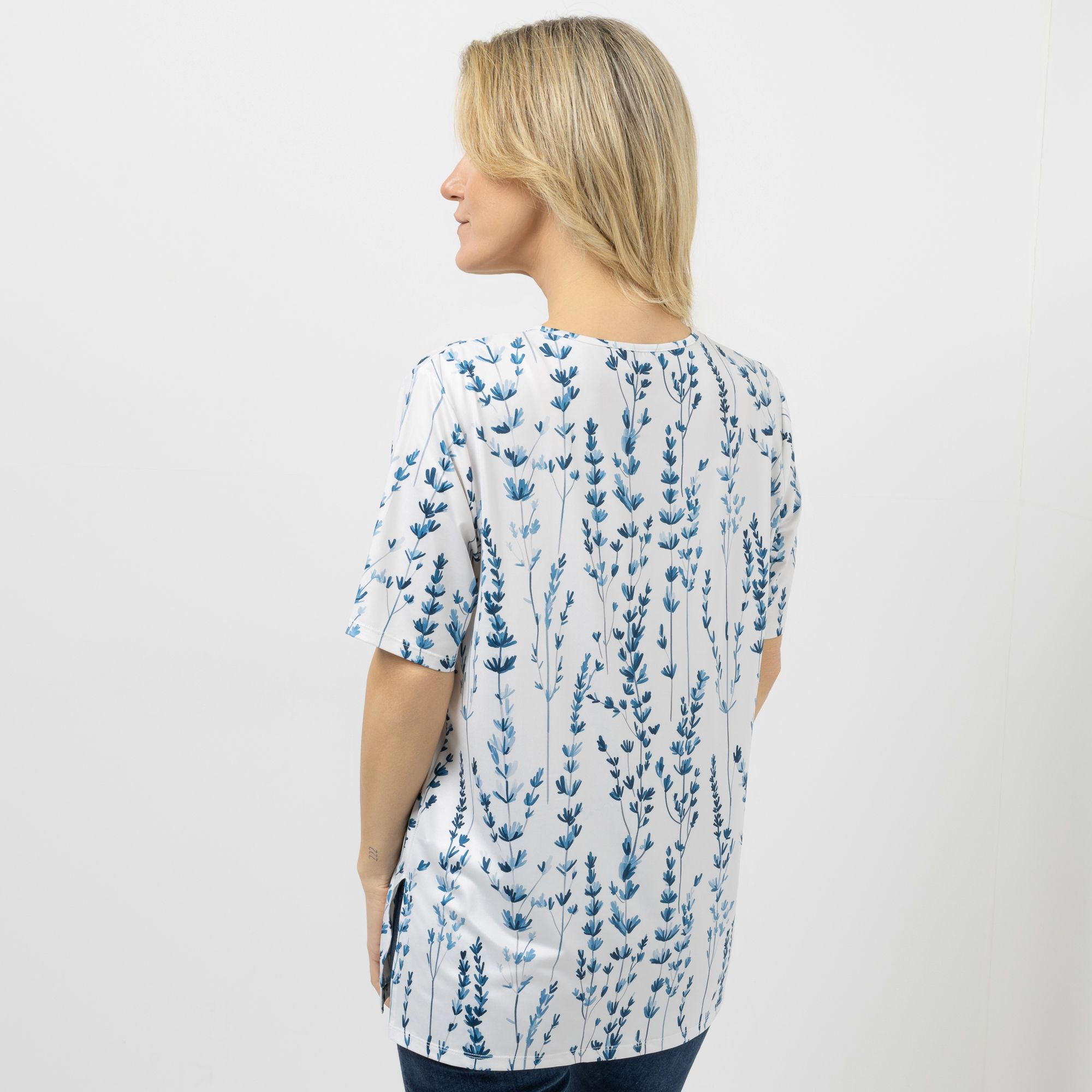 Das Shirt von IN-PRINT präsentiert sich mit virtuosem Blau-Weiß-Print