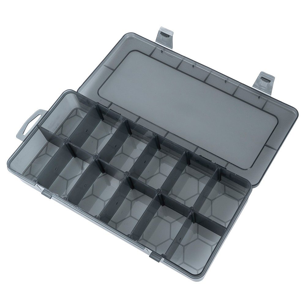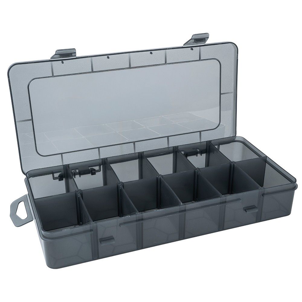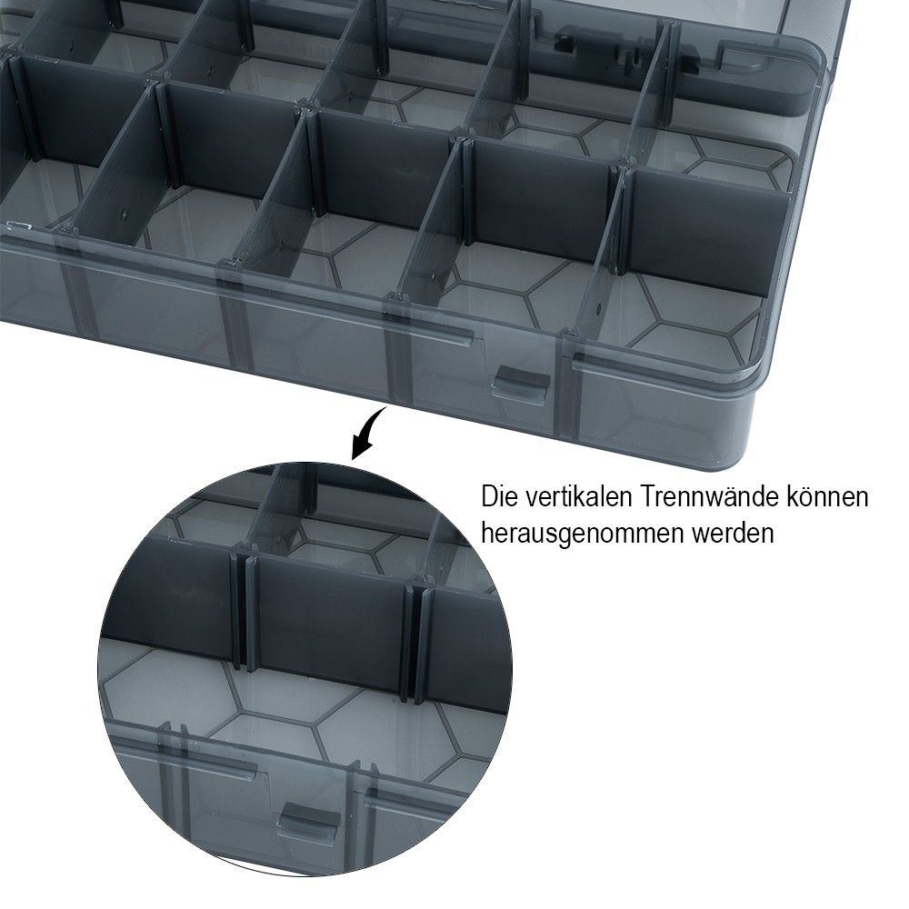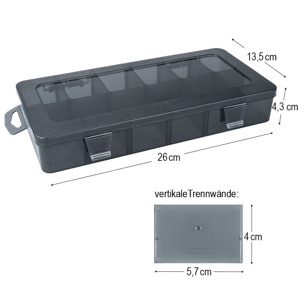 - 6 Sortierboxen (ca. 26 x 13,5 x 4,3 cm), Farbe: schwarz transluzent, 12 Fächer pro Box (je ca. 5,7 x 4 cm), herausnehmbare Trennwände