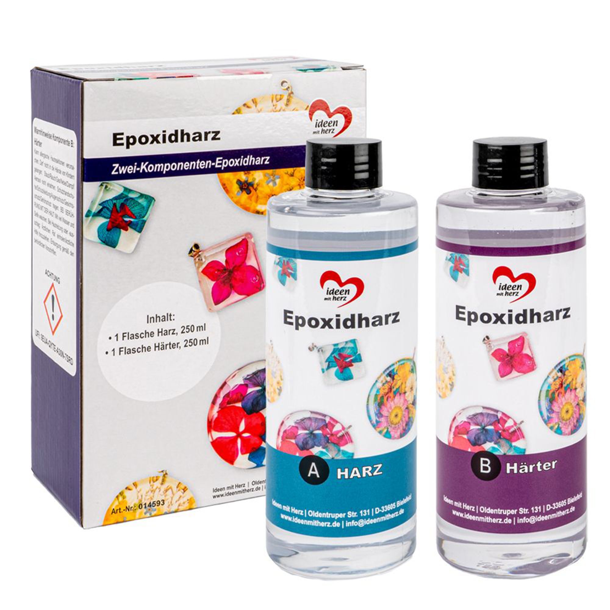 • Epoxidharz-Set mit 1 Flasche Harz (250 ml) und 1 Flasche Härter (250 ml)