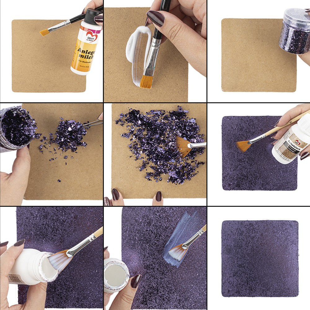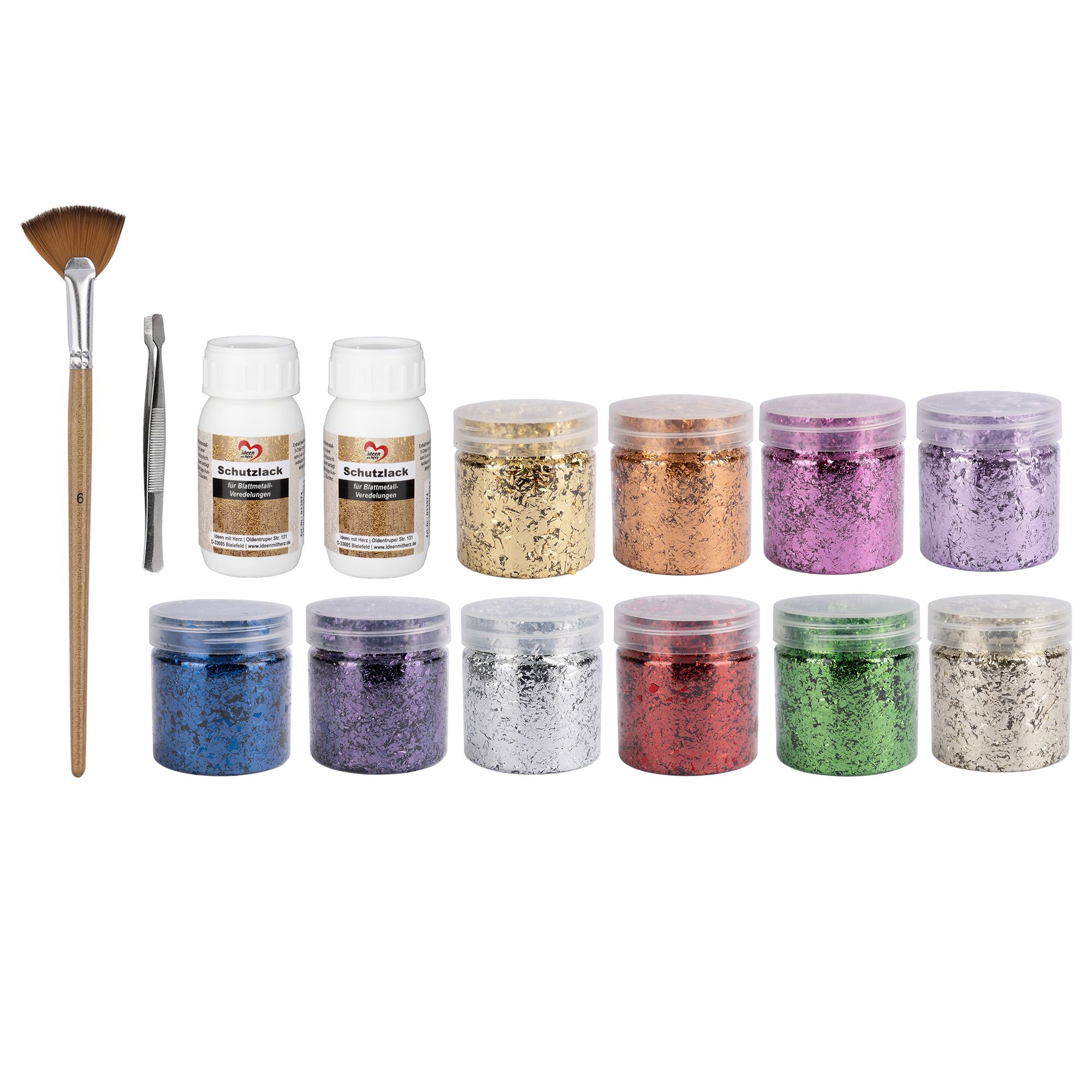 - 10 Dosen Blattmetall-Flocken je 3 g, in 10 verschiedenen Farben