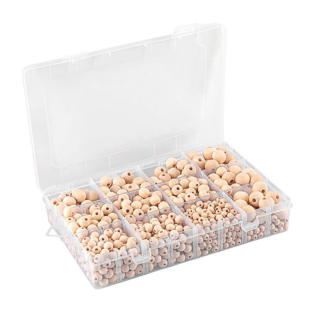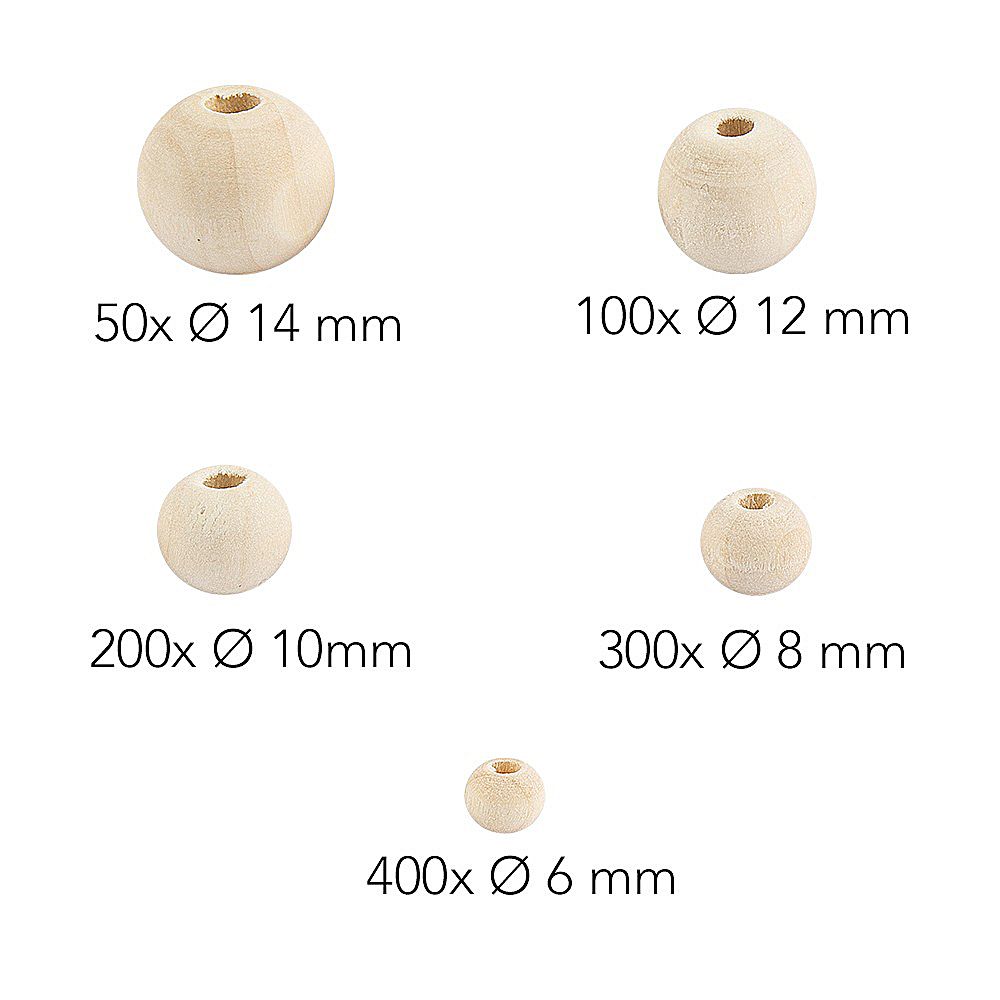 • 1 Box Holz-Perlen, mit Loch, 5 verschiedene Größen: 50 x Ø 14 mm, Loch: Ø 4 mm, 100 x Ø 12 mm, Loch: Ø 4 mm, 200 x Ø 10 mm, Loch: Ø 3 mm, 300 x Ø 8 mm, Loch: Ø 3 mm, 400 x Ø 6 mm, Loch: Ø 2,5 mm, Gesamtmenge: 1050 Stück