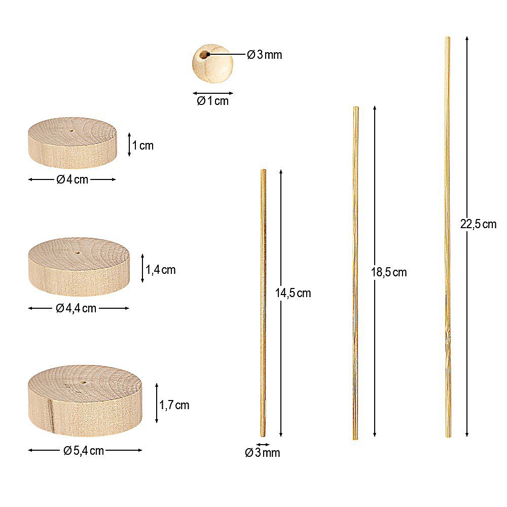 • 6 Holz-Stäbe, Ø 3 mm, 3 verschiedene Längen (14,5 cm, 18,5 cm, 22,5 cm);