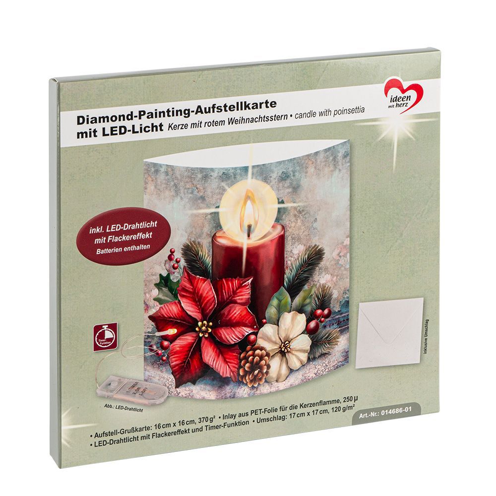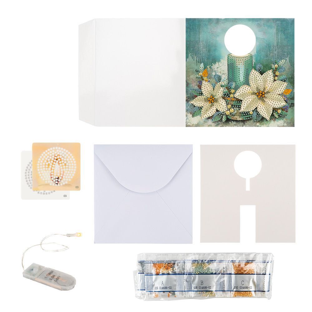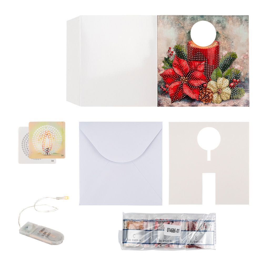 • 3 Diamond-Painting-Aufstellkarten mit LED-Licht, Kerze mit rotem Weihnachtsstern, Kerze mit weißem Weihnachtsstern, Kerze mit weißer Christrose, 16cm x 16cm, 370g/m²; 3 Inlays für die Kerzenflamme, 250 µ;