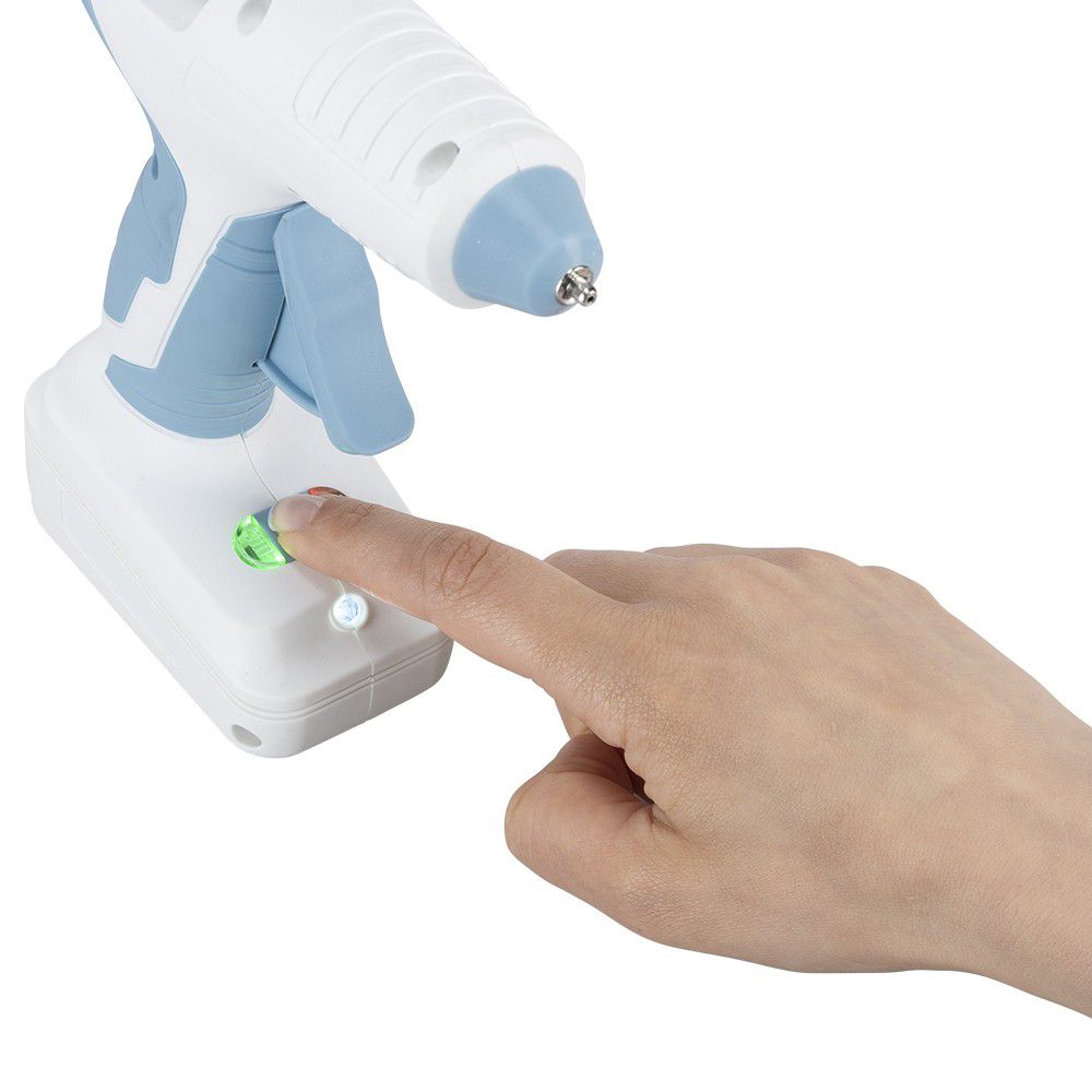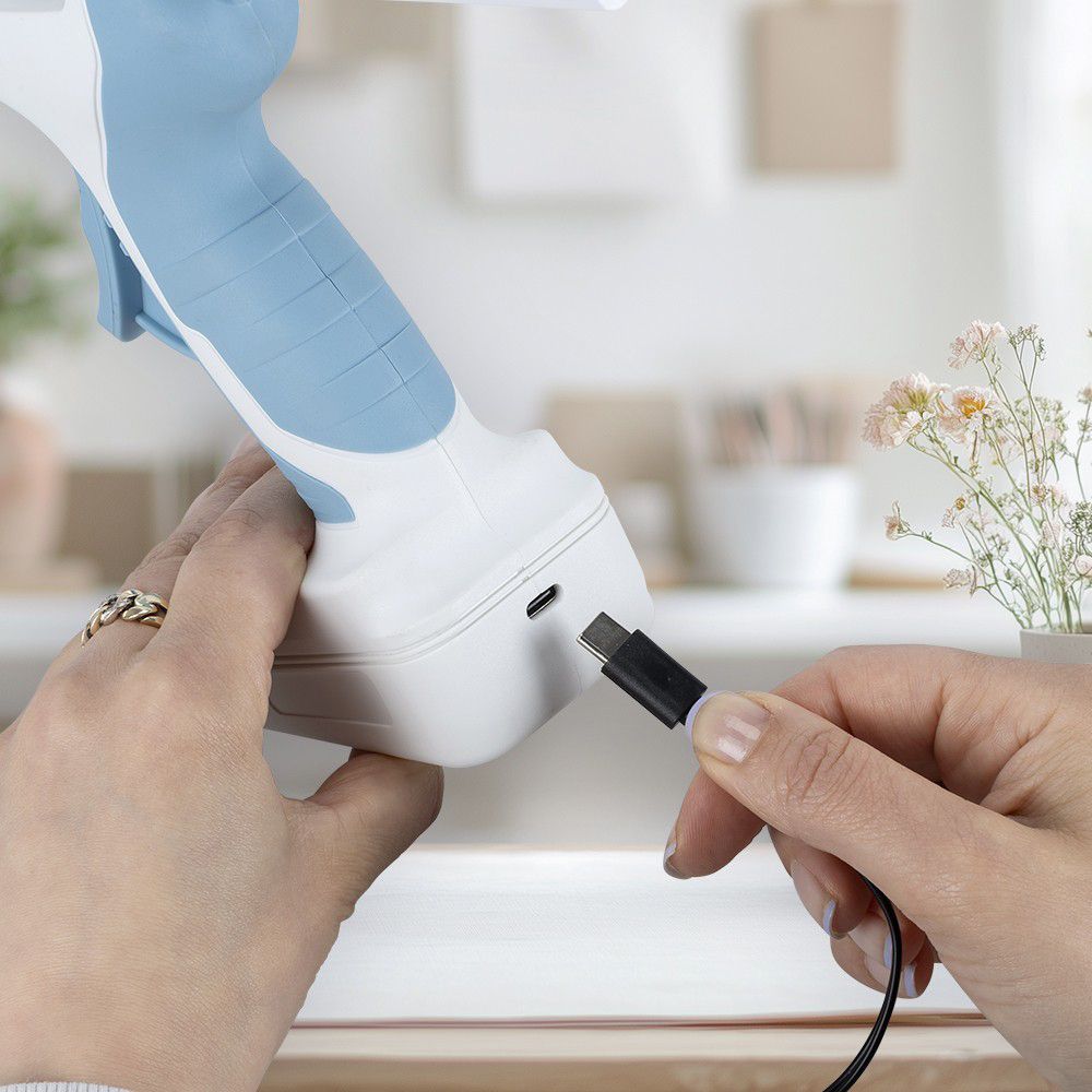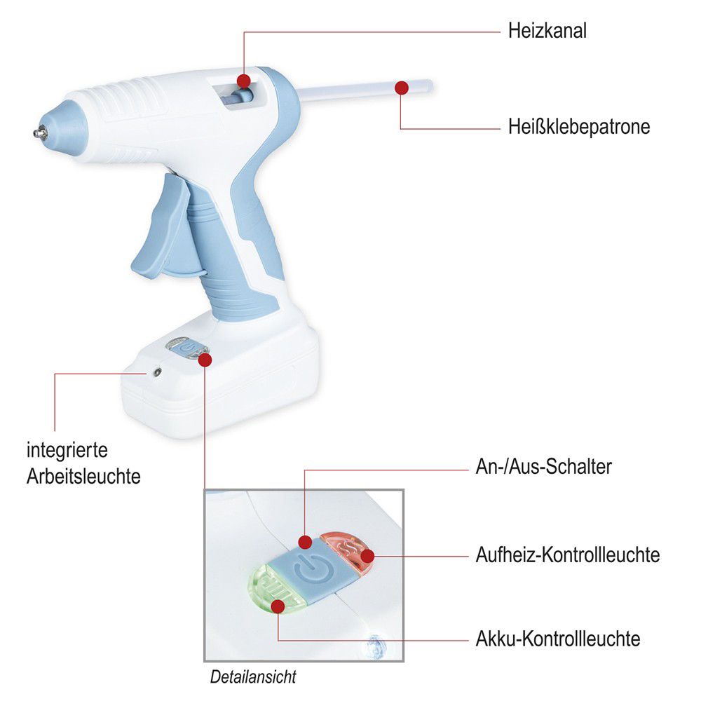 - 1 kabellose Heißklebepistole, ca. 15 cm x 5,5 cm x 17 cm, wiederaufladbar, inkl. Ladegerät, Aufheizzeit ca. 15 Sek., Schmelztemperatur ca. 175°C - 190°C, Akkulaufzeit ca. 50 - 60 min., Akkuladezeit ca. 90 min., USB-Eingang 5 V/900 mAh, Adapter Input 100-240 V/AC, Output DC 9 V/1,5 A