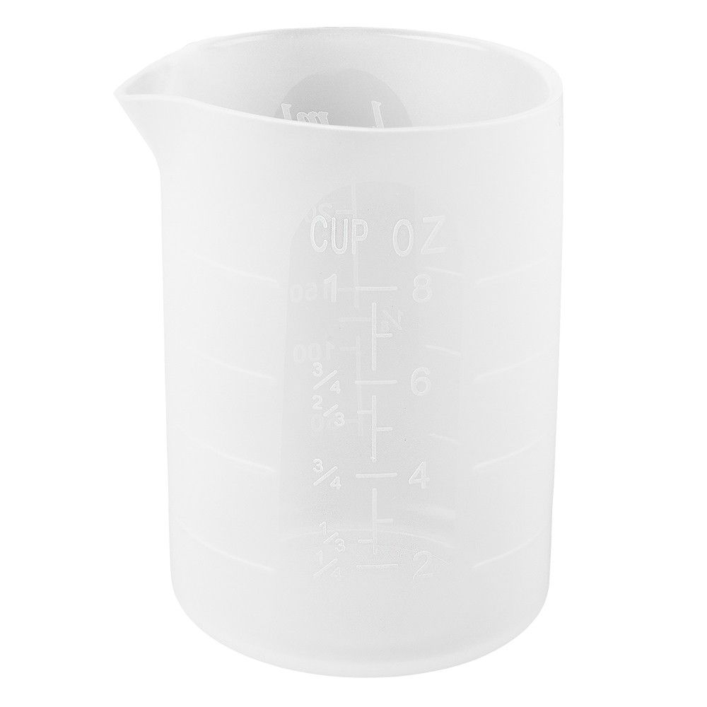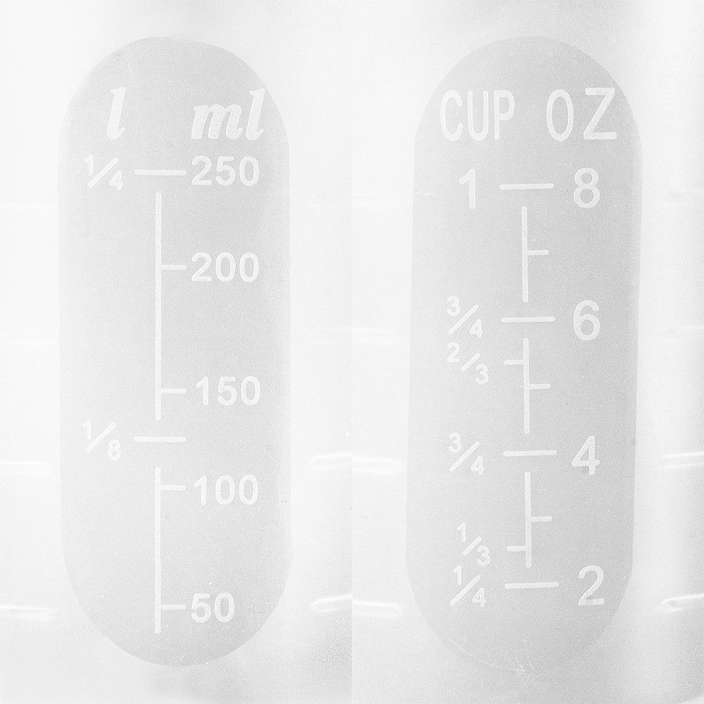 • 2 Silikon-Messbecher, antihaft, je 250 ml Fassungsvermögen, mit Ausgießer, weiß transluzent, je eine eingeprägte Skala in 50-ml-Schritten und Skala-Angaben für Liter, cu, oz