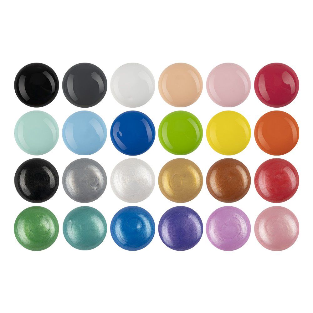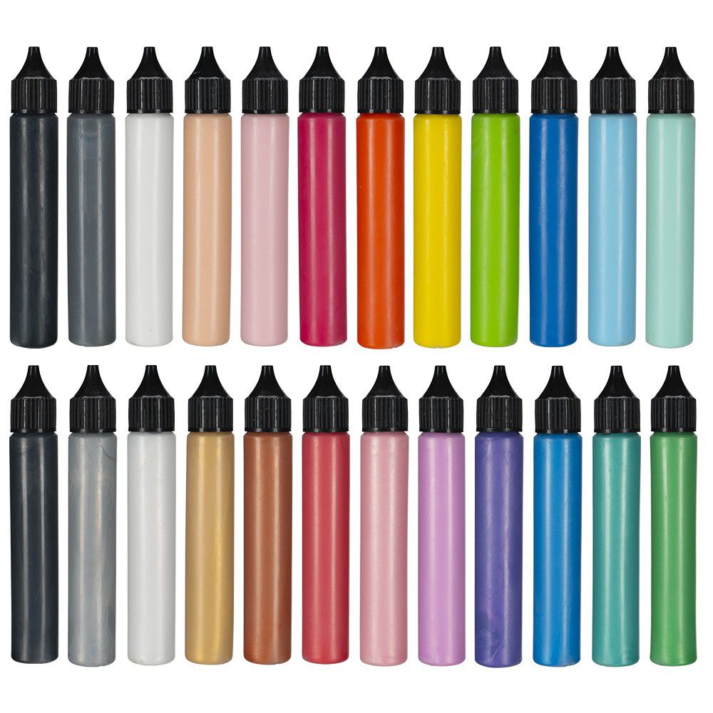 - 24 Tuben 3-D Kerzenfarben, je 30 ml: 12 klassische Farben, 3 Metallic-Farben, 9 Perlmutt-Farbe