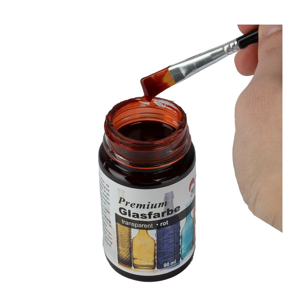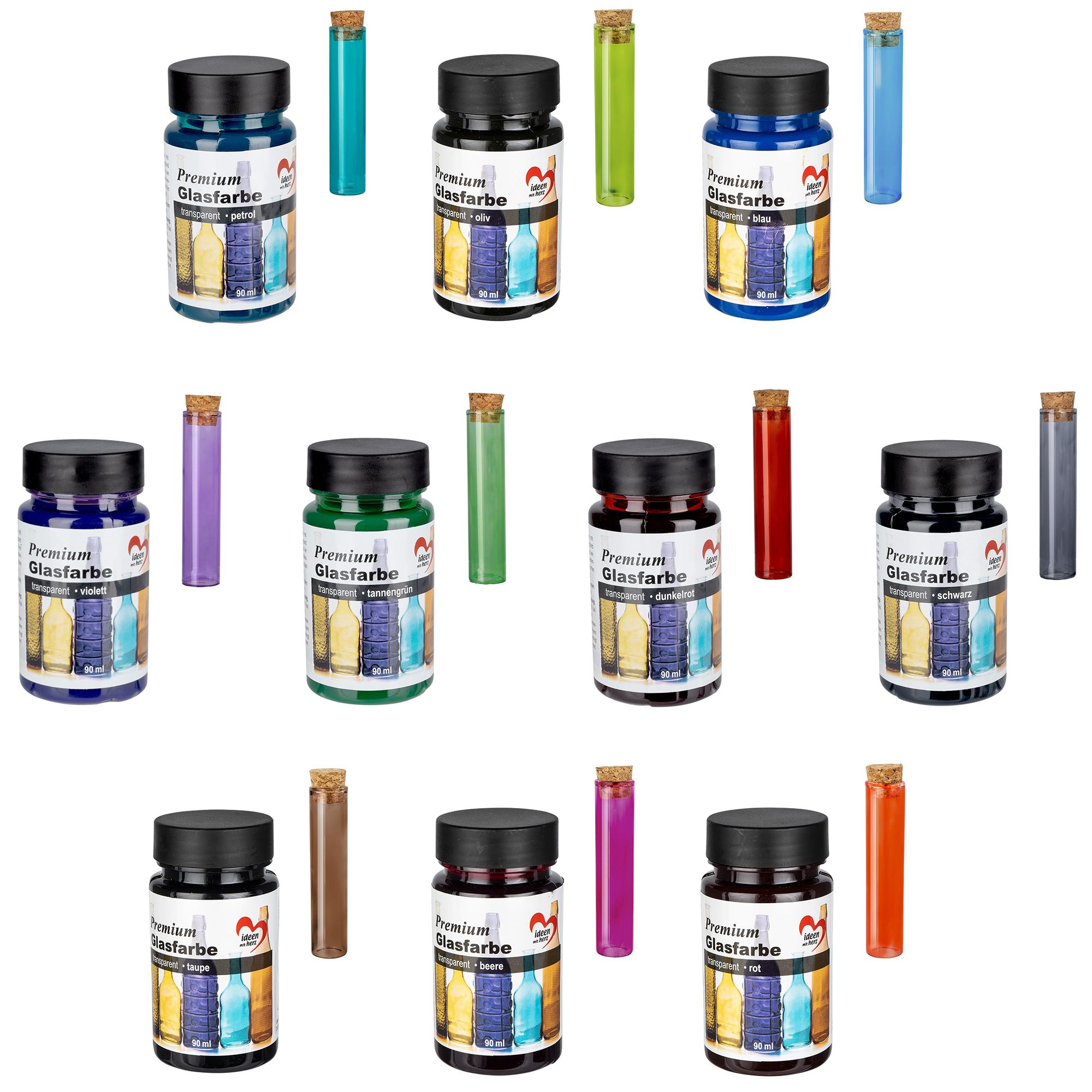 - 10 Premium-Glasfarben, transparent, verschiedene Farben, je 90 ml, Trocknungszeit je nach Schichtstärke ca. 2–3 Stunden, Gesamttrocknungszeit mind. 24 Stunden, hitzebeständige Objekte können im Ofen bei 110 °C bis 120 °C für 15 Minuten ausgehärtet werden oder 14 Tage lang bei Zimmertemperatur, danach Reinigung mit warmem Wasser möglich