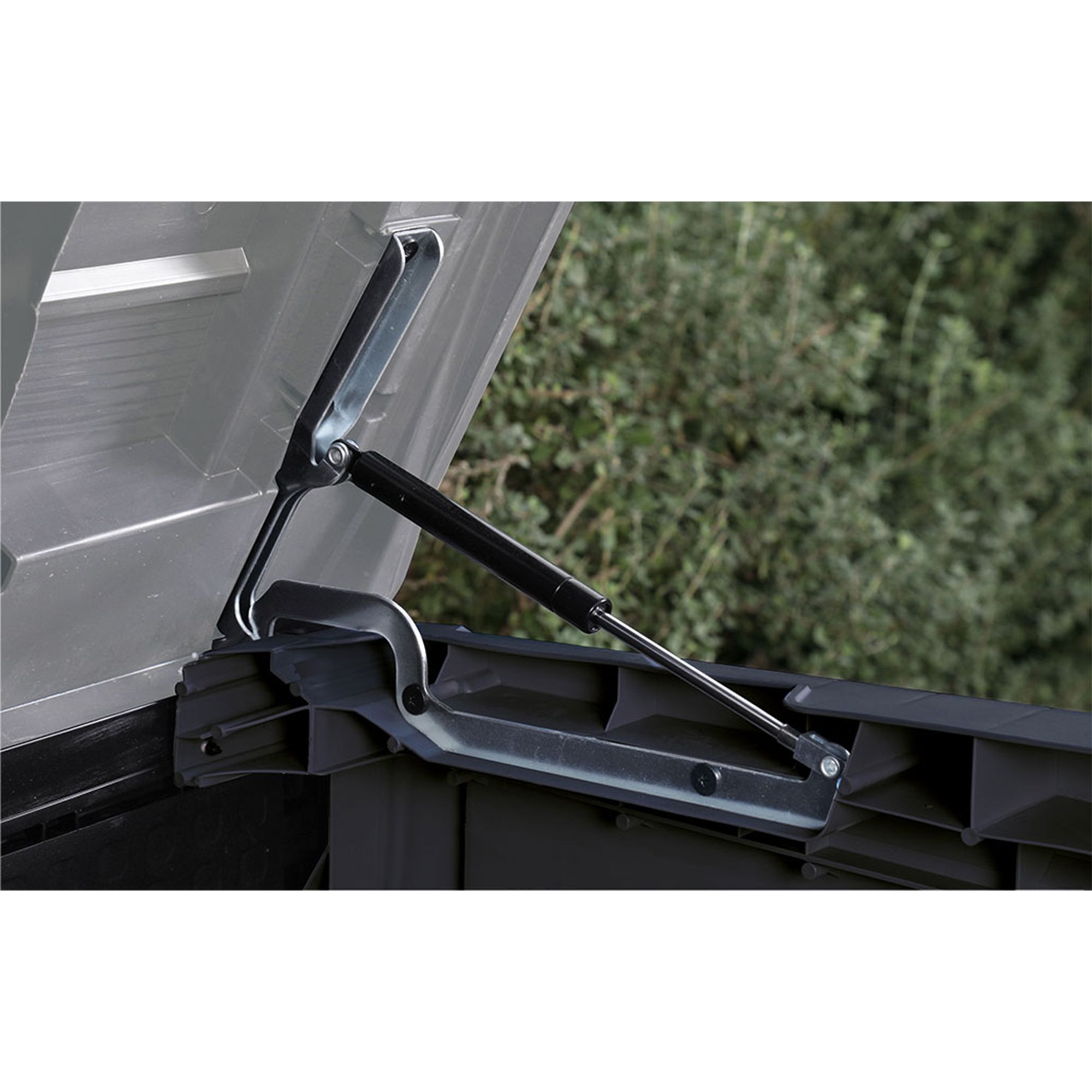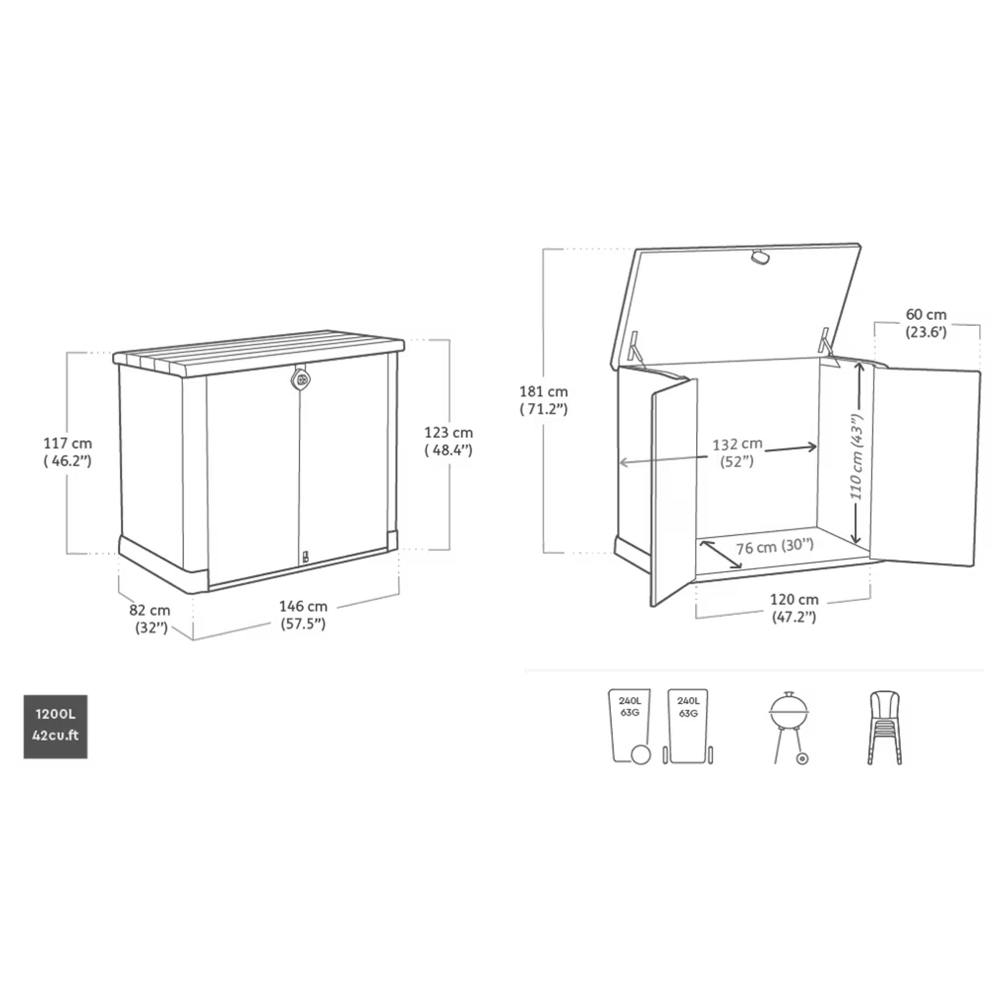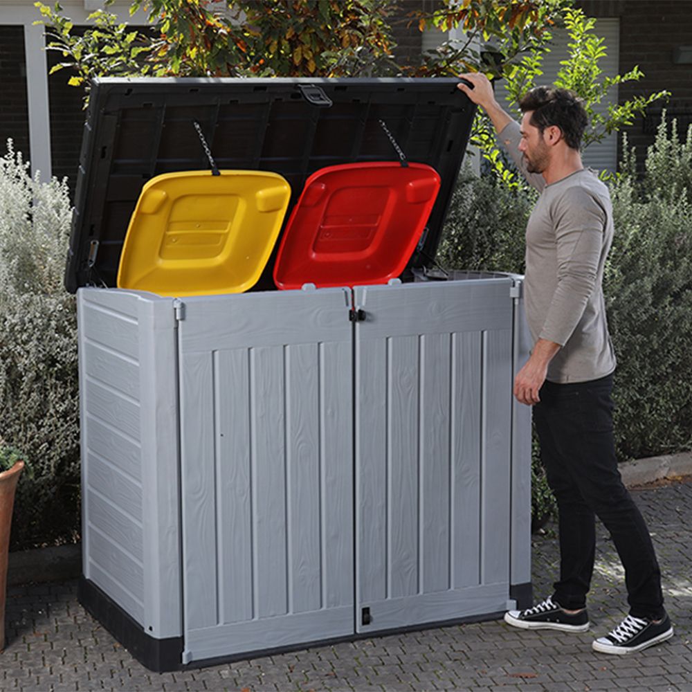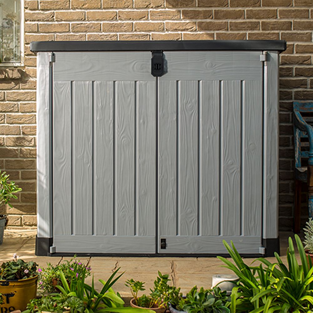 Du willst deine Gartenutensilien ordentlich unterbringen? Dafür ist dieser geräumige Store It Out Ace Gartenschrank von KETER® genau das Richtige. Mit einem Inhalt von 1200 Litern ist die Aufbewahrungsbox dazu geeignet, Gartenwerkzeug, Grillzubehör oder Gartenkissen ordentlich zu verstauen. Außerdem bietet die Gartenbox Platz für 2 Mülltonnen mit jeweils max. 240 Litern.