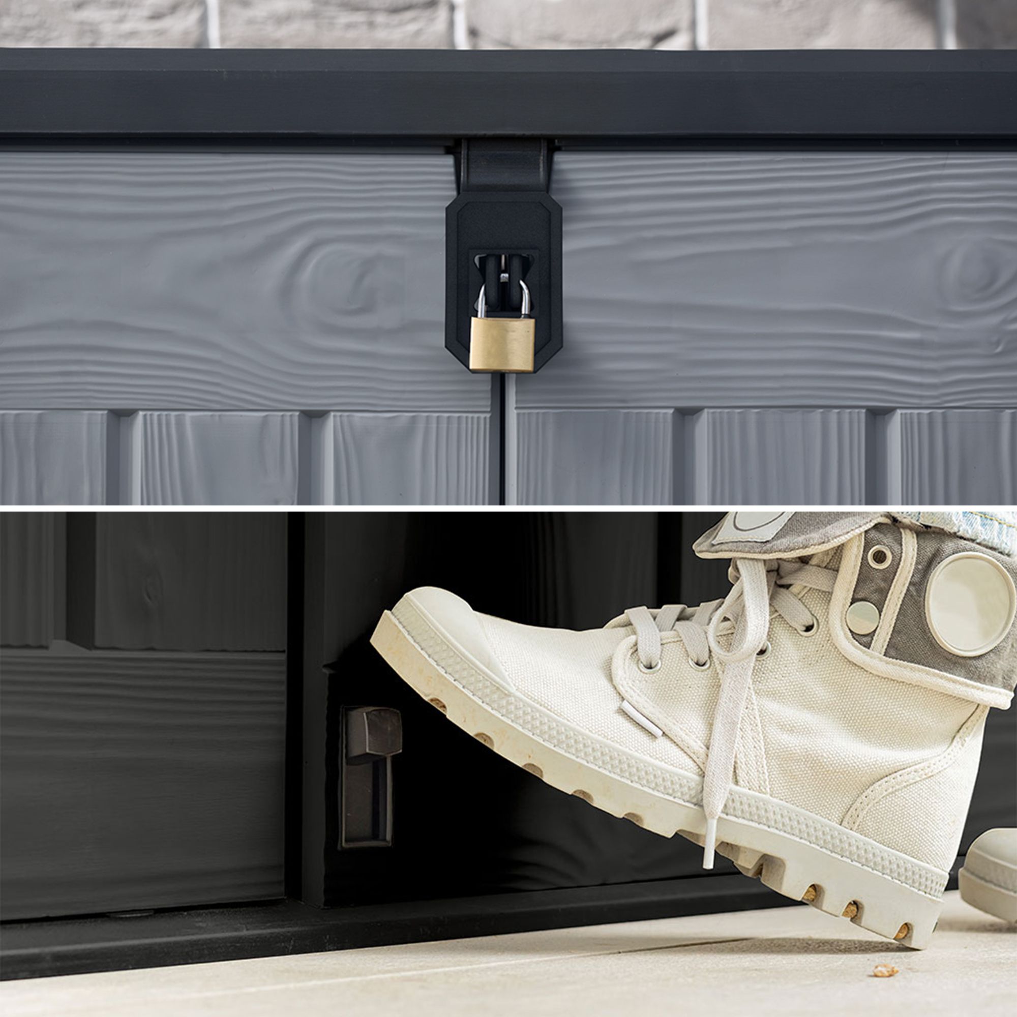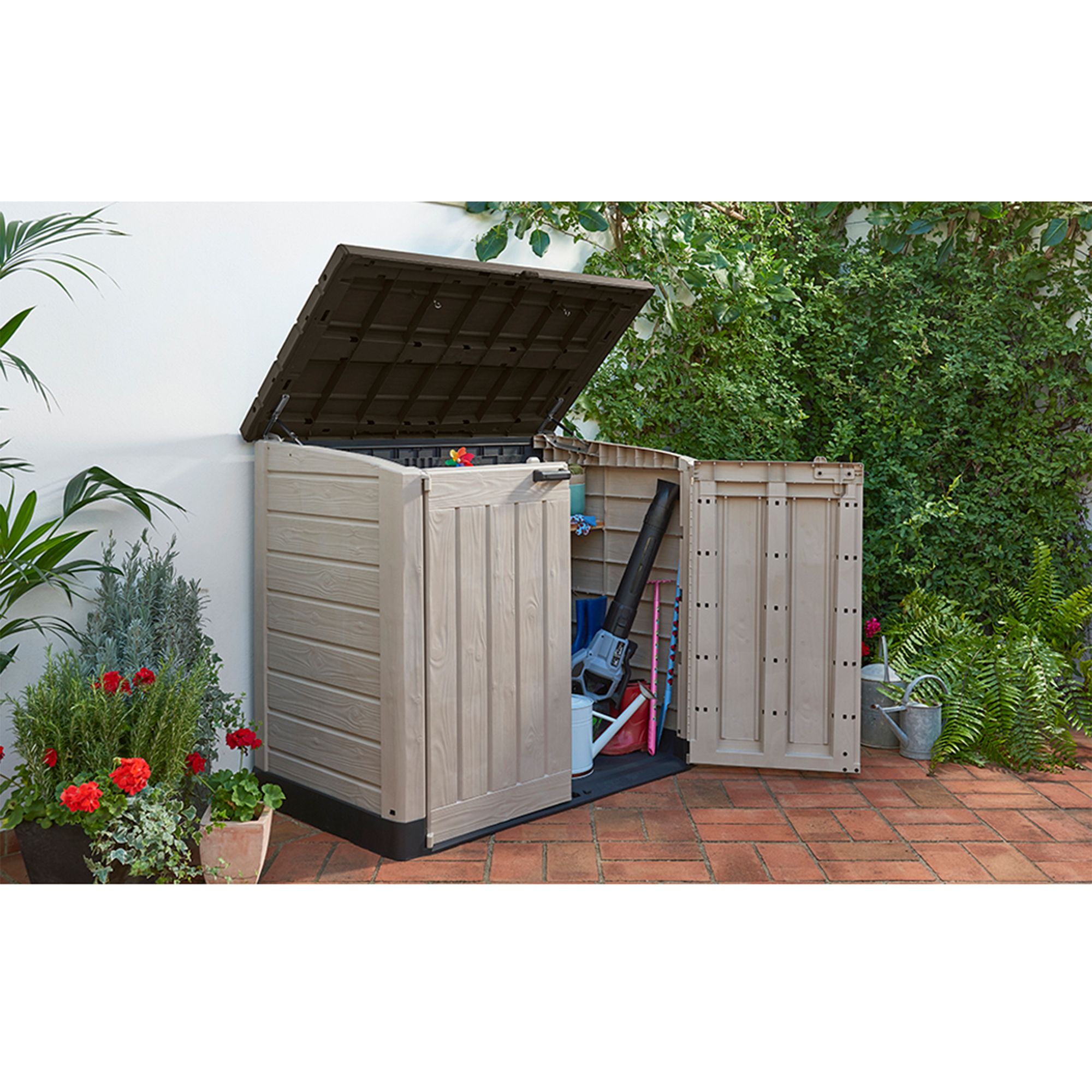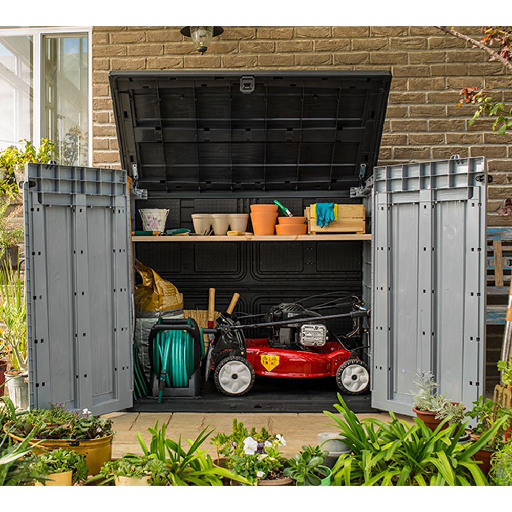 Du willst deine Gartenutensilien ordentlich unterbringen? Dafür ist dieser geräumige Store It Out Ace Gartenschrank von KETER® genau das Richtige. Mit einem Inhalt von 1200 Litern ist die Aufbewahrungsbox dazu geeignet, Gartenwerkzeug, Grillzubehör oder Gartenkissen ordentlich zu verstauen. Außerdem bietet die Gartenbox Platz für 2 Mülltonnen mit jeweils max. 240 Litern.