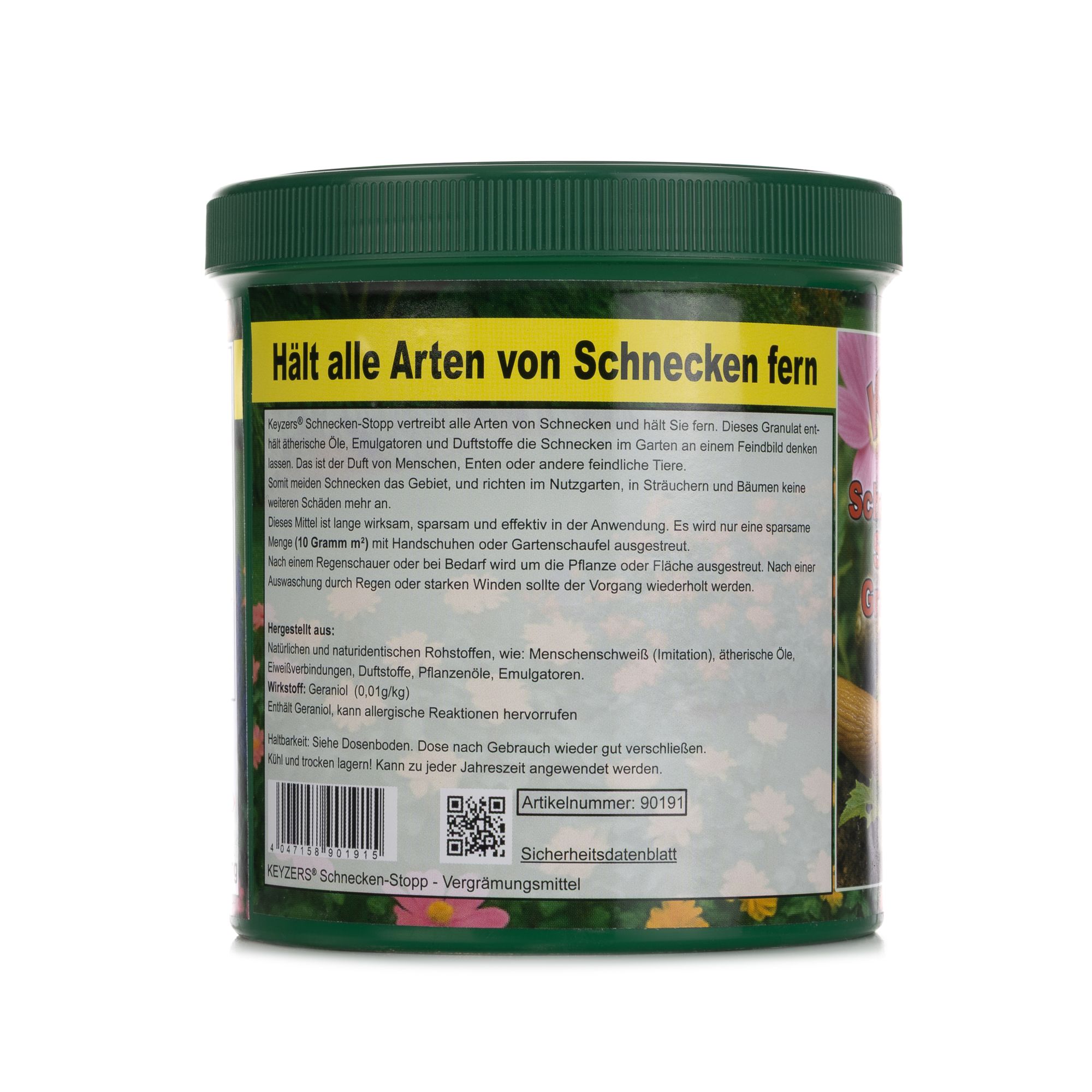 Schnecken-Stopp von KEYZERS® vertreibt alle Arten von Schnecken und hält Sie fern. Er wirkt wie eine Barriere gegen Schnecken - durch den extremen Geruch und die Granulat-Körnung trauen sich die Schnecken nicht, diese zu überwinden. Somit meiden Schnecken das Gebiet und richten im Nutzgarten, in Sträuchern und Bäumen keine weiteren Schäden mehr an.
