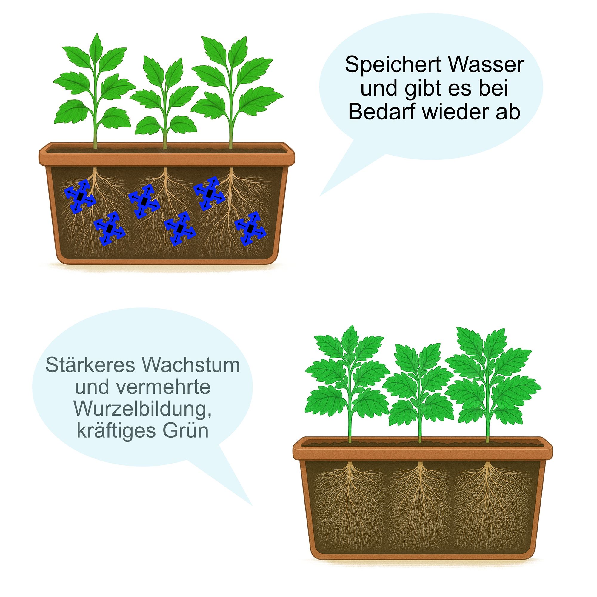 • verbessert die Wasserspeicherfähigkeit des Bodens