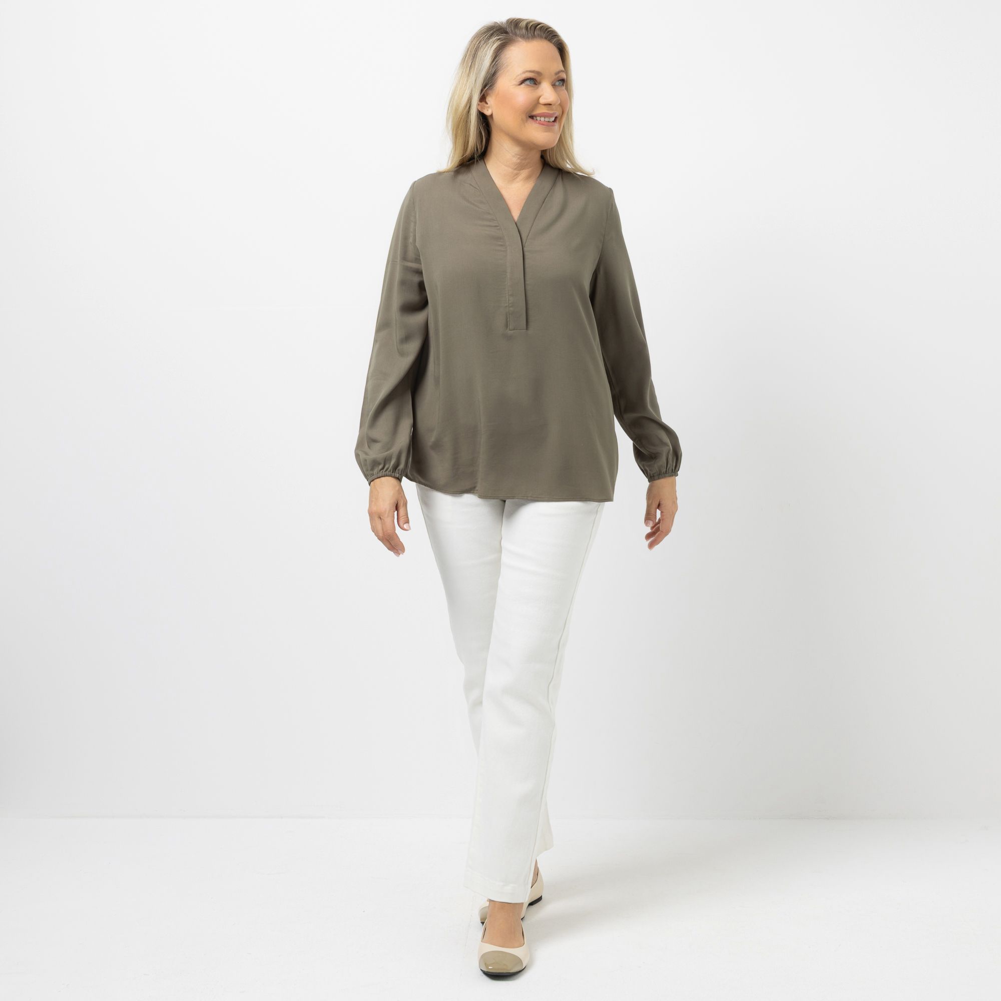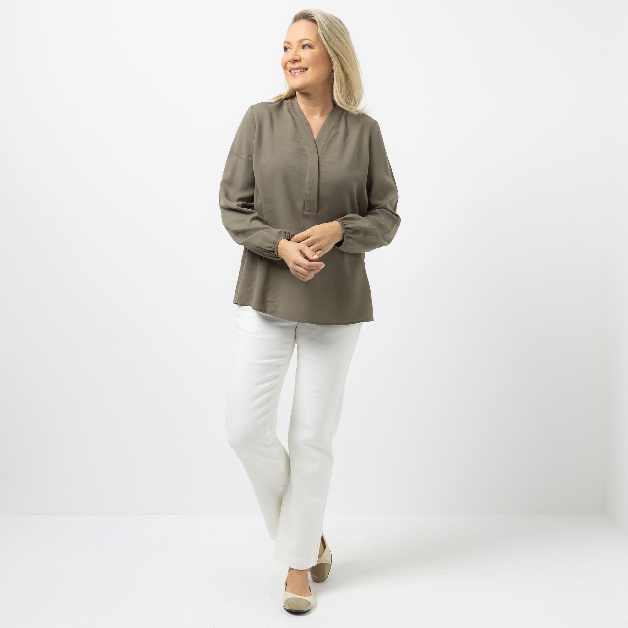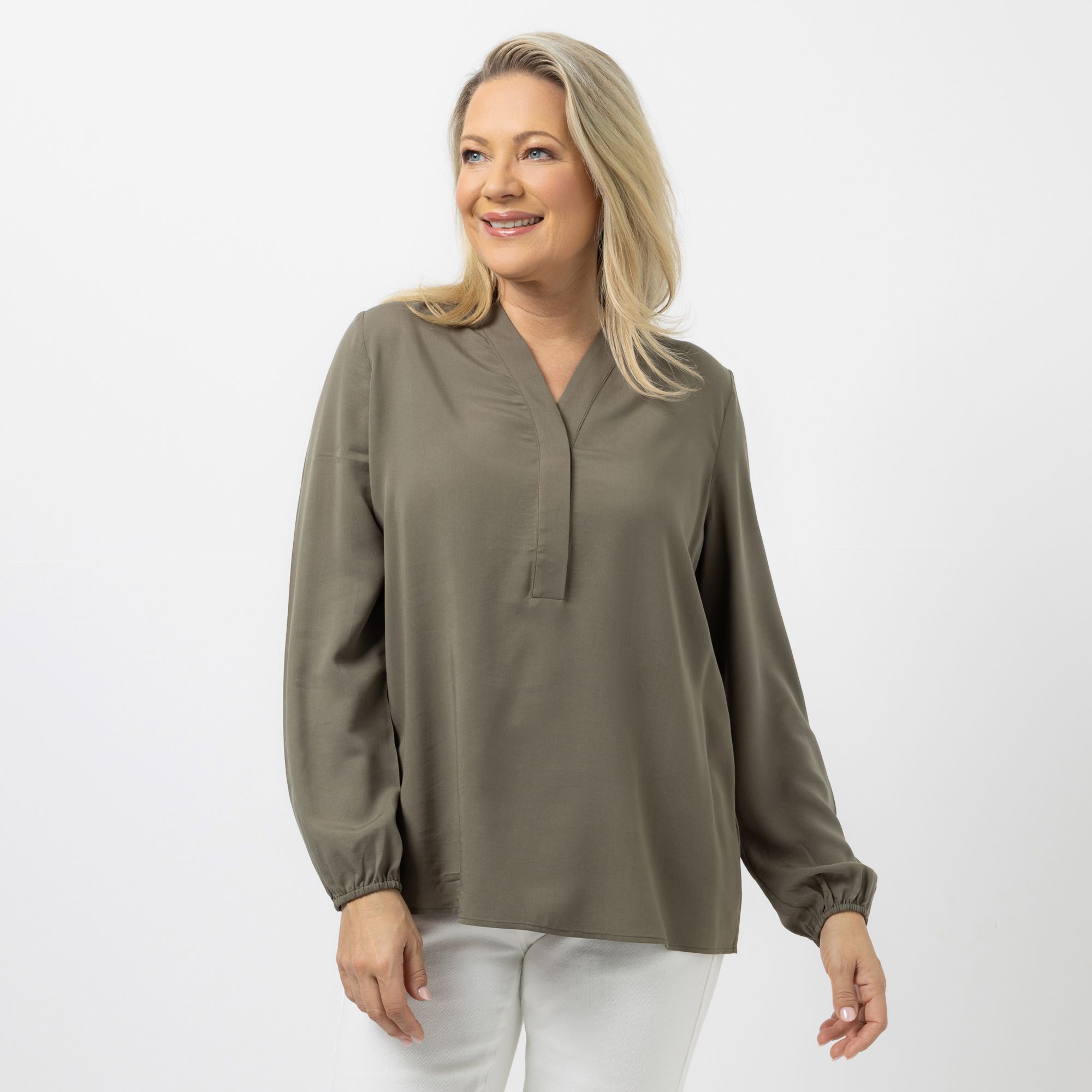 Entspannt spüren: Darin siehst du gut aus! Die KILIAN KERNER SENSES Bluse umspielt die Figur. Sie hat einen V-Ausschnitt, lange Ärmel und trägt sich hautfreundlich dank des hohen Viskoseanteils.