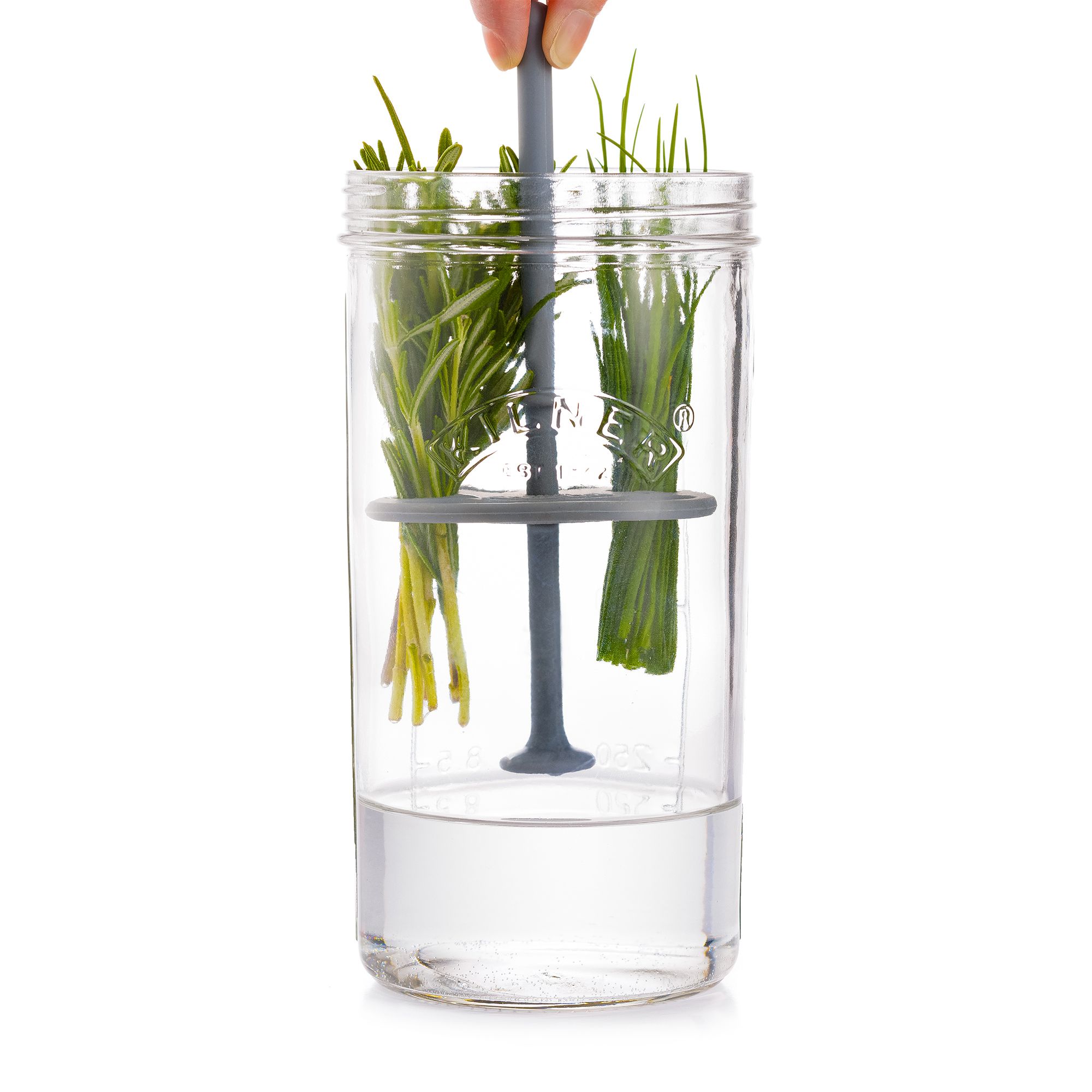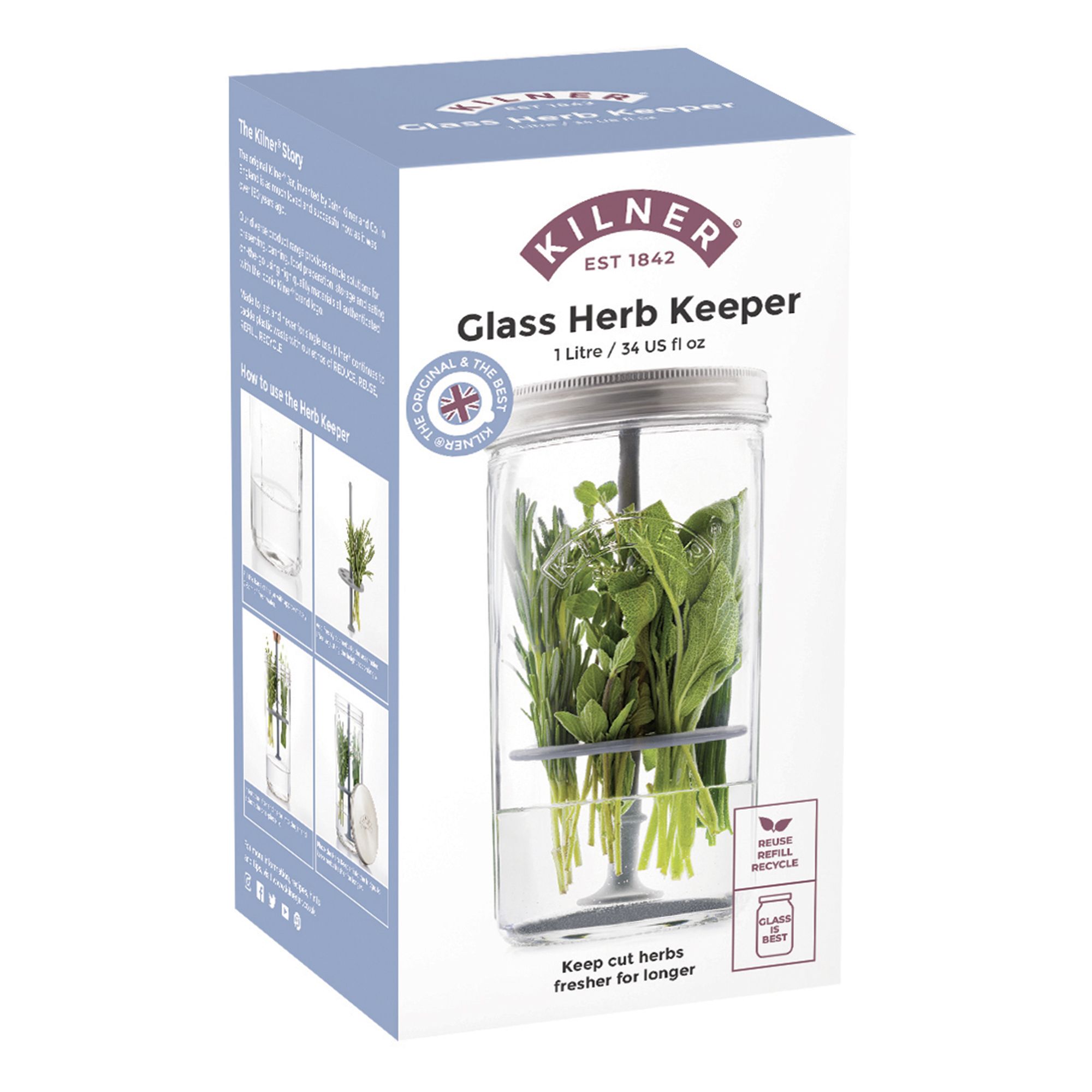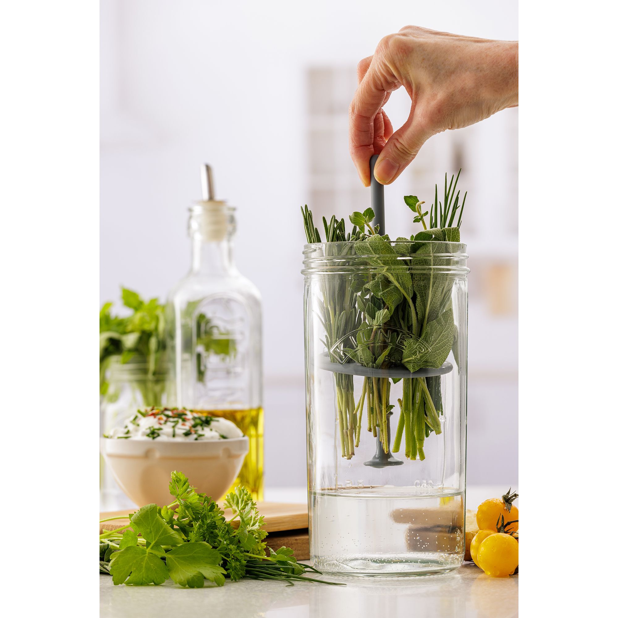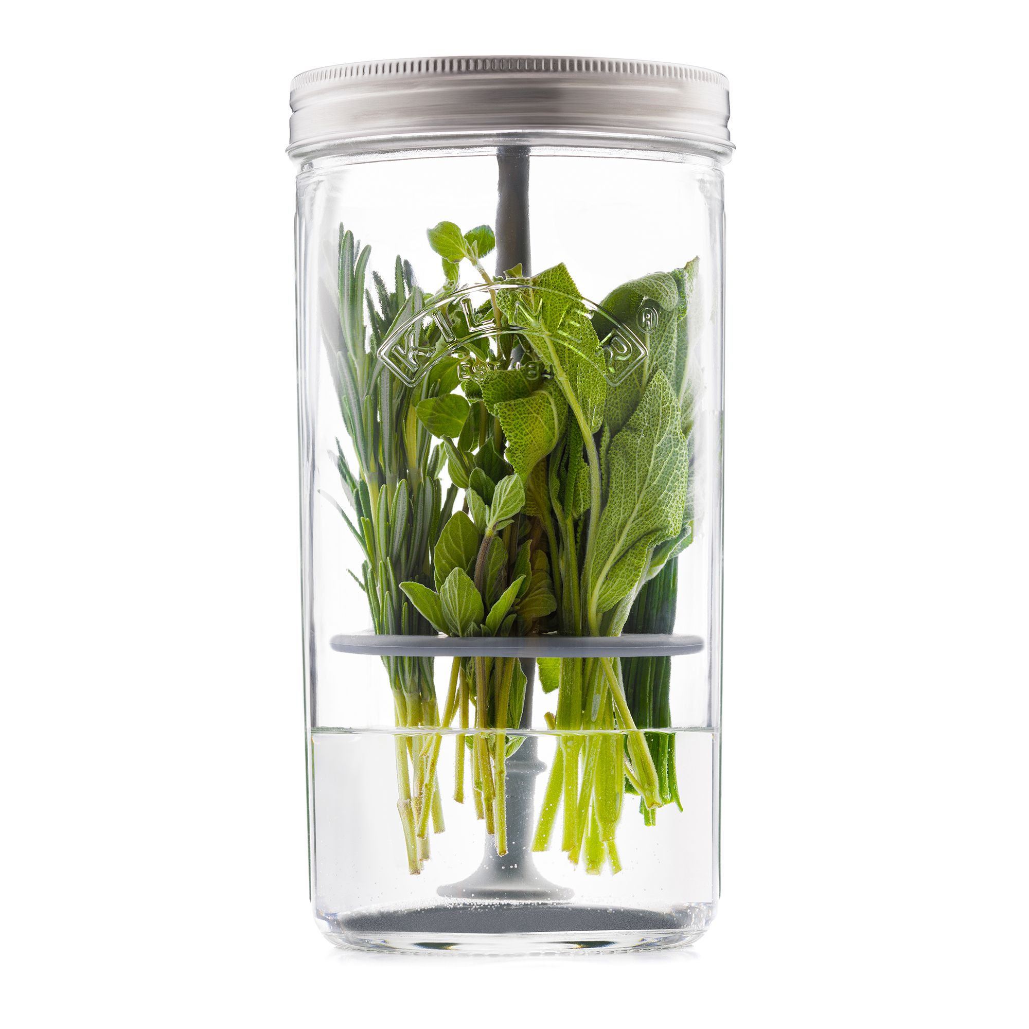 Halte selbst angebaute oder gekaufte Kräuter länger frisch – mit diesem Herb Keeper Set von Kilner®! Gestielte Kräuter wie Basilikum, Petersilie, Minze und Koriander halten sich länger, wenn sie in einem Behälter mit den Stängeln in Wasser aufbewahrt werden. Das einzigartige Design umfasst einen Silikonstab und eine runde Scheibe mit unterschiedlich großen Löchern, um eine Vielzahl von Kräuterstängeln aufzunehmen und aufrechtzuhalten.