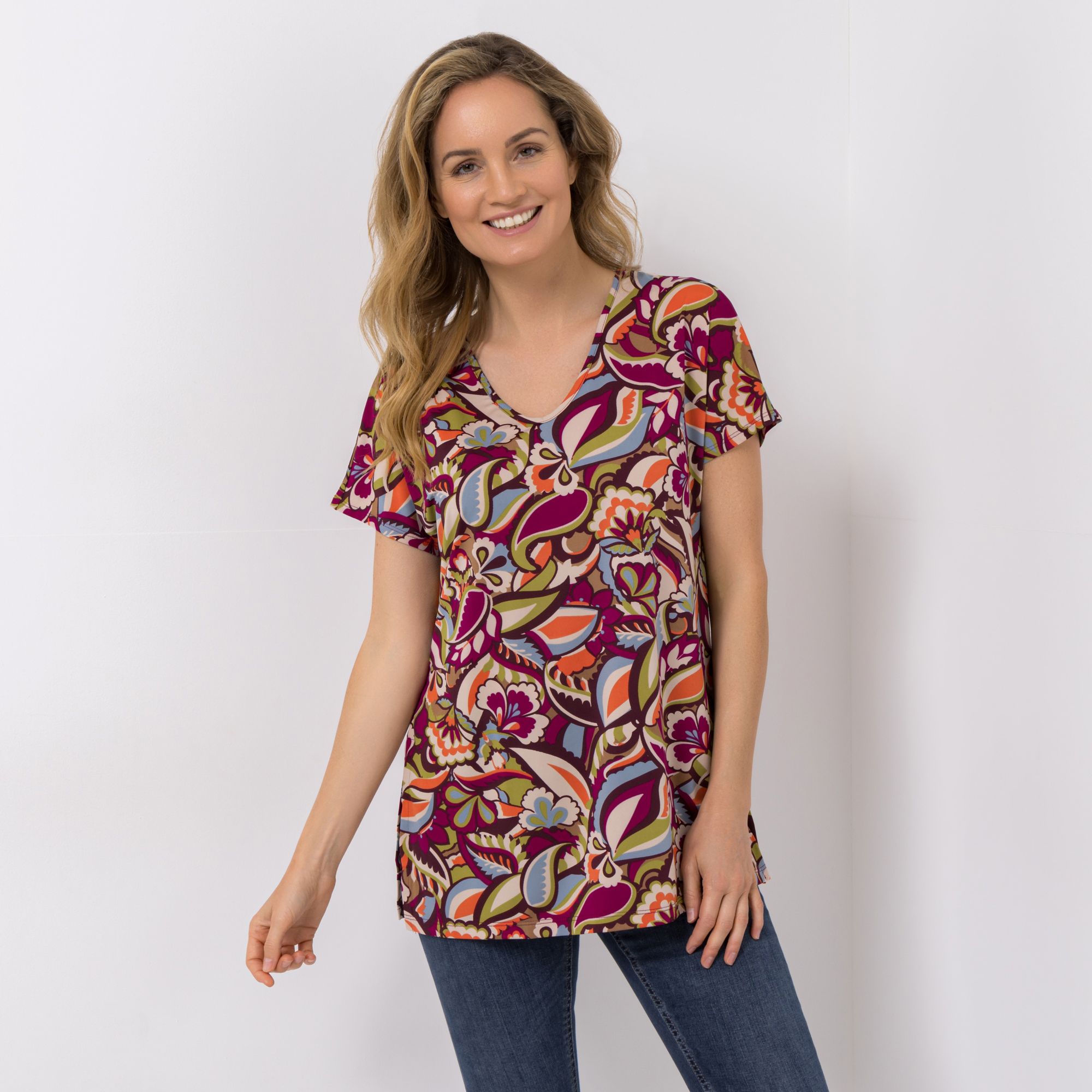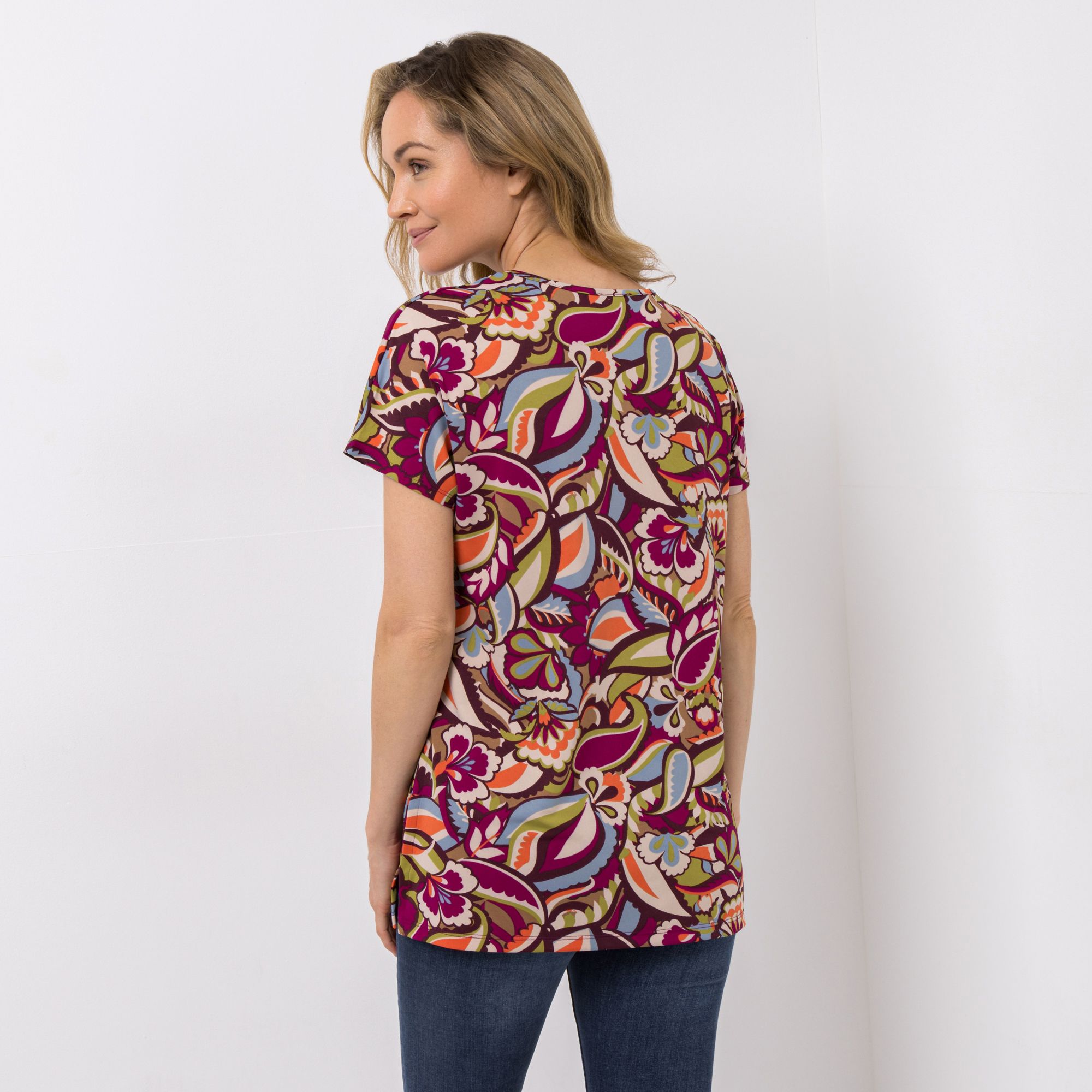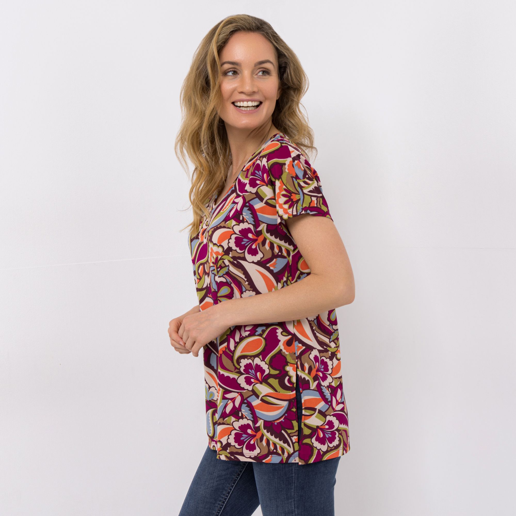 Luftiger Chic ist hier das Motto: Das KIM & CO. Shirt hat Dolman-Ärmel in halber Länge und ist seitlich geschlitzt. Es ist komplett bedruckt und hat einen V-Ausschnitt.