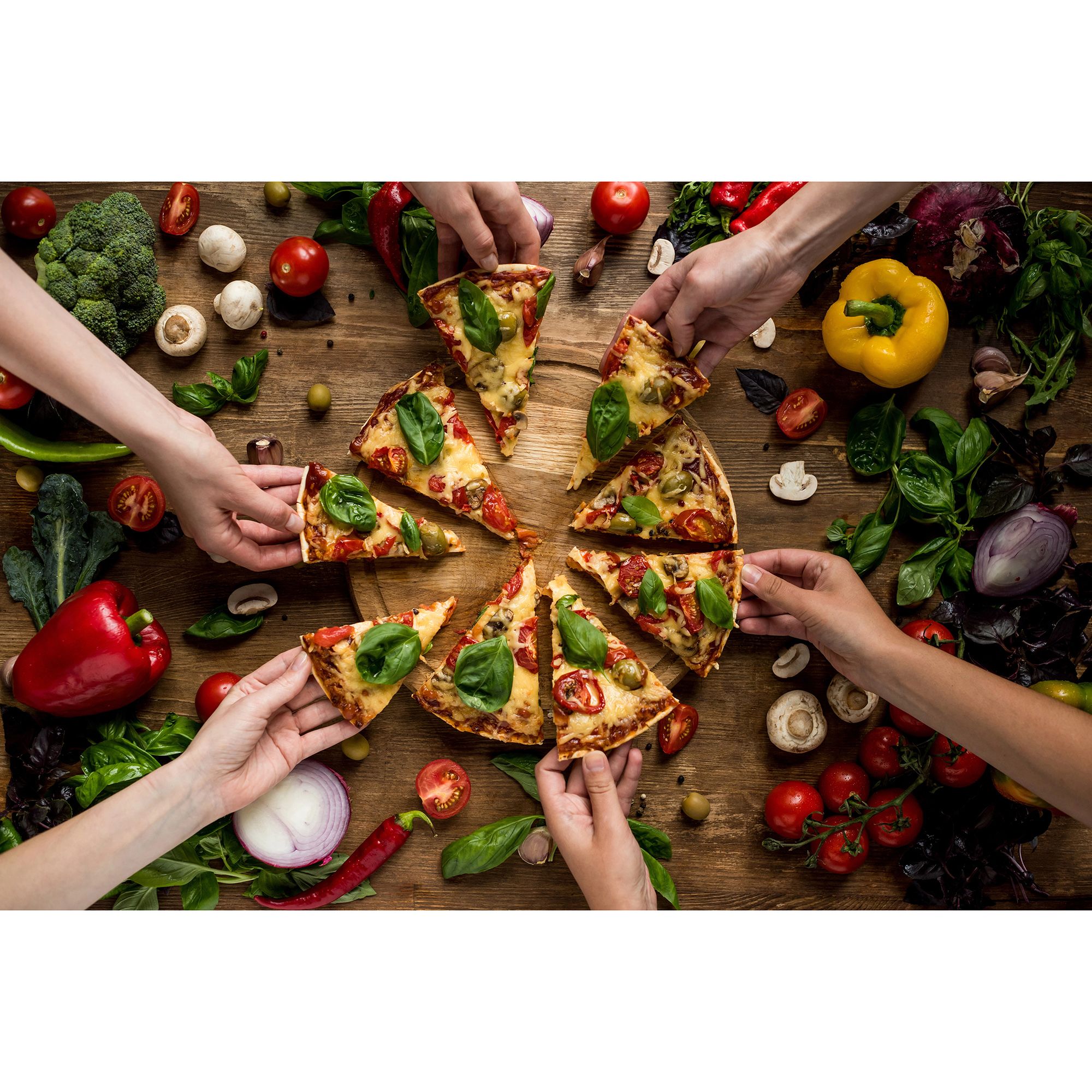 - Den Teig auf der leicht bemehlten Arbeitsfläche auf die benötigte Größe ausrollen, nach Wunsch belegen, und in die Heißluftfritteuse geben (200° C, Backzeit: ca. 15 Min)