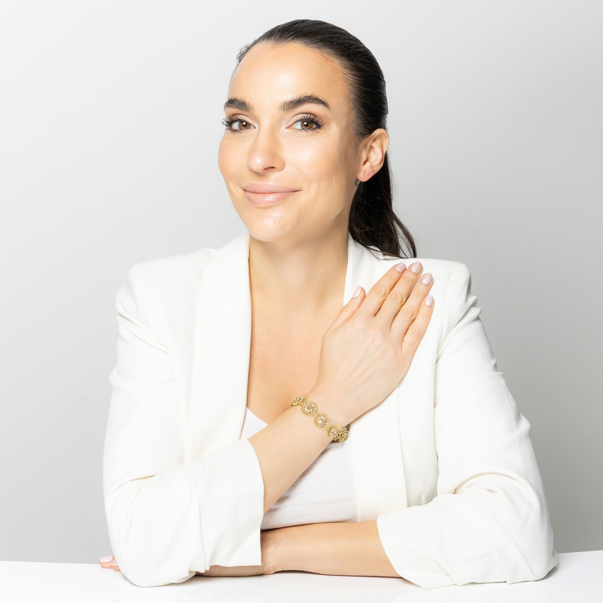 Das Armband von KONPLOTT bringt handgeformte Blüten und funkelnde Glassteine direkt an dein Handgelenk