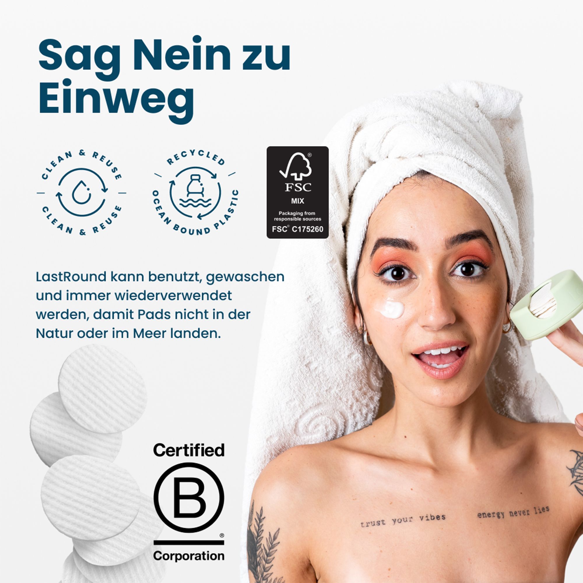LASTOBJECT verbindet durchdachte Nachhaltigkeit mit cleverem Design: Die LastRound Pads kommen in einer praktischen Box aus recyceltem Meeresplastik und bieten dir eine umweltfreundliche Alternative zu klassischen Wattepads.