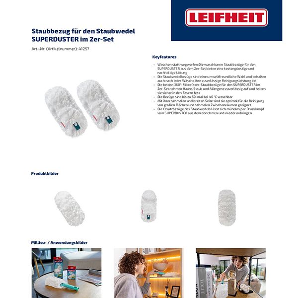 Mit LEIFHEIT setzt du auf zuverlässige Sauberkeit und nachhaltige Reinigung! Die beiden waschbaren Ersatz-Staubbezüge für deinen Superduster umschließen Schmutz und halten Staub, Haare sowie Allergene sicher fest. So kannst du sorglos durchatmen. Die Druckknopf-Befestigung sorgt für einen unkomplizierten Wechsel nach jedem Einsatz.