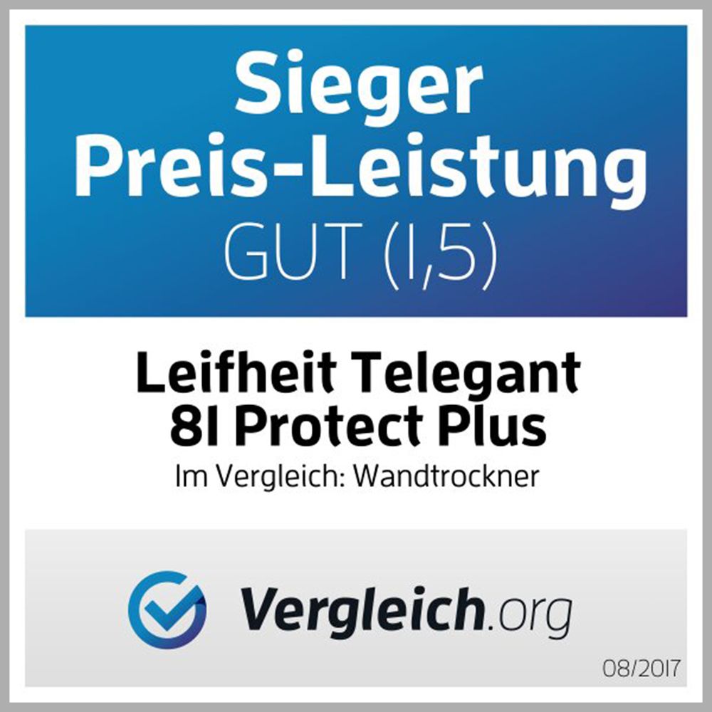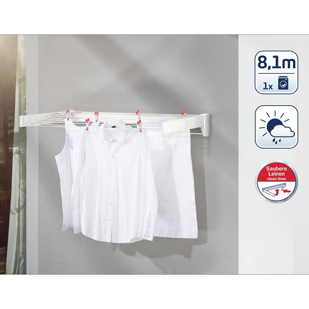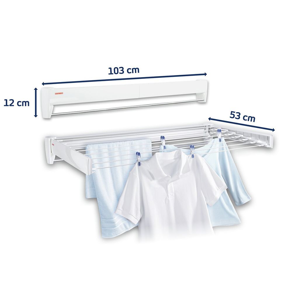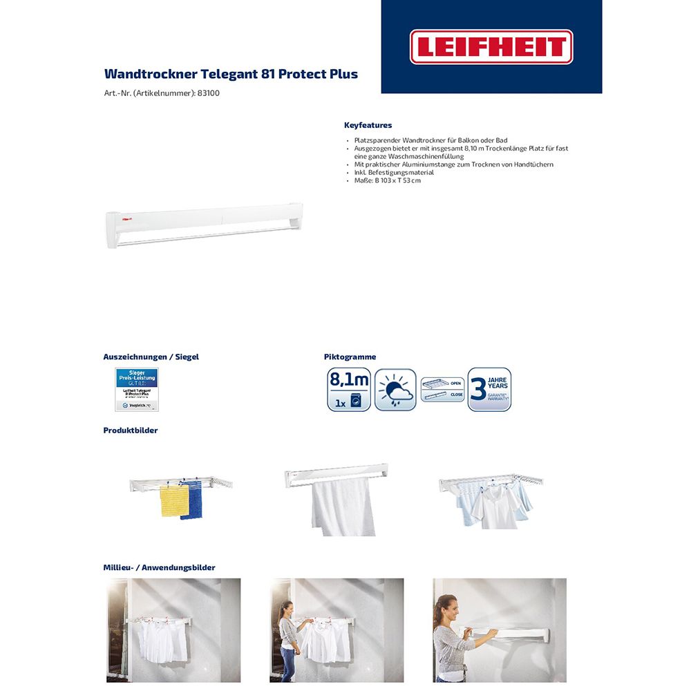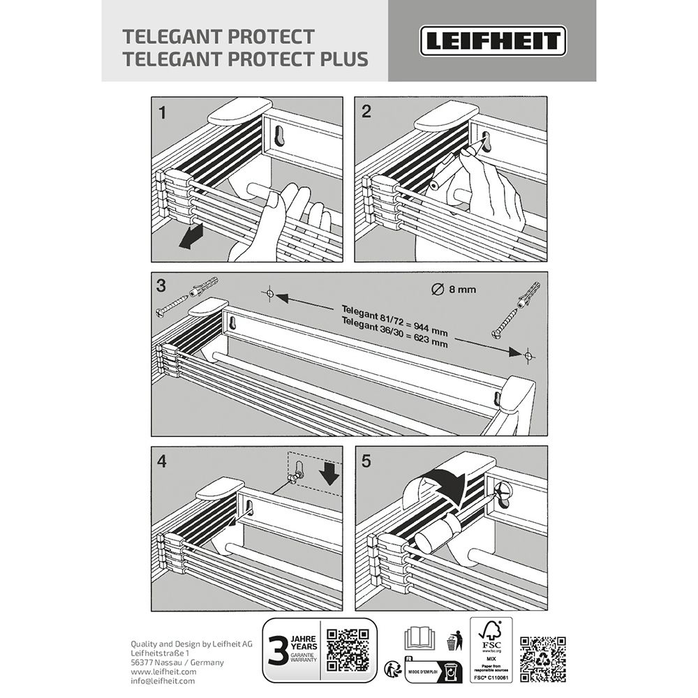 Einfach funktionell, einfach stilvoll: Der LEIFHEIT Wandtrockner Telegant 81 Protect Plus überzeugt als dezenter Handtuchhalter und bietet dir bei Bedarf reichlich Platz für deine Wäsche. Im geschlossenen Zustand sorgt eine Aluminium-Handtuchstange für eine elegante Optik, während acht Trockenstäbe mit je ca. 90 cm Länge im Handumdrehen eine fast komplette Waschmaschinenladung aufnehmen. Die Montage an der Wand gelingt mühelos und die besonders robusten, rostgeschützten Trockenstäbe machen das Trocknen dauerhaft komfortabel.