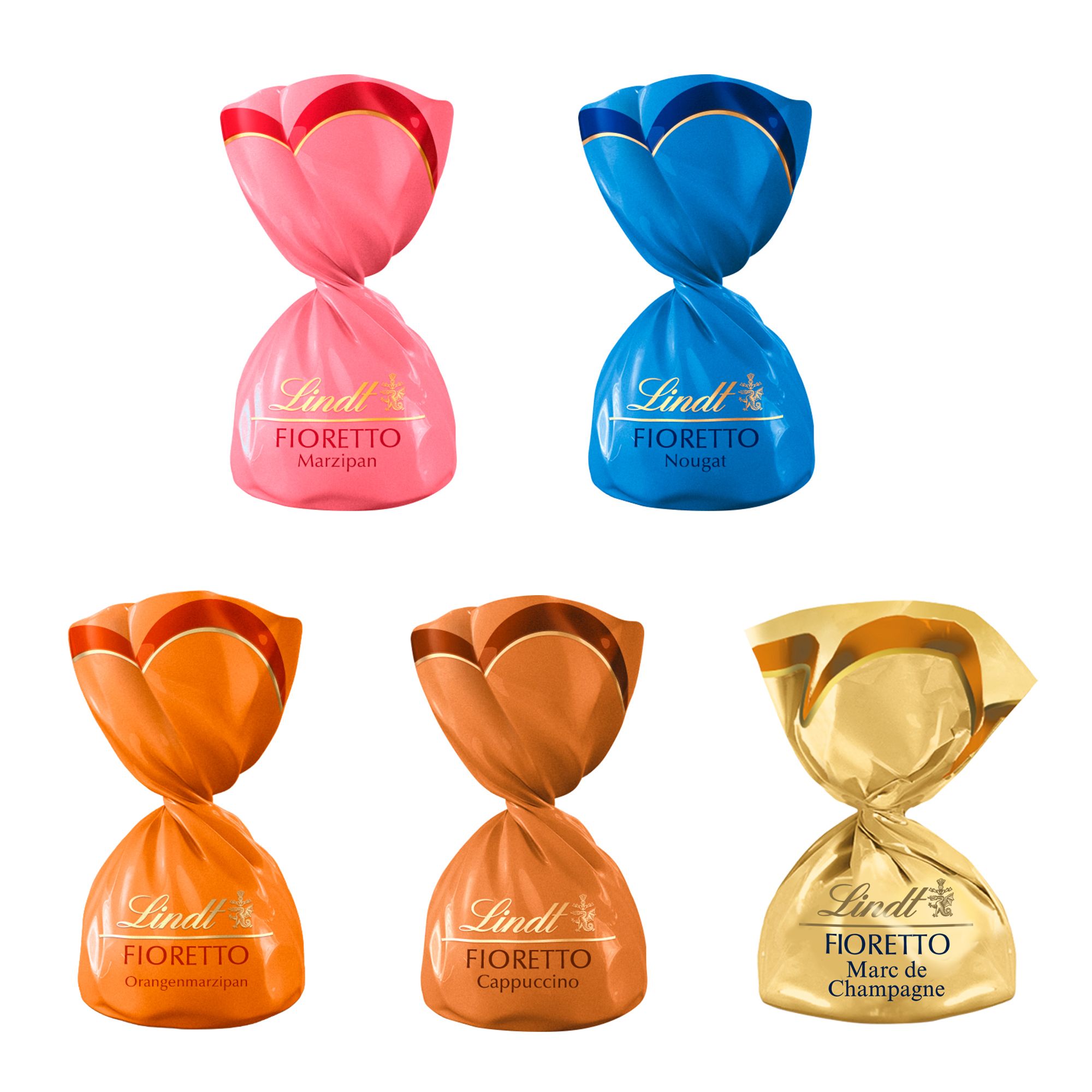 - gemischter Beutel mit je 12 x Mini-Nougat Fioretto, 11 x Mini-Orange Marzipan Fioretto, 11 x Mini-Cappuccino Fioretto und 11 x Mini-Marzipan Fioretto