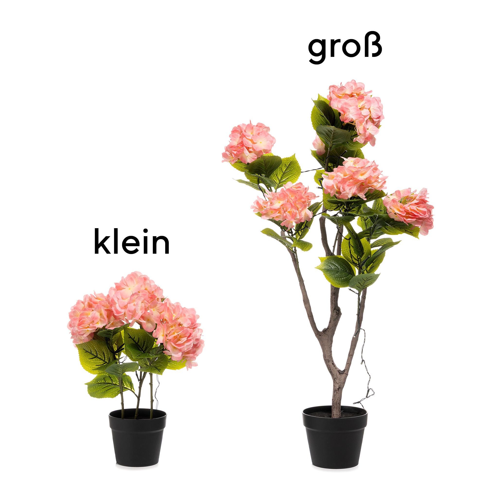 Diese Schönheiten stehen dir zur Wahl: eine Rose mit rosa oder roten Blüten und eine blau oder rosa blühende Hortensie. Dass es sich bei beiden Varianten um Kunstpflanzen handelt, ist kaum zu sehen und auch nicht zu fühlen. Die Blüten haben einen Realtouch-Effekt, der sie sich verblüffend echt anfühlen lässt.