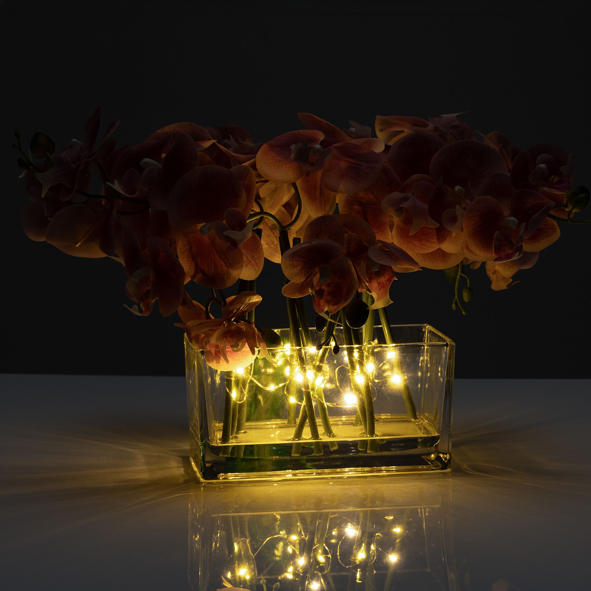 LUMIDA Flora bringt charmante Phalaenopsis-Stiele und eine klare Glasvase zusammen, ergänzt von warmweißen LEDs und Timerfunktion – so entsteht eine einladende Lichtdekoration, die jeden Raum mit zarter Eleganz bereichert.