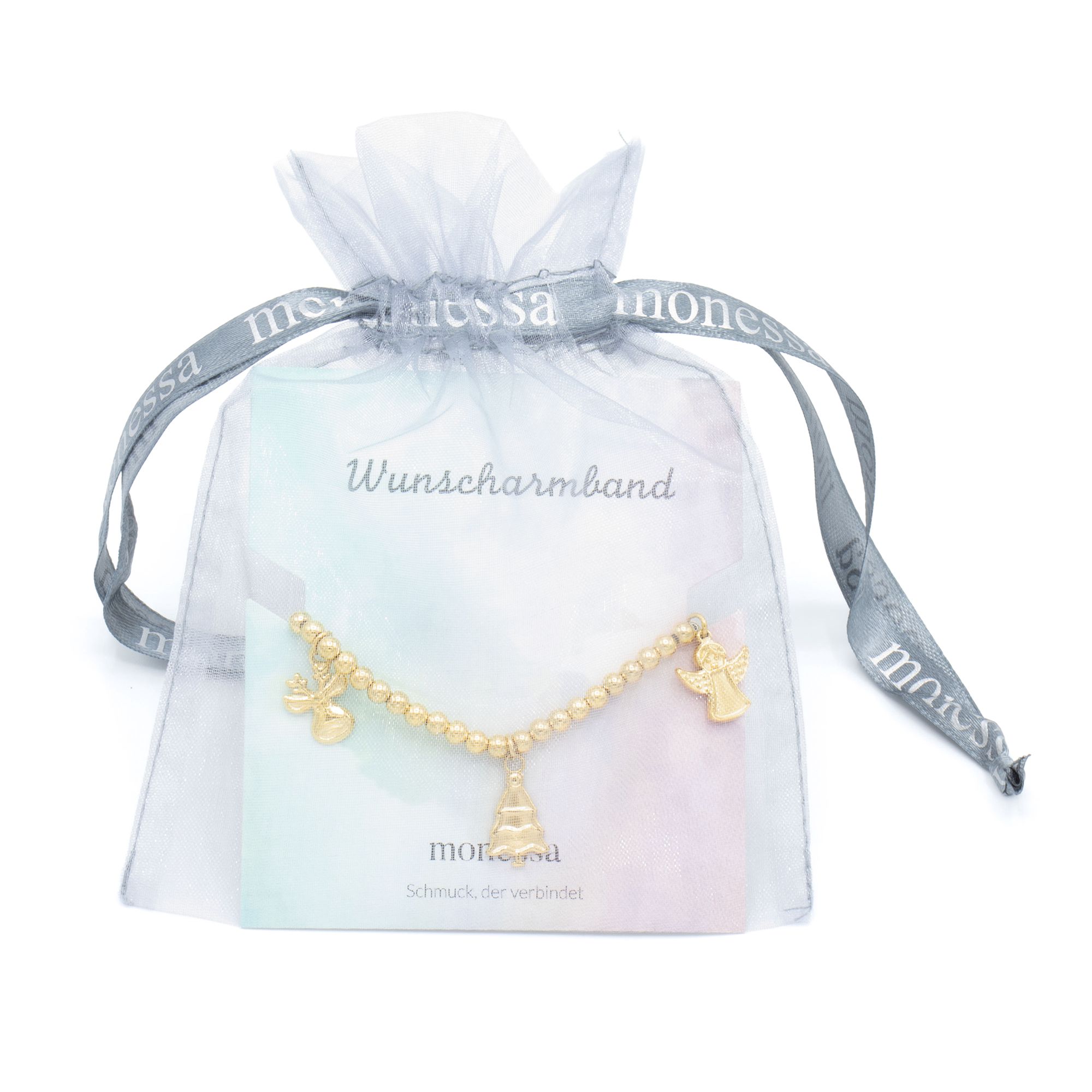 Mit liebevoll gestalteten Charms wie Engel, Zuckerstangen, Weihnachtsbaum und Rentier bringt das flexible Armband von MONESSA festlichen Zauber an dein Handgelenk